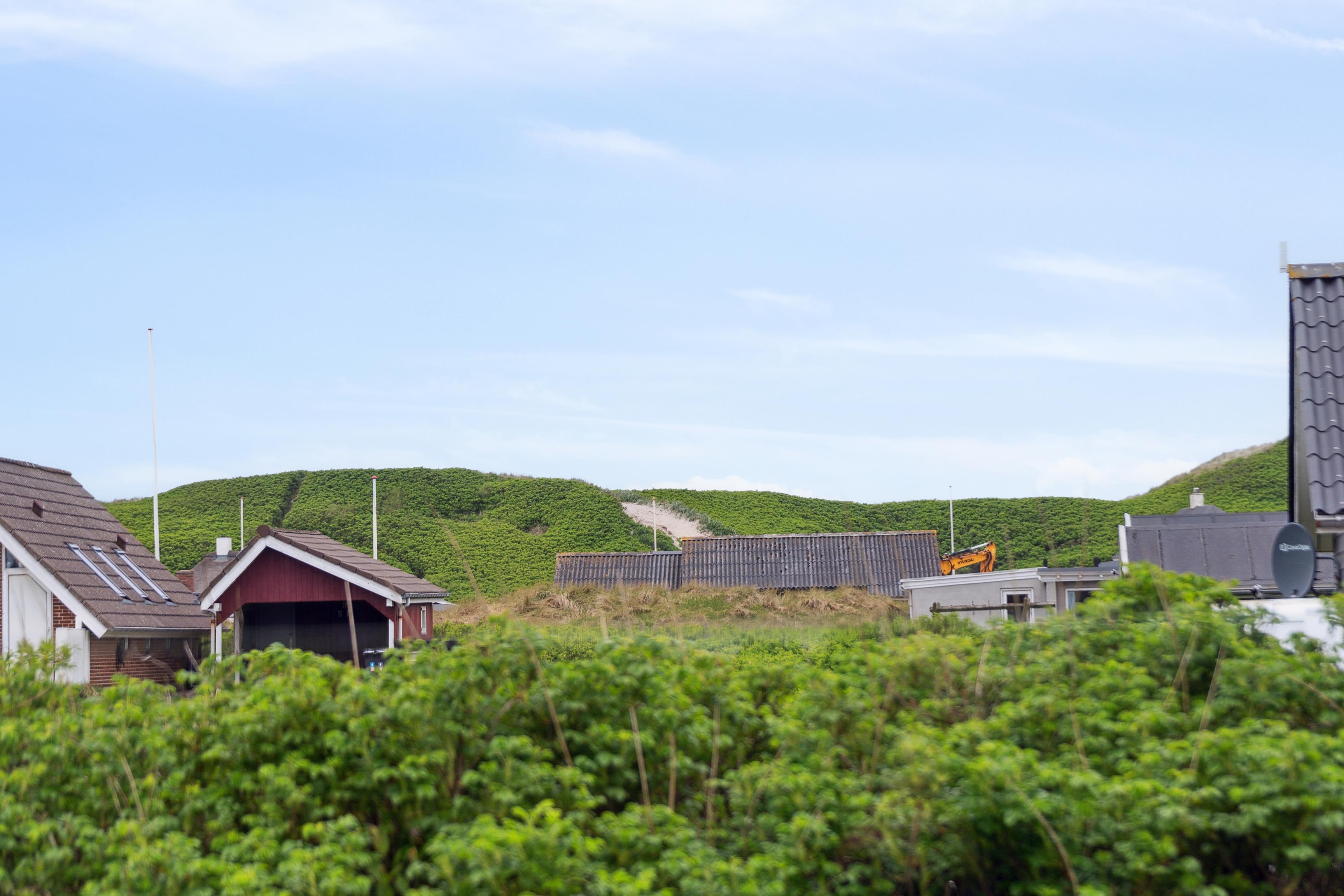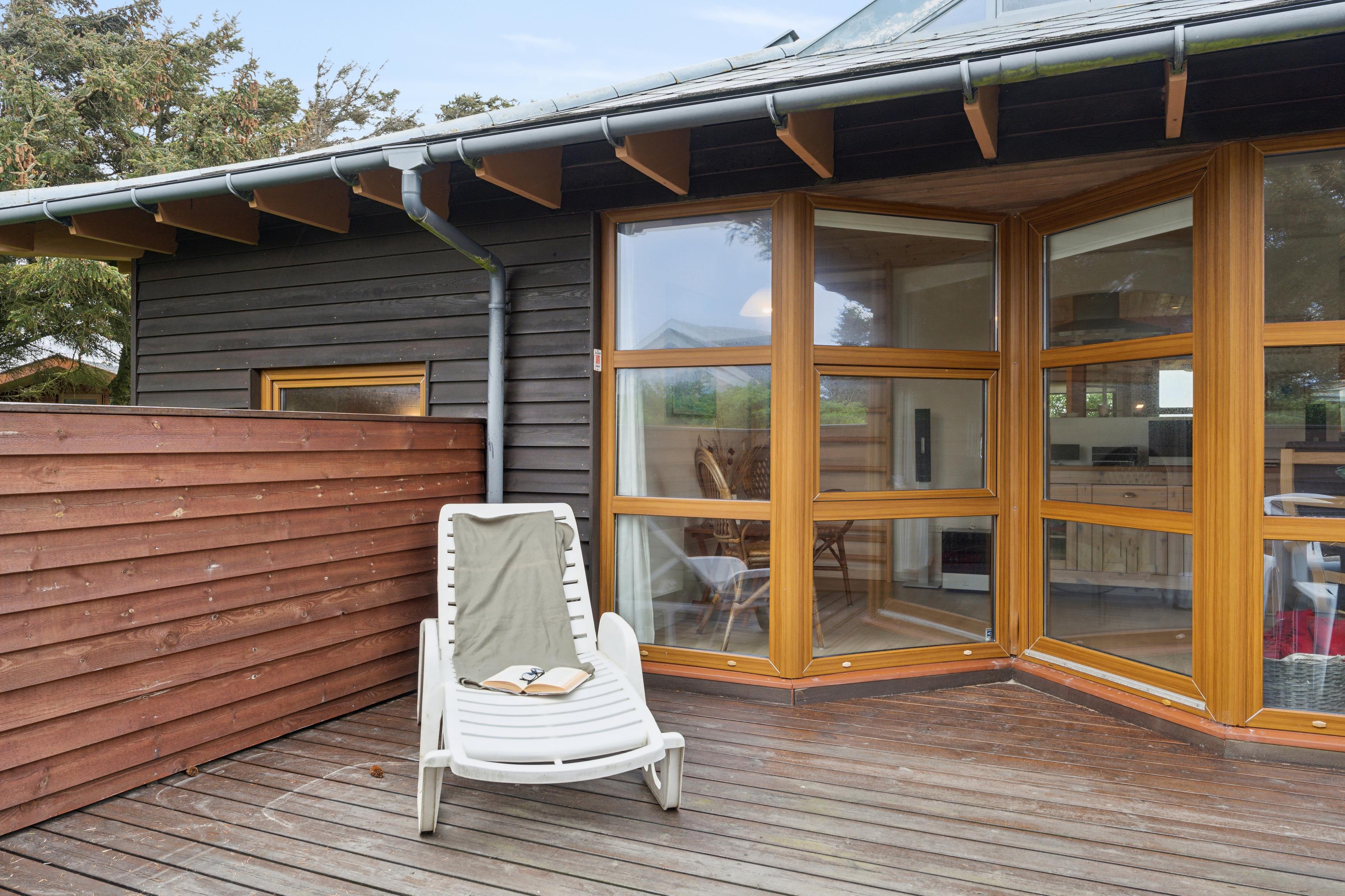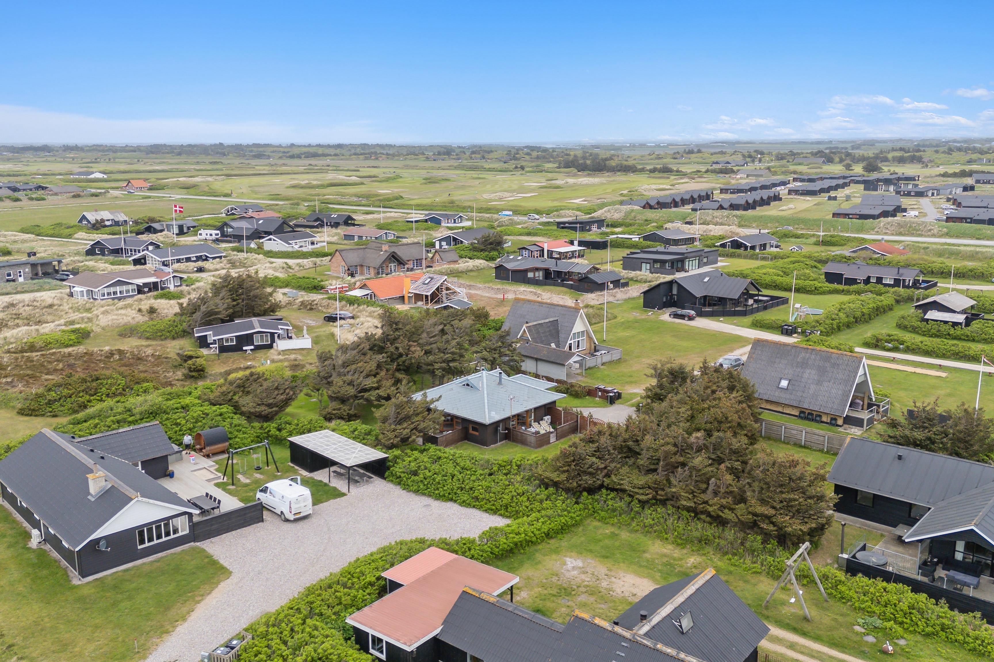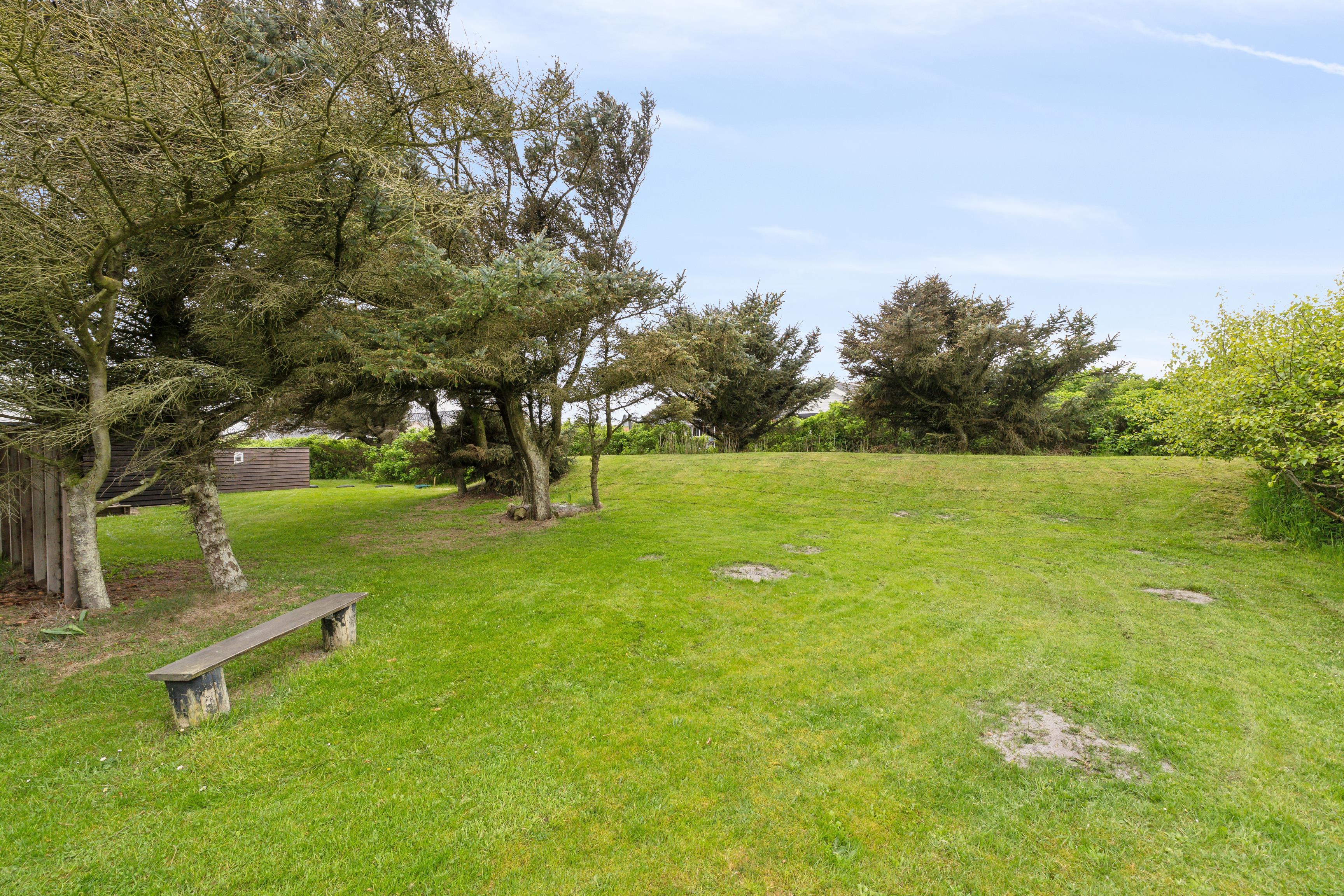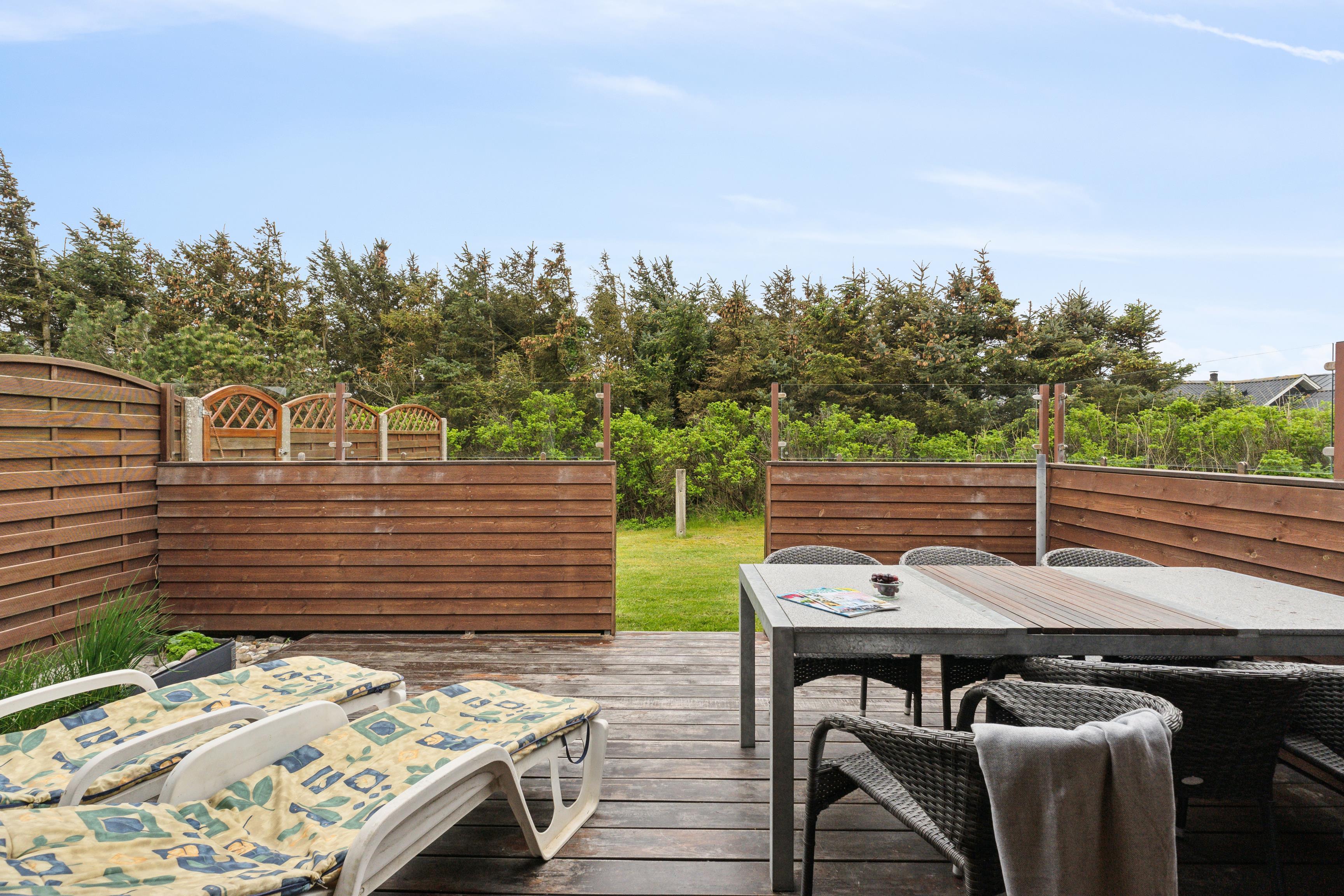 Dette sommerhus på 100 m² ligger på en smuk, græsklædt grund, omkranset af buske og træer, der giver både læ og privatliv. Der er to afskærmede terrasser på hver side af huset, så I kan følge solens gang hele dagen. Huset ligger kun 350 meter fra det kraftfulde Vesterhav, hvor der er rig mulighed for at bade eller gå lange ture. Den friske havluft og de åbne vidder giver både plads til leg og afslapning.