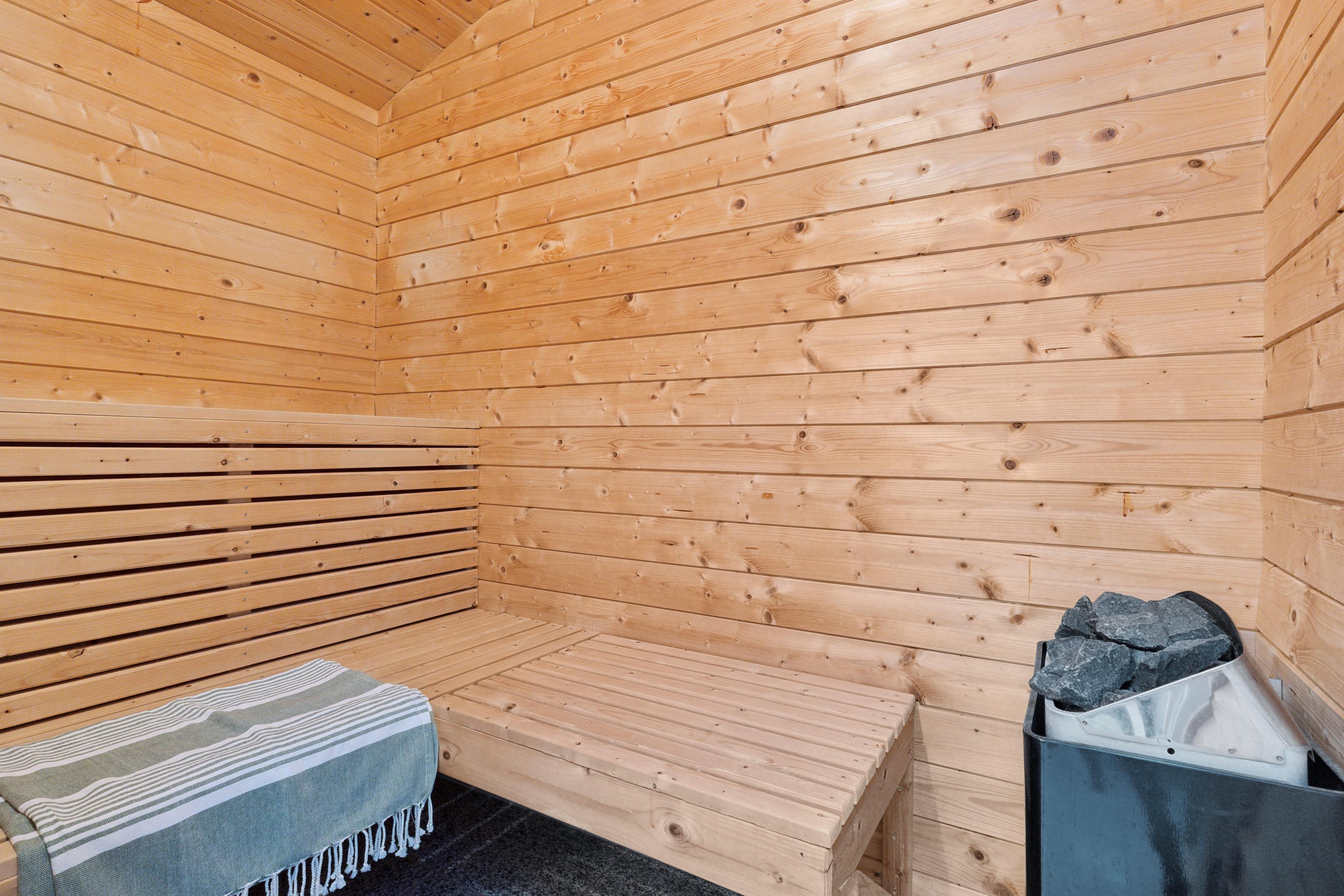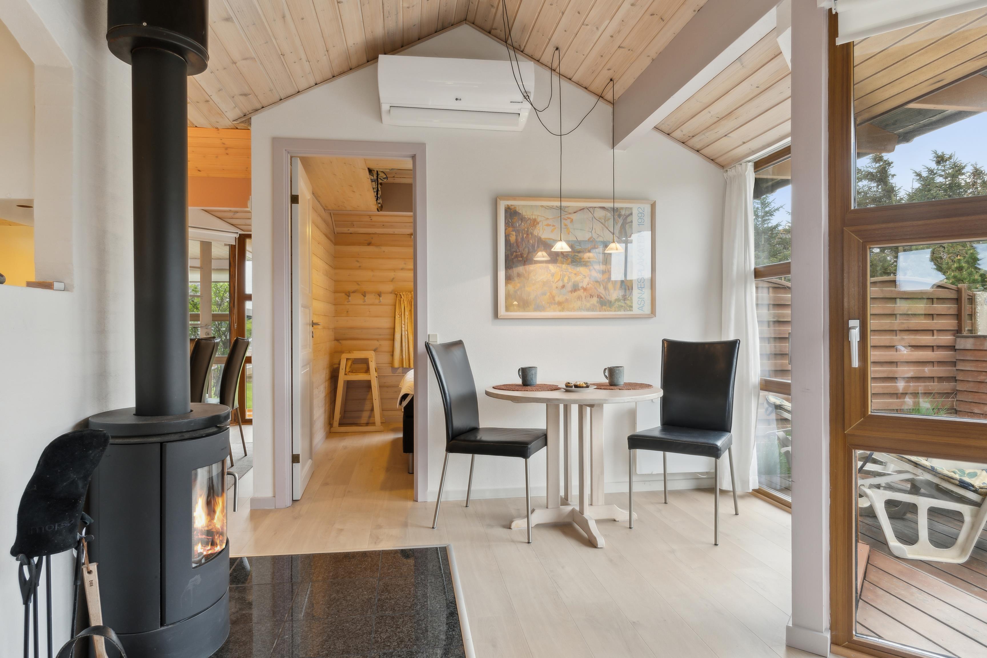 Udover brændeovnen er huset udstyret med en luft-til-luft varmepumpe, der sikrer energieffektiv opvarmning og nedkøling. Ønsker I en pause, kan I tage en afslappende tur i saunaen og lade op.