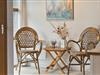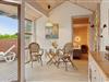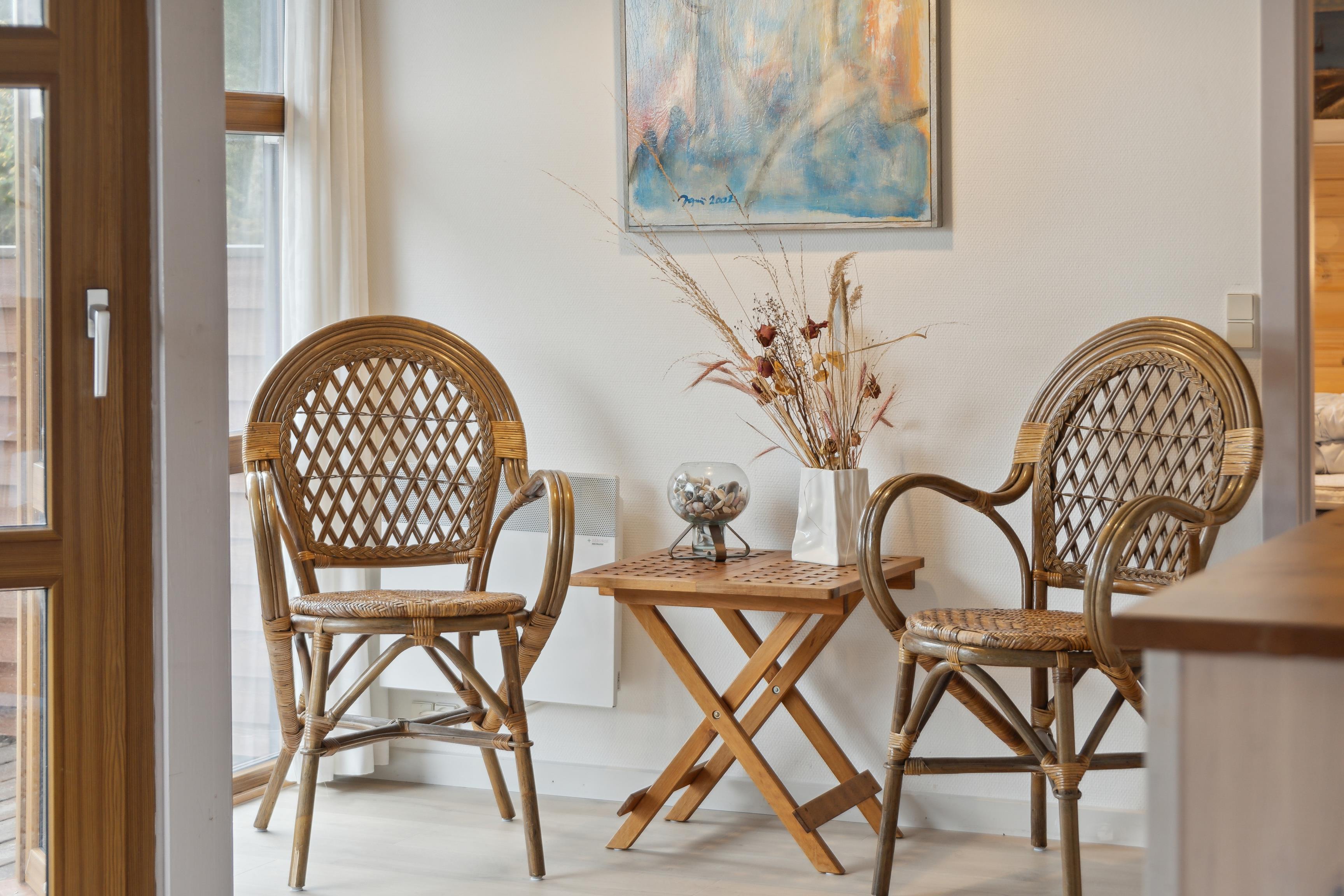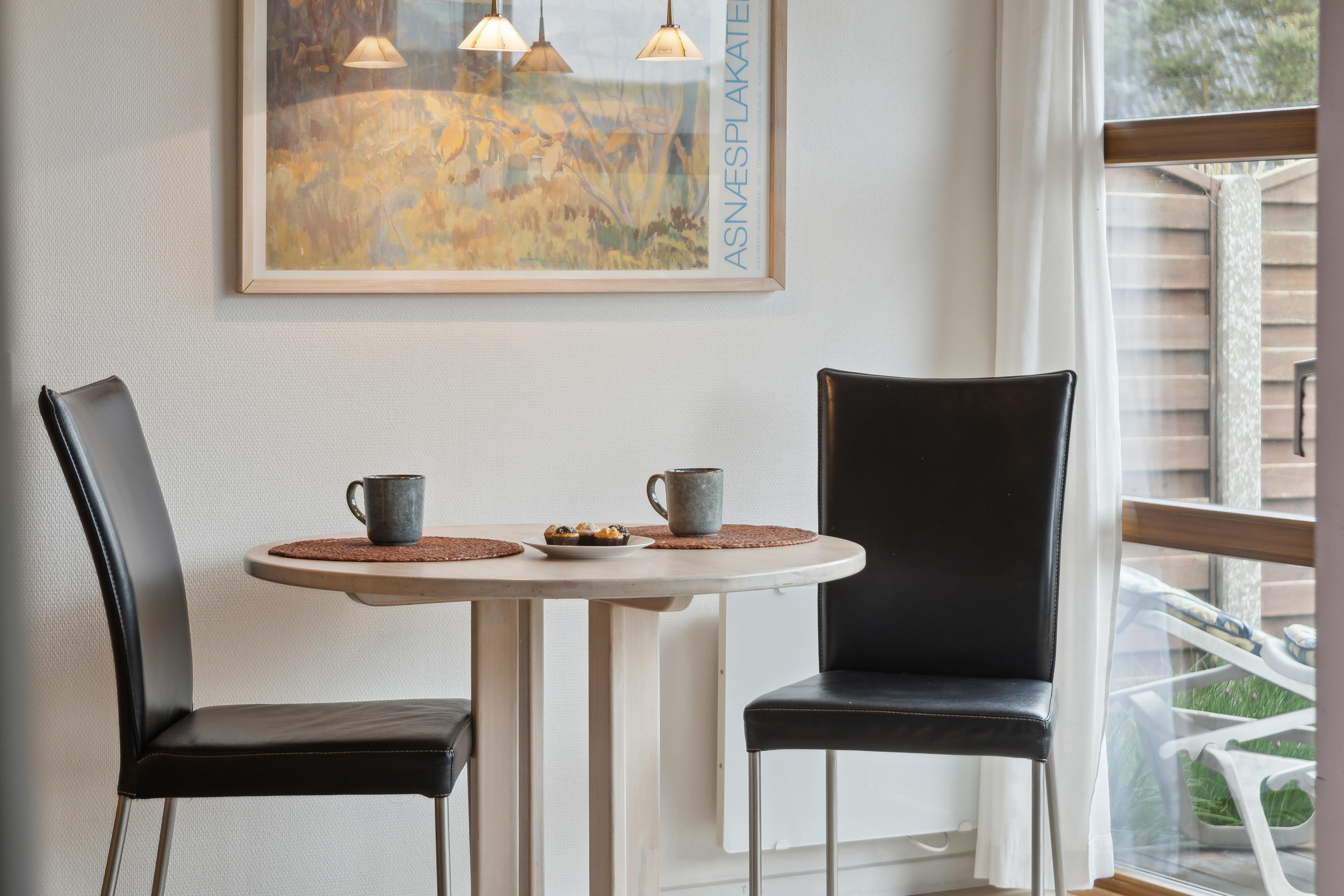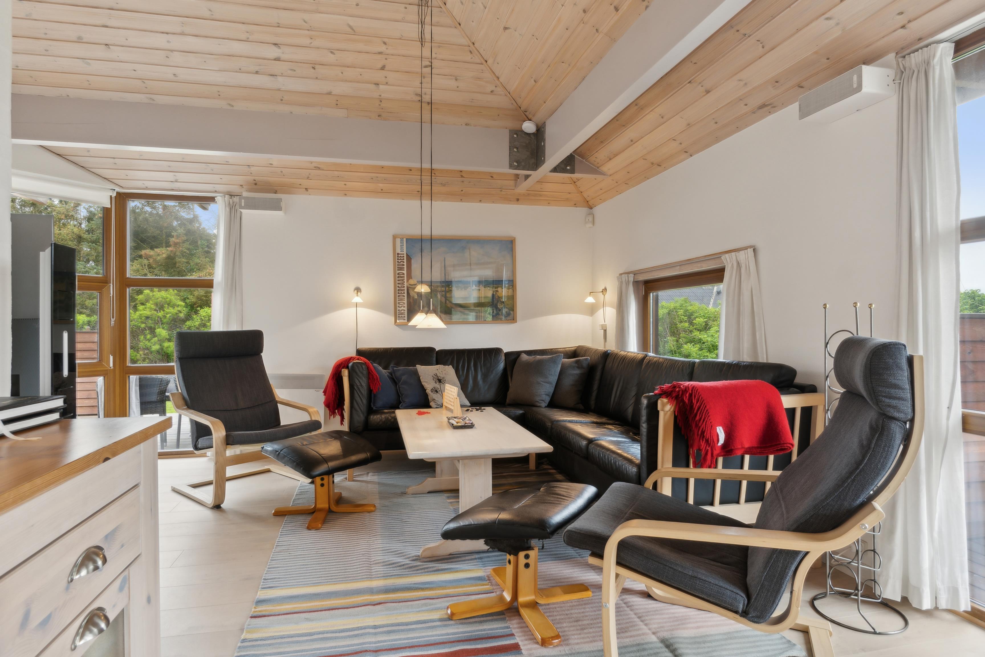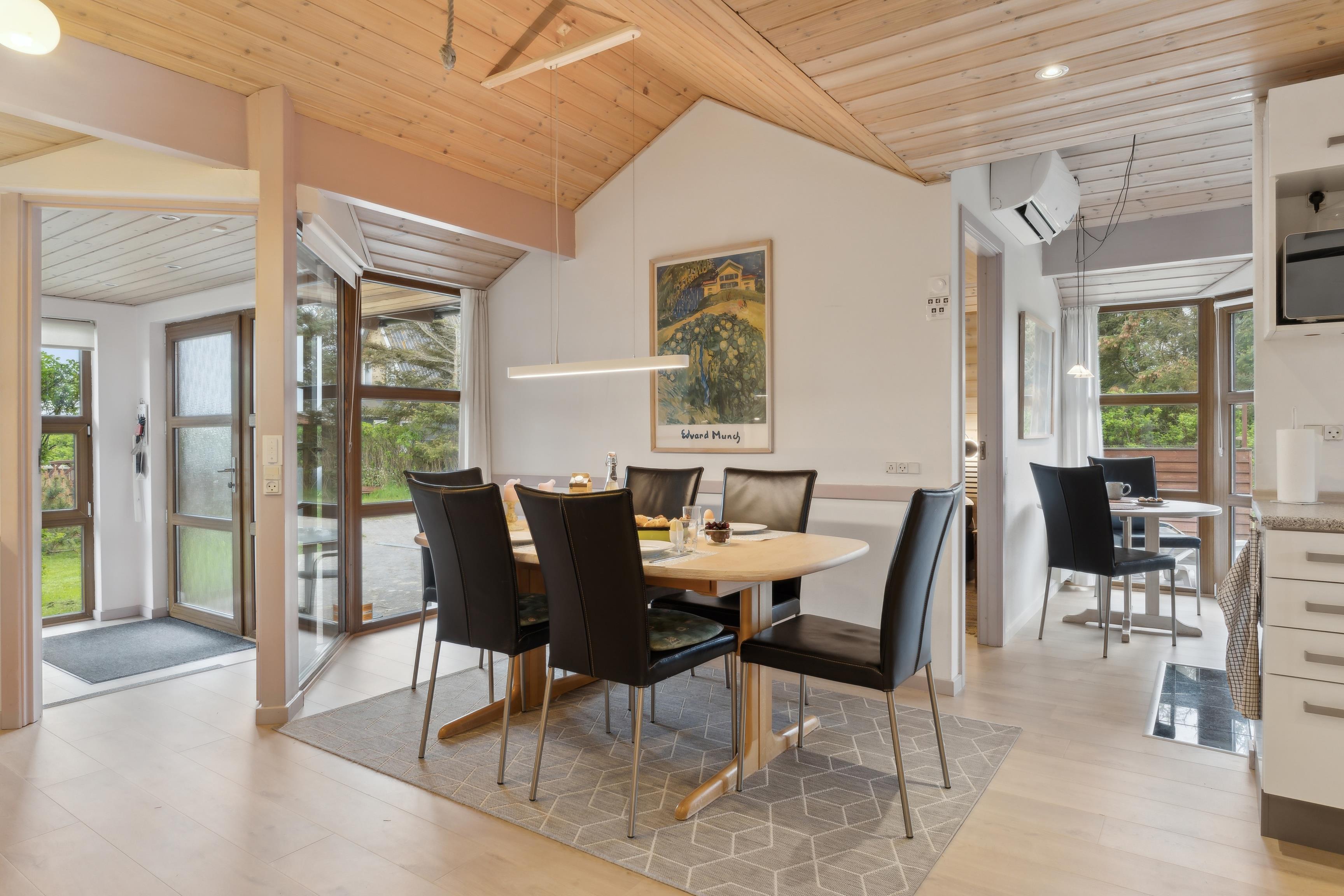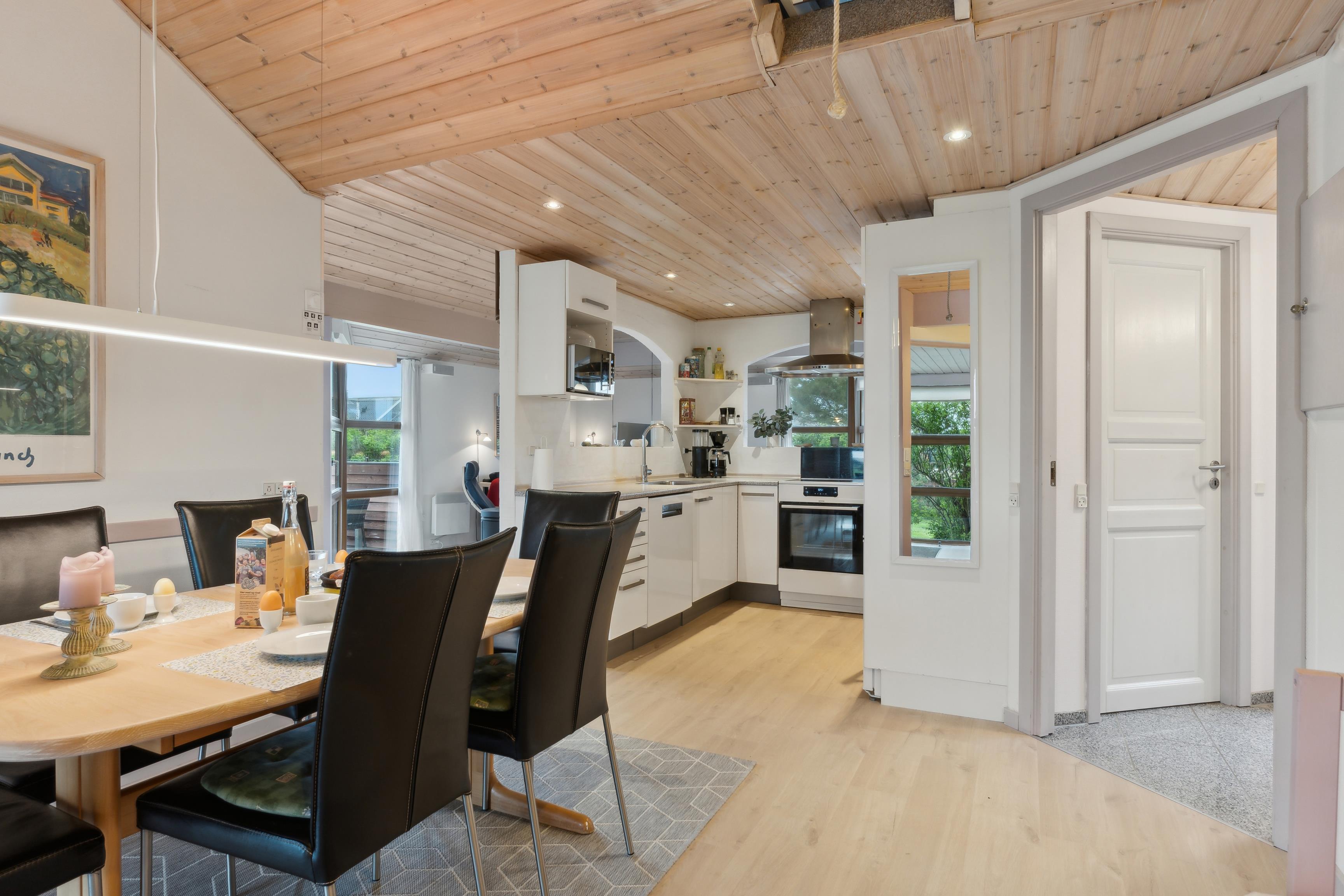 Sommerhusets midtpunkt er det rummelige køkken-alrum. Indretningen er præget af lyse, rolige nuancer med små farveindslag, der til sammen giver et personligt og hyggeligt præg og skaber en varm atmosfære. Med Sonos-anlægget kan I lytte til jeres egen musik og skabe den helt rette stemning.