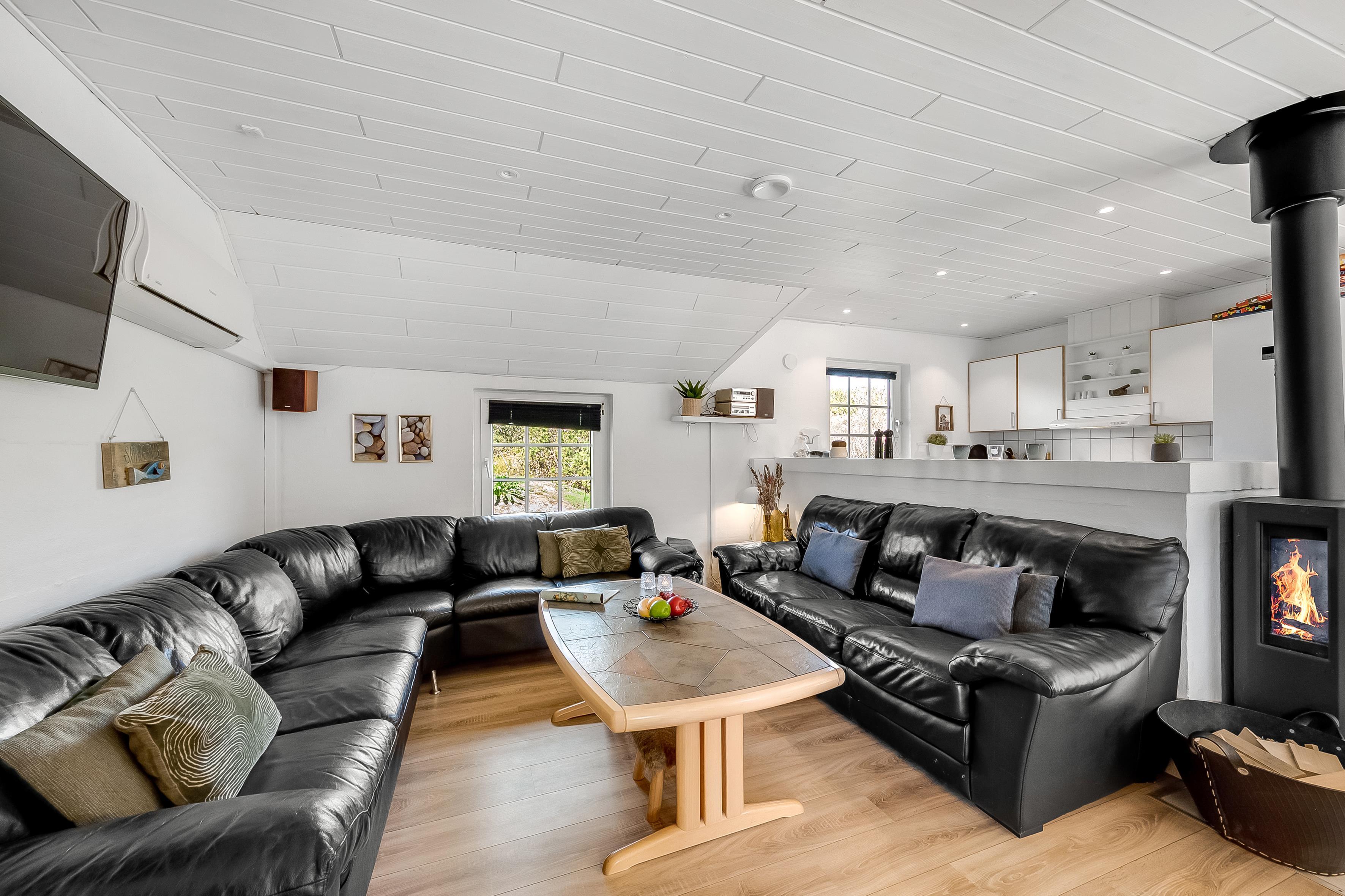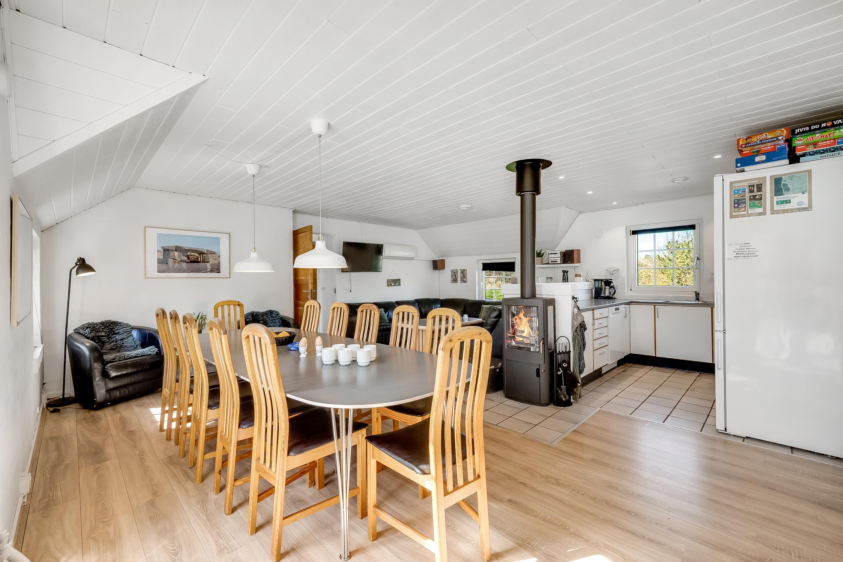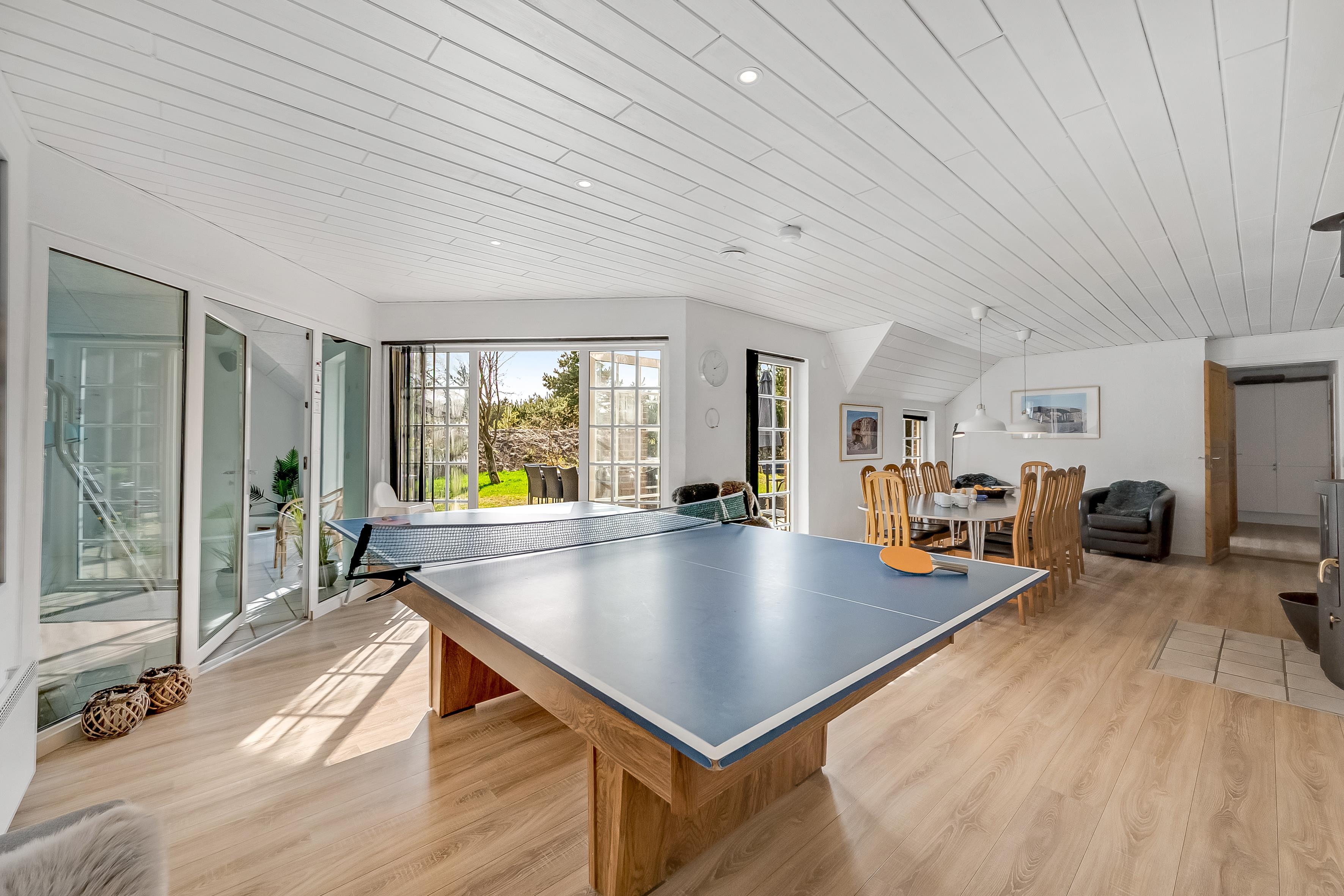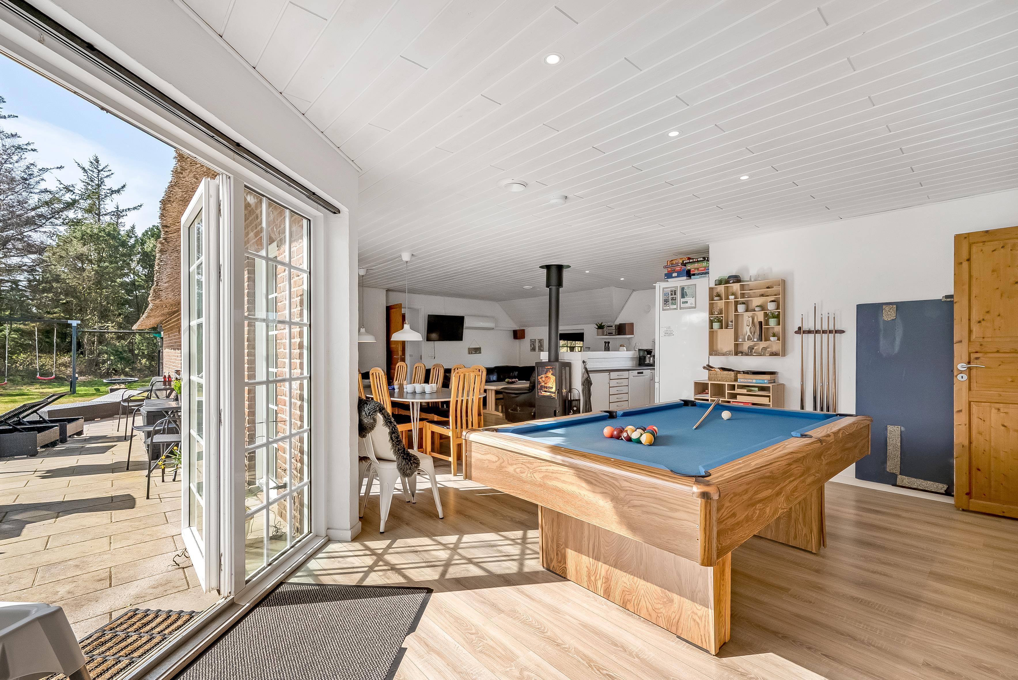 Det åbne opholds- og spiseområde kombineret med køkkenet er husets midtpunkt og det perfekte mødested, da du også finder et poolbord og et bordtennisbord her. Det hyggelige sofaområde og tv'et med satellitmodtagelse af tyske kanaler samt WiFi sørger for underholdning eller indbyder til en stille aften foran tv'et. En brændeovn sørger for ekstra hygge på kølige aftener, mens den energibesparende luft-til-luft-varmepumpe sikrer behagelige varme/kolde temperaturer hele året rundt. Det moderne, fuldt udstyrede køkken har keramiske kogeplader, opvaskemaskine, køleskab med 80 liters frysekapacitet og mikrobølgeovn, så du nemt kan tilberede alle dine yndlingsmåltider. Huset har i alt 6 soveværelser, som er opdelt i 2 separate soveområder - hver med sit eget badeværelse. Badeværelserne er udstyret med toilet, håndvask, bruser og gulvvarme, hvilket giver lidt mere privatliv til individuelle familier eller store grupper. 4 af værelserne har dobbeltsenge, et værelse har 2 enkeltsenge, og et værelse har 2 køjesenge.