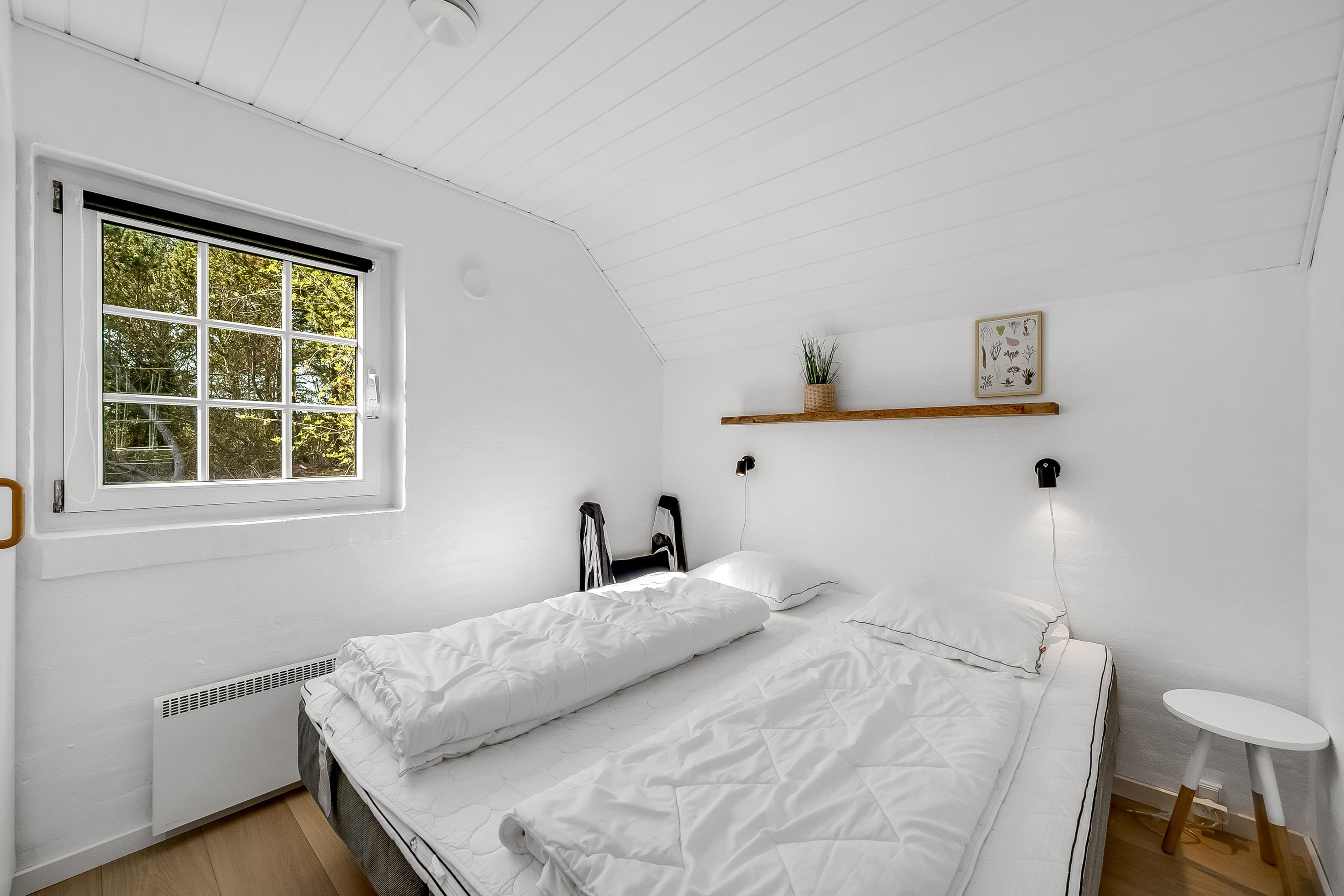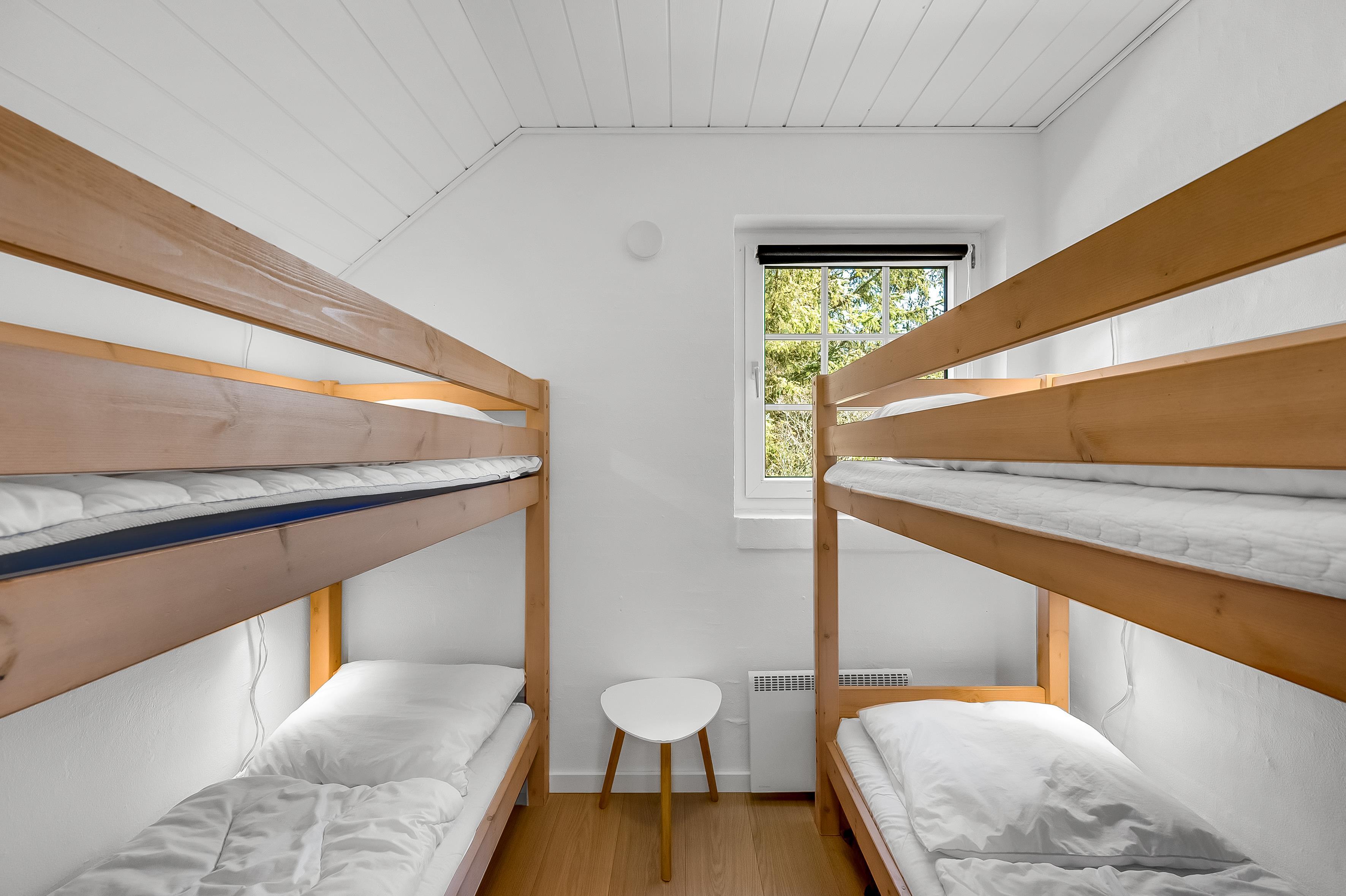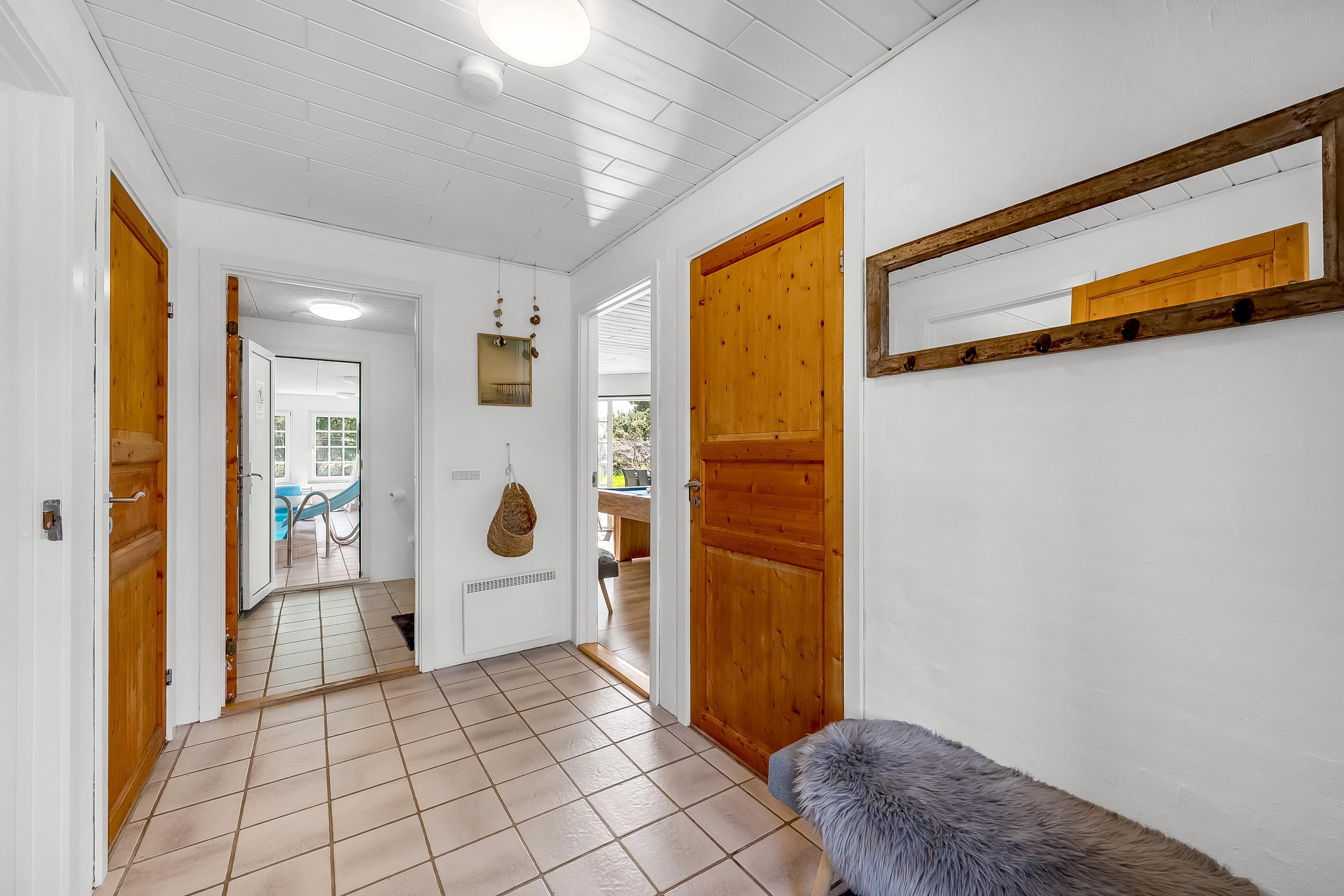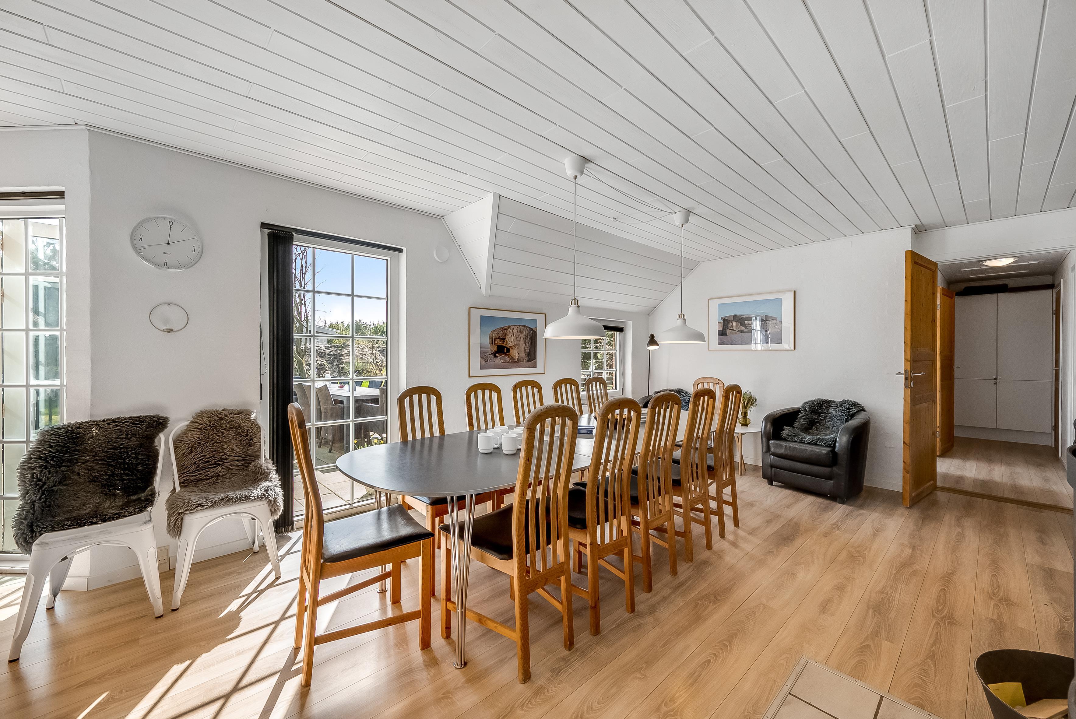 Det åbne opholds- og spiseområde kombineret med køkkenet er husets midtpunkt og det perfekte mødested, da du også finder et poolbord og et bordtennisbord her. Det hyggelige sofaområde og tv'et med satellitmodtagelse af tyske kanaler samt WiFi sørger for underholdning eller indbyder til en stille aften foran tv'et. En brændeovn sørger for ekstra hygge på kølige aftener, mens den energibesparende luft-til-luft-varmepumpe sikrer behagelige varme/kolde temperaturer hele året rundt. Det moderne, fuldt udstyrede køkken har keramiske kogeplader, opvaskemaskine, køleskab med 80 liters frysekapacitet og mikrobølgeovn, så du nemt kan tilberede alle dine yndlingsmåltider. Huset har i alt 6 soveværelser, som er opdelt i 2 separate soveområder - hver med sit eget badeværelse. Badeværelserne er udstyret med toilet, håndvask, bruser og gulvvarme, hvilket giver lidt mere privatliv til individuelle familier eller store grupper. 4 af værelserne har dobbeltsenge, et værelse har 2 enkeltsenge, og et værelse har 2 køjesenge.