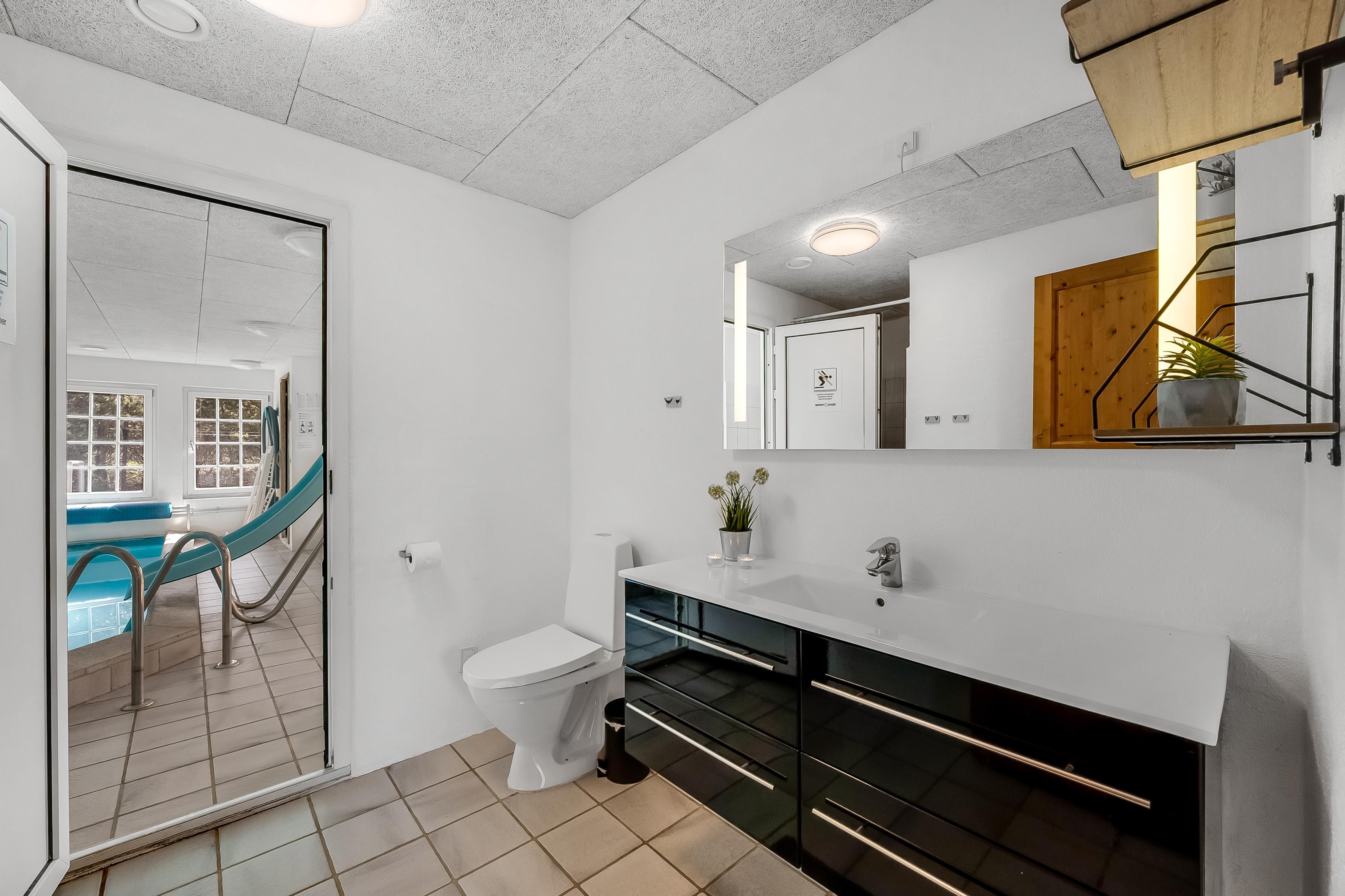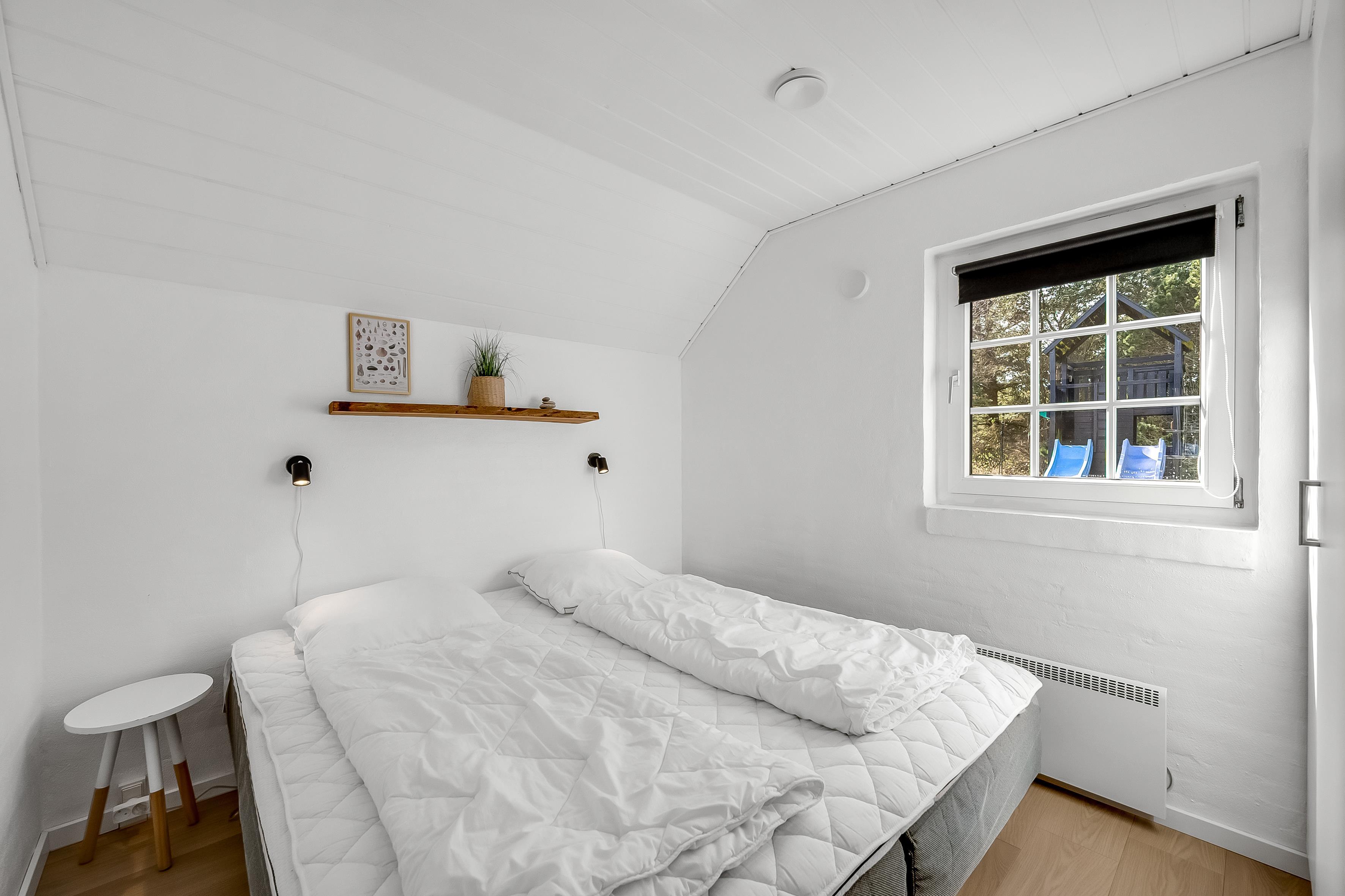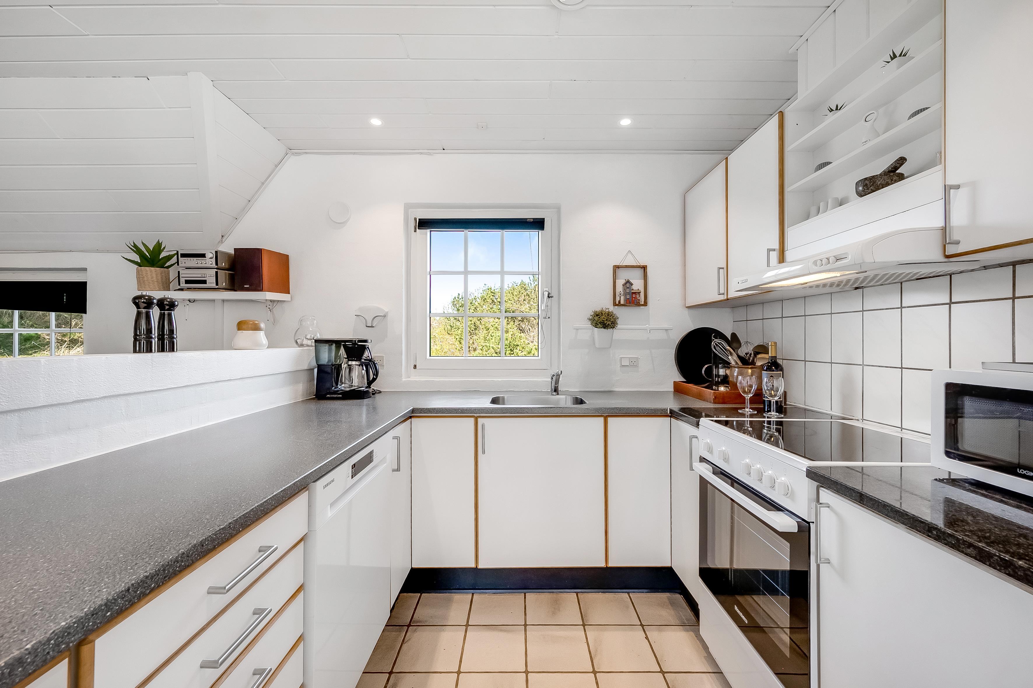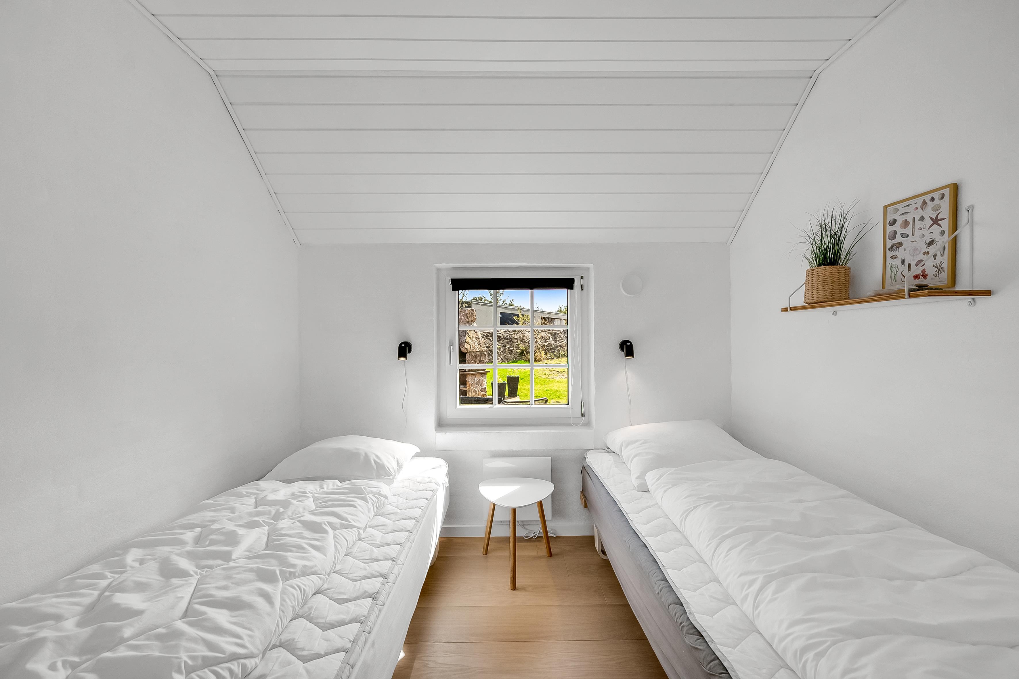 Det åbne opholds- og spiseområde kombineret med køkkenet er husets midtpunkt og det perfekte mødested, da du også finder et poolbord og et bordtennisbord her. Det hyggelige sofaområde og tv'et med satellitmodtagelse af tyske kanaler samt WiFi sørger for underholdning eller indbyder til en stille aften foran tv'et. En brændeovn sørger for ekstra hygge på kølige aftener, mens den energibesparende luft-til-luft-varmepumpe sikrer behagelige varme/kolde temperaturer hele året rundt. Det moderne, fuldt udstyrede køkken har keramiske kogeplader, opvaskemaskine, køleskab med 80 liters frysekapacitet og mikrobølgeovn, så du nemt kan tilberede alle dine yndlingsmåltider. Huset har i alt 6 soveværelser, som er opdelt i 2 separate soveområder - hver med sit eget badeværelse. Badeværelserne er udstyret med toilet, håndvask, bruser og gulvvarme, hvilket giver lidt mere privatliv til individuelle familier eller store grupper. 4 af værelserne har dobbeltsenge, et værelse har 2 enkeltsenge, og et værelse har 2 køjesenge.
