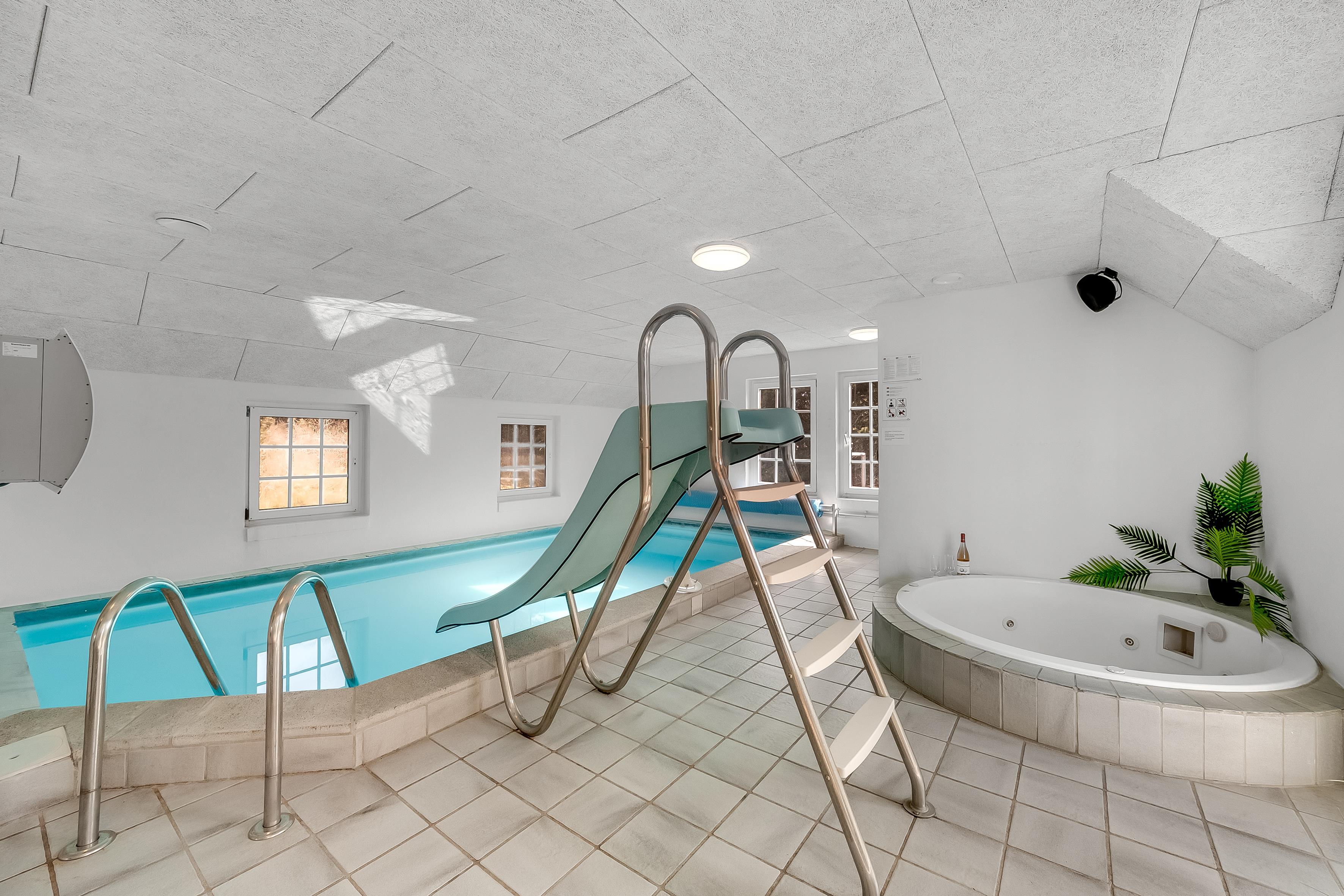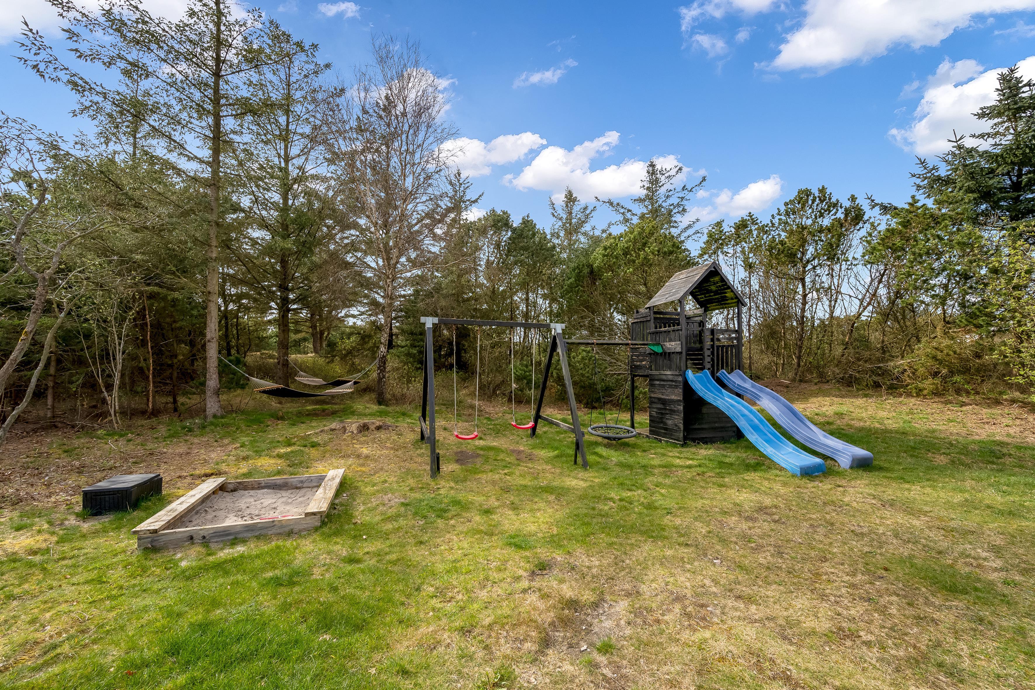 I poolområdet får alle - unge som gamle - noget for pengene. Den store pool er udstyret med et modstrømssystem, og børnene kan nyde en vandrutsjebane. Slap af i 4-personers whirlpoolen eller i saunaen efter en dag fuld af aktiviteter. Dine børn vil også have masser af sjov udendørs. Et klatrestativ med rutsjebaner og gynger, en stor sandkasse og fodboldmål venter på dem. Du kan se dem lege, mens du slapper af i hængekøjerne eller i liggestolene på den store terrasse. Der er en muret grill og to kulgriller til en hyggelig grillaften.