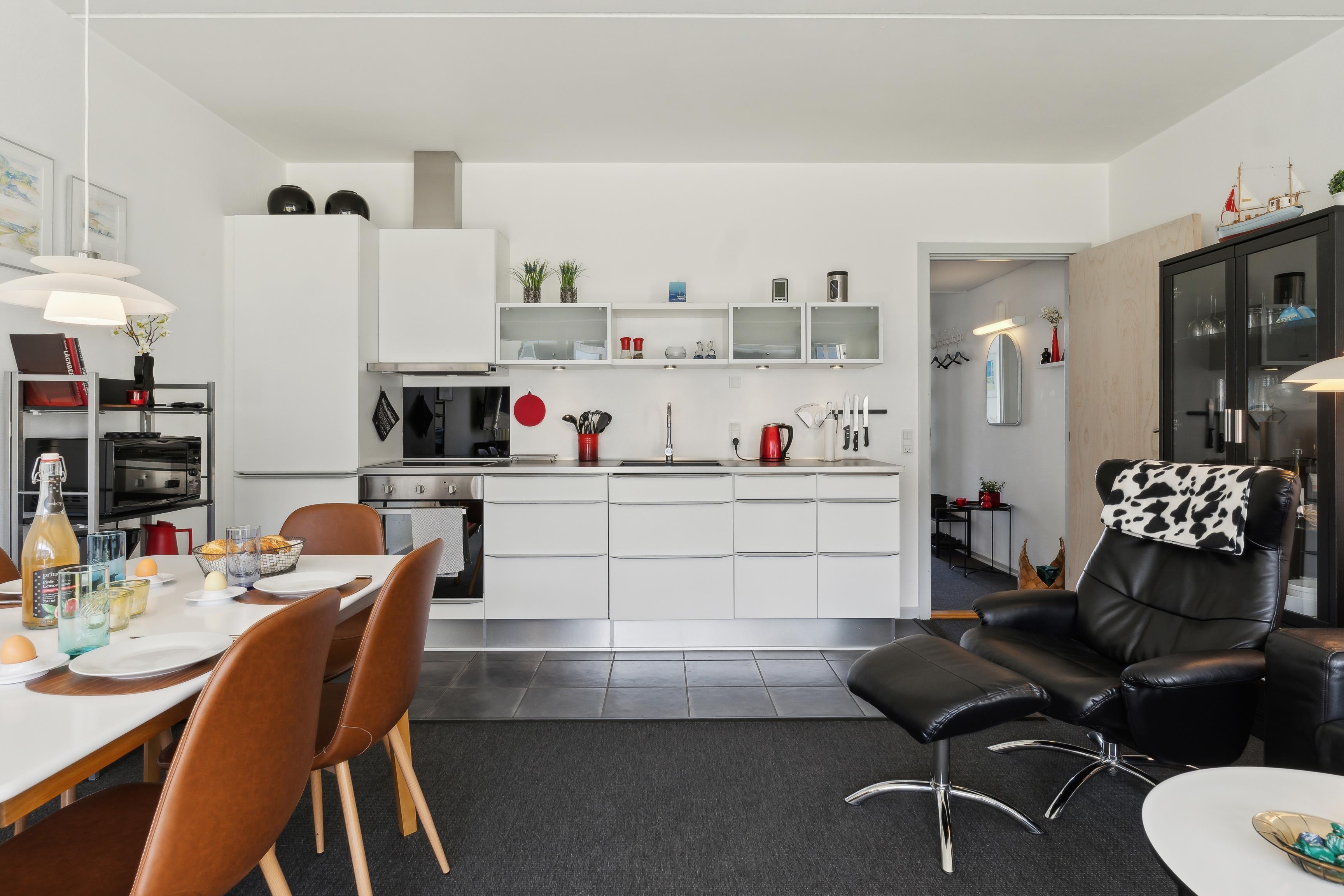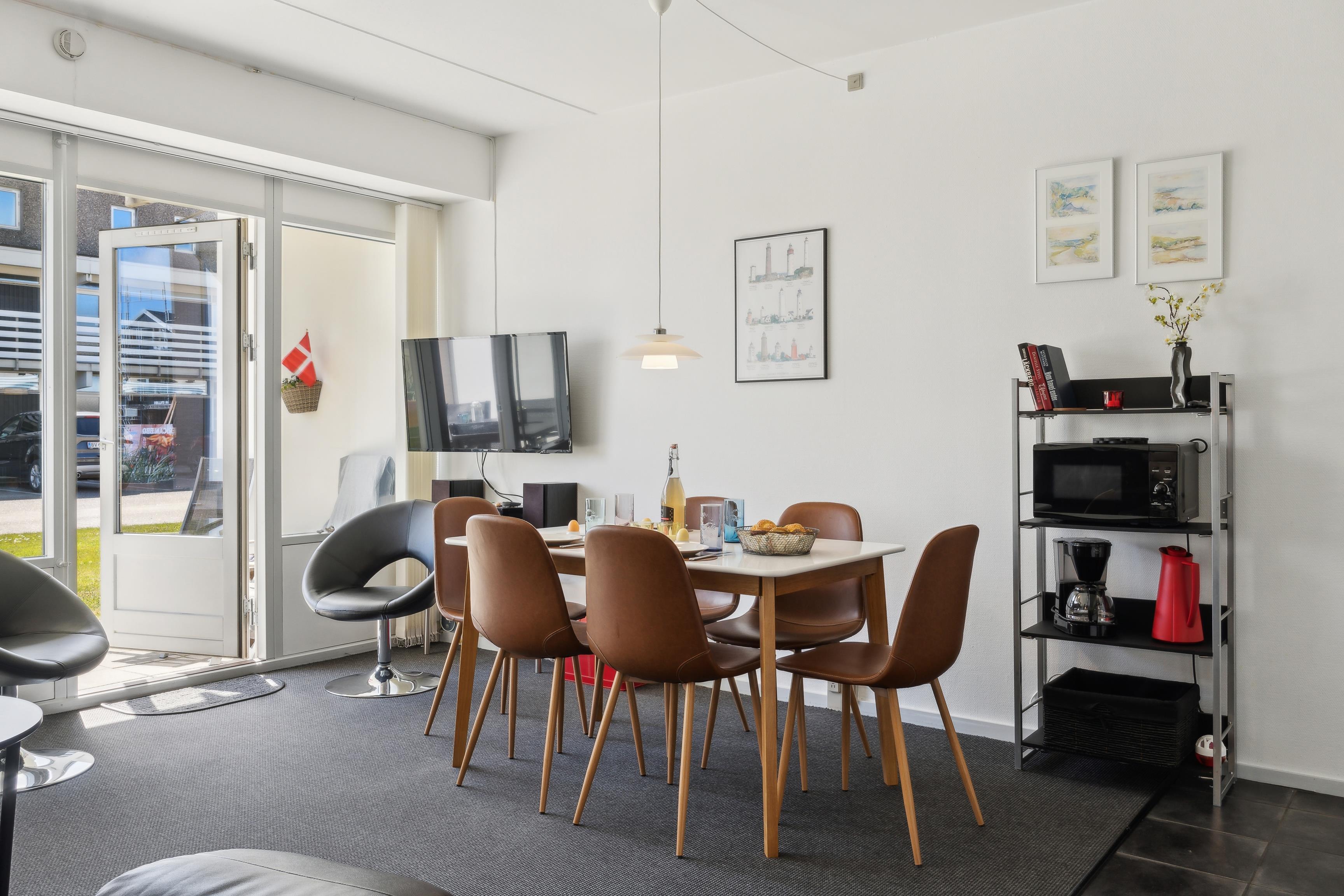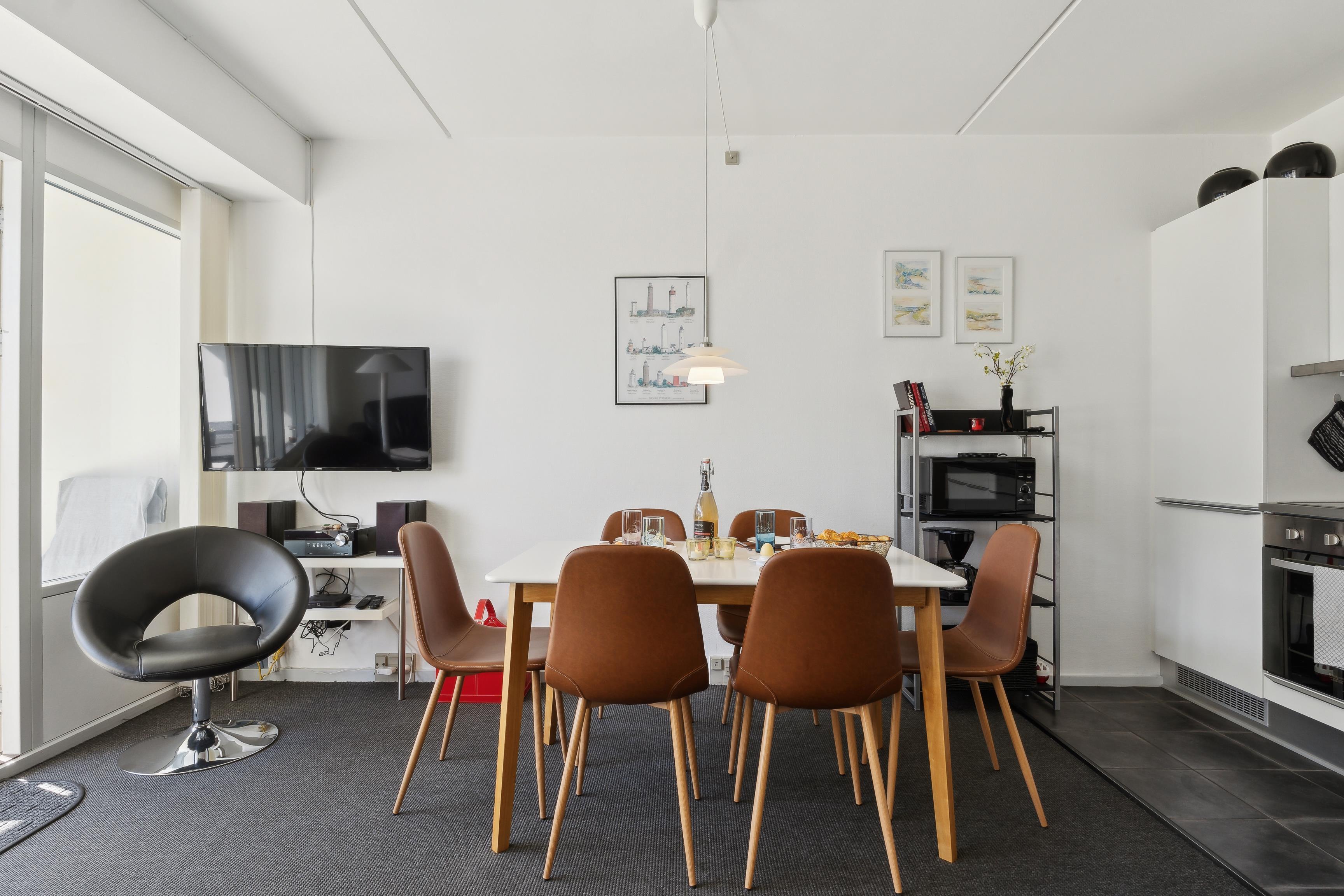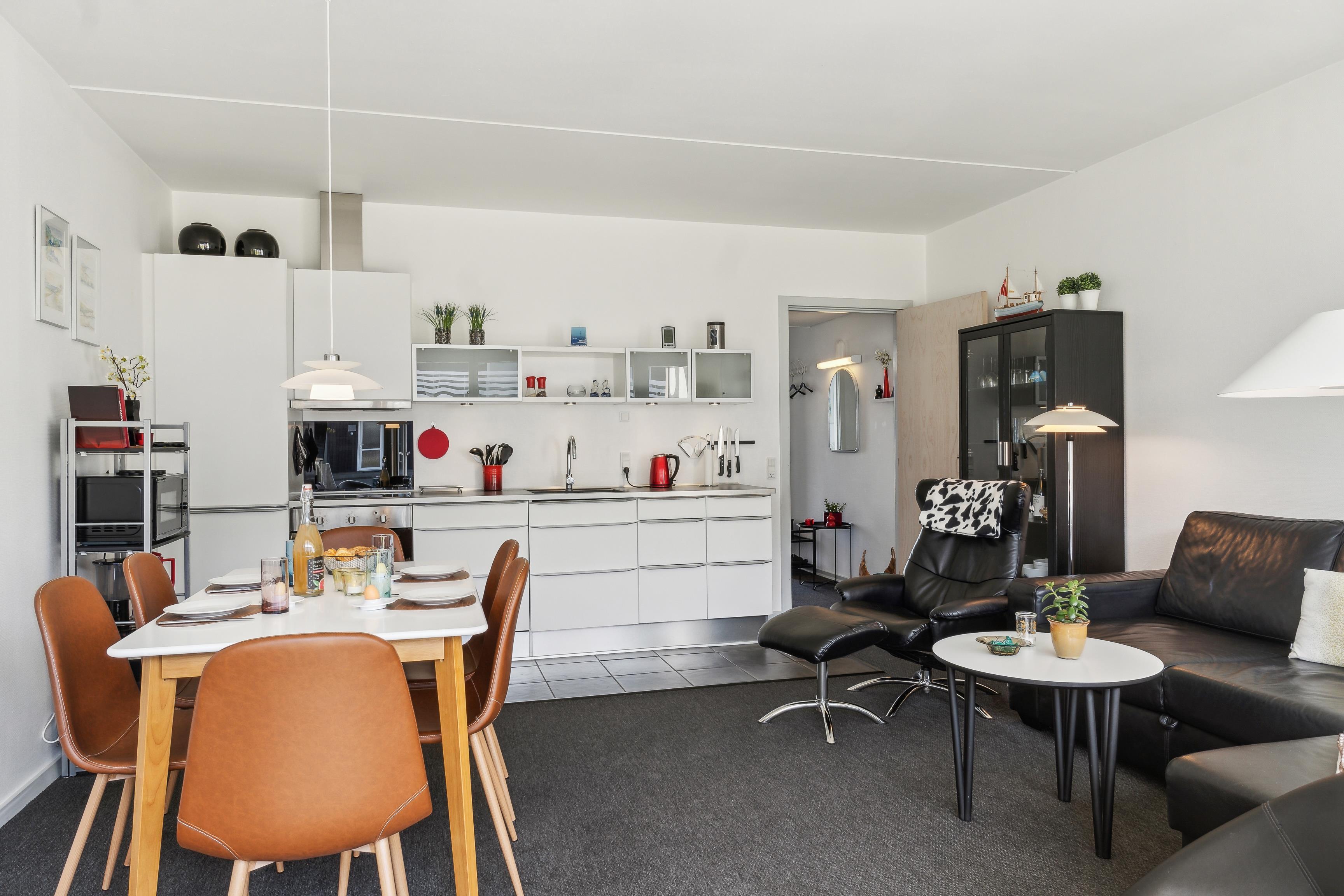 Lejligheden er på 50 kvadratmeter, og alrummet fungerer som hjertet i jeres ferieophold. Her er køkken, stue og spiseplads samlet, så I har masser af muligheder for at tilbringe tid sammen – hvad enten I laver mad, spiller spil eller bare slapper af. Køkkenet er veludstyret, og når maden er lavet, kan I glæde jer over, at der er en opvaskemaskine, som tager sig af opvasken.