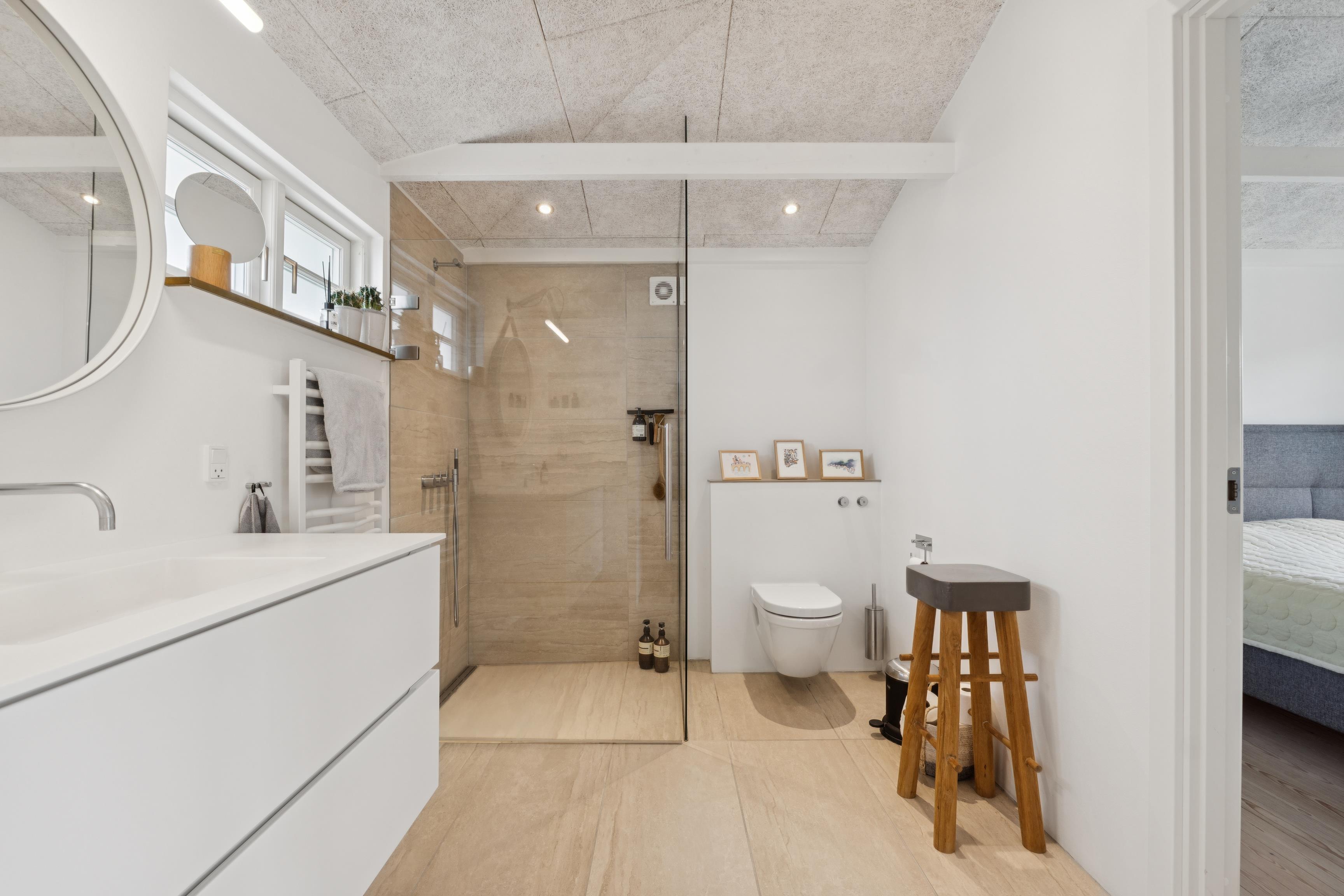 Huset er opdelt i 2 områder og er indrettet i lyse farver, som afspejler og fremhæver husets elegance. I hovedhuset finder du en åben stue, der smelter sammen med køkkenet og spisepladsen og giver rummet en åben atmosfære. Brændeovnen spreder varme og en hyggelig atmosfære på køligere dage, når man kan høre brændet knitrende i ovnen. Der er et rummeligt soveværelse med dobbeltseng og et badeværelse med bruser. I den anden bygning er der 3 yderligere soveværelser med hver en dobbeltseng samt et ekstra badeværelse med bruser. Den lille, hyggelige stue med egen tv afrunder det hele.