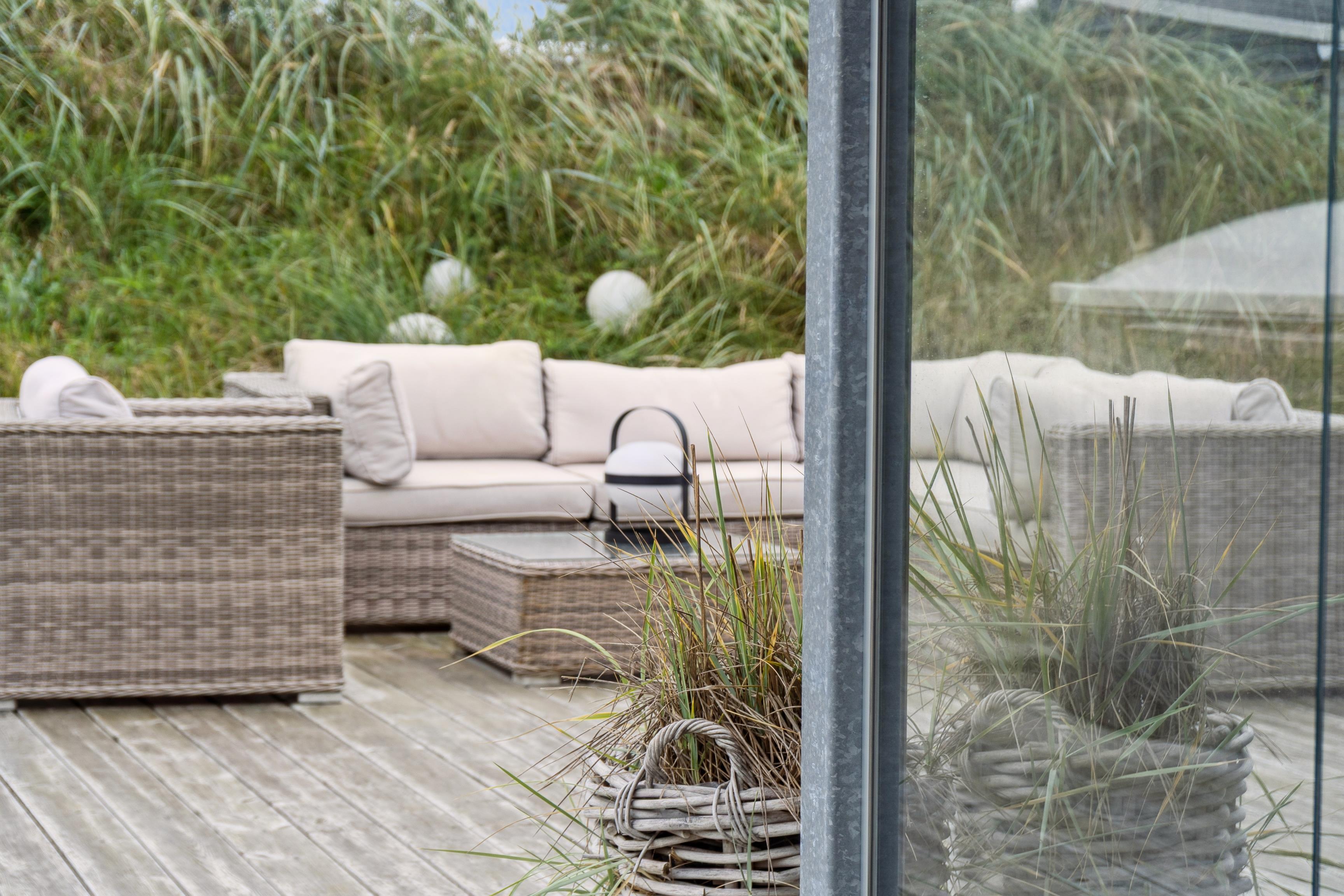 På den store terrasse venter en sand oase af afslapning. Nyd et bad i det varme vildmarksbad, slap af i liggestole, sofaen eller sæt jer behageligt til bords ved træbordet og spis sammen. Alt er holdt i naturligt træ, og dekorationerne giver terrassen et ekstra naturligt præg. Et overdækket område med glasfront på siden giver desuden mulighed for at nyde naturen udenfor på køligere eller regnfulde dage, som der ofte er i foråret eller det sene efterår. Således kan man være udenfor næsten hele året og samtidig være beskyttet mod vind og vejr.
