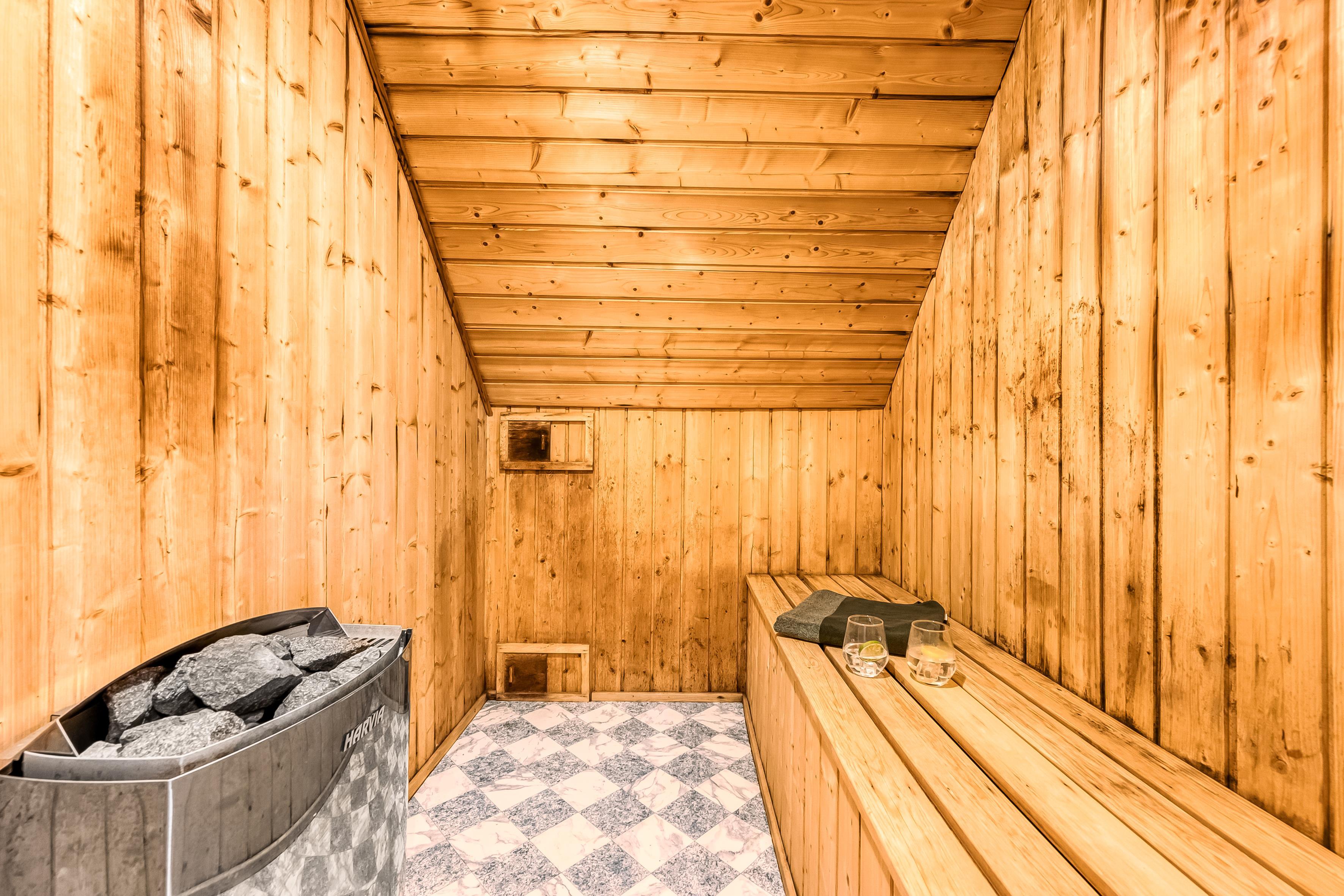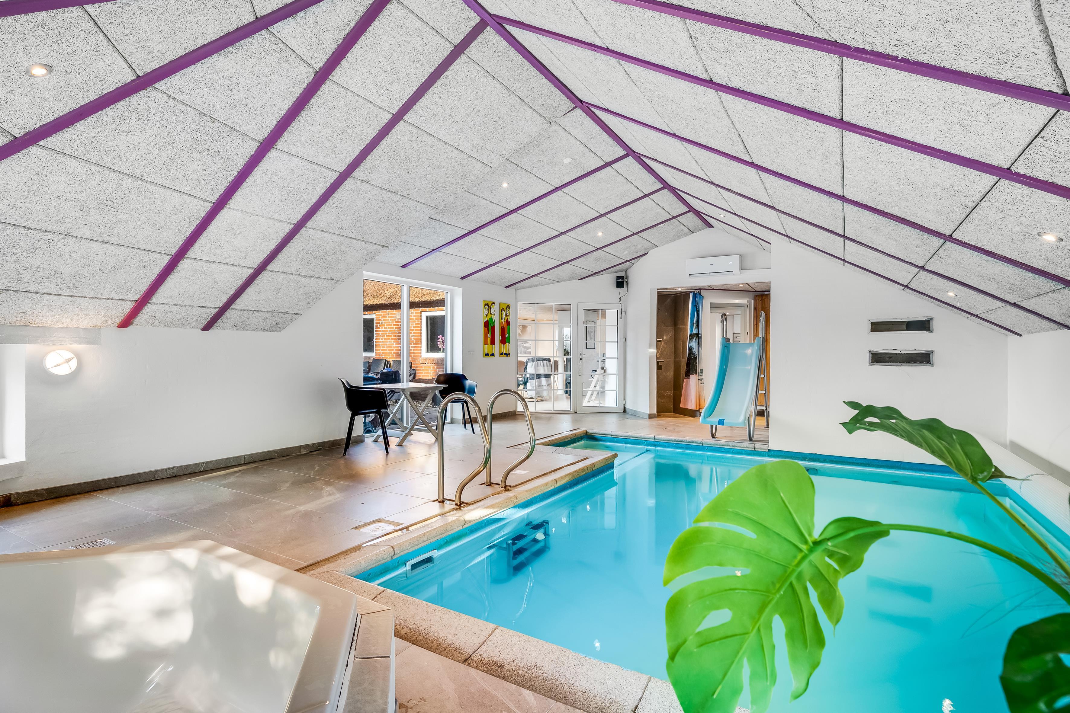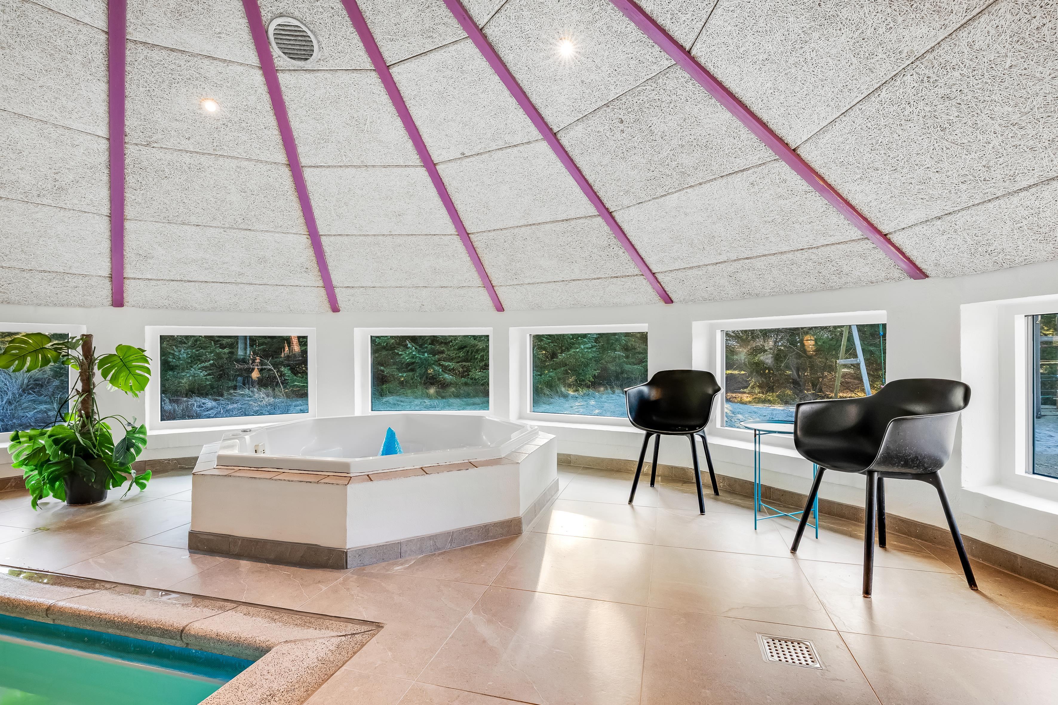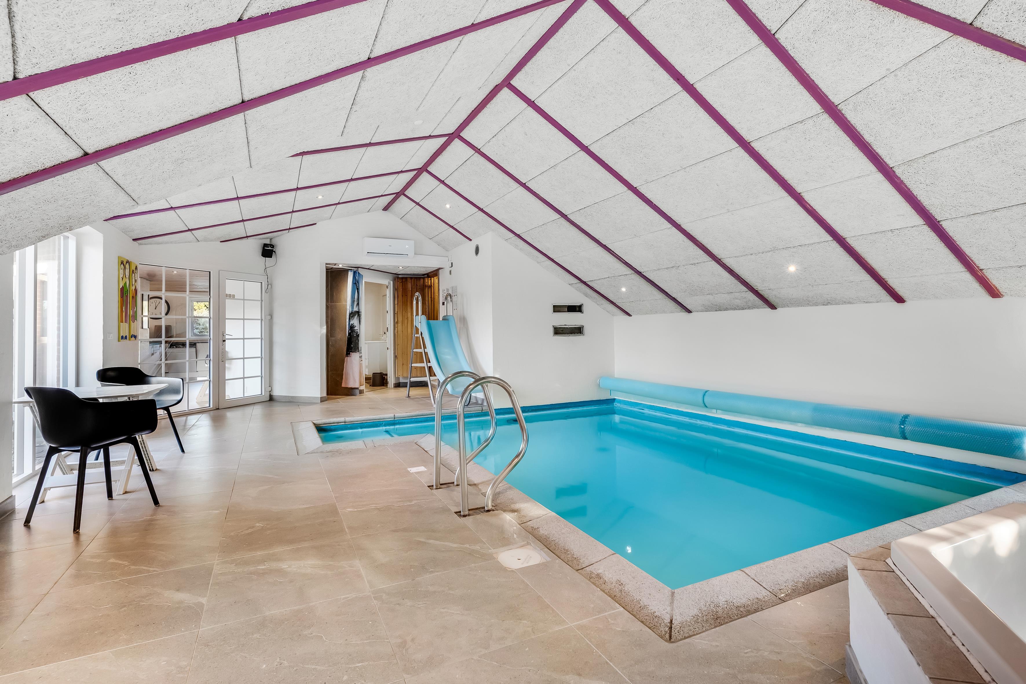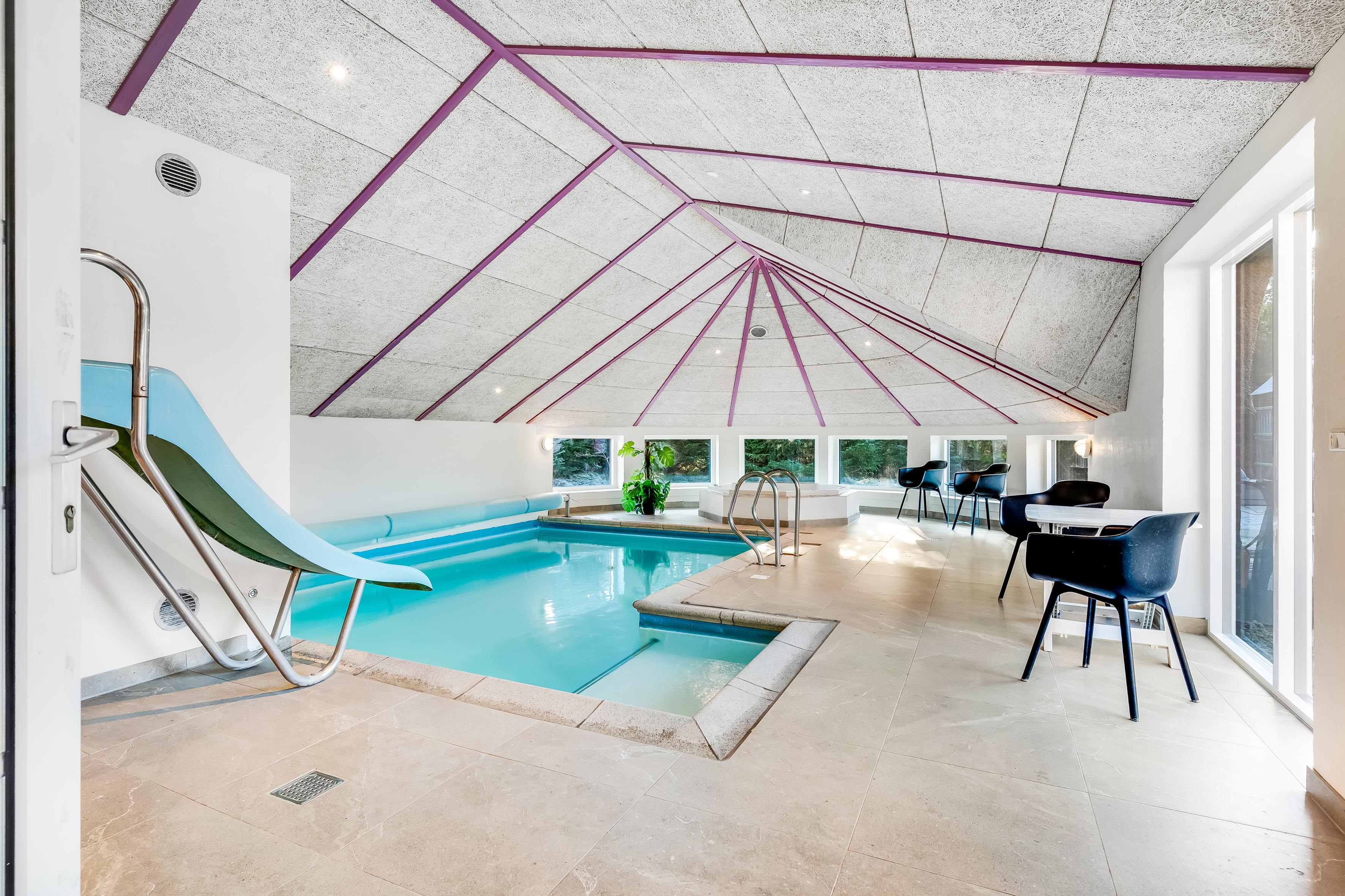 Nyd jeres private oase med et stort poolområde, der prydes af et imponerende buet vinduesparti, der lader masser af naturligt lys strømme ind. Poolen, der strækker sig over 20 kvadratmeter, er udstyret med en sjov vandrutsjebane, der vil underholde både børn og voksne. Slap af i det 4-personers spabad eller forkæl jer selv i saunaen efter en dag med aktiviteter.