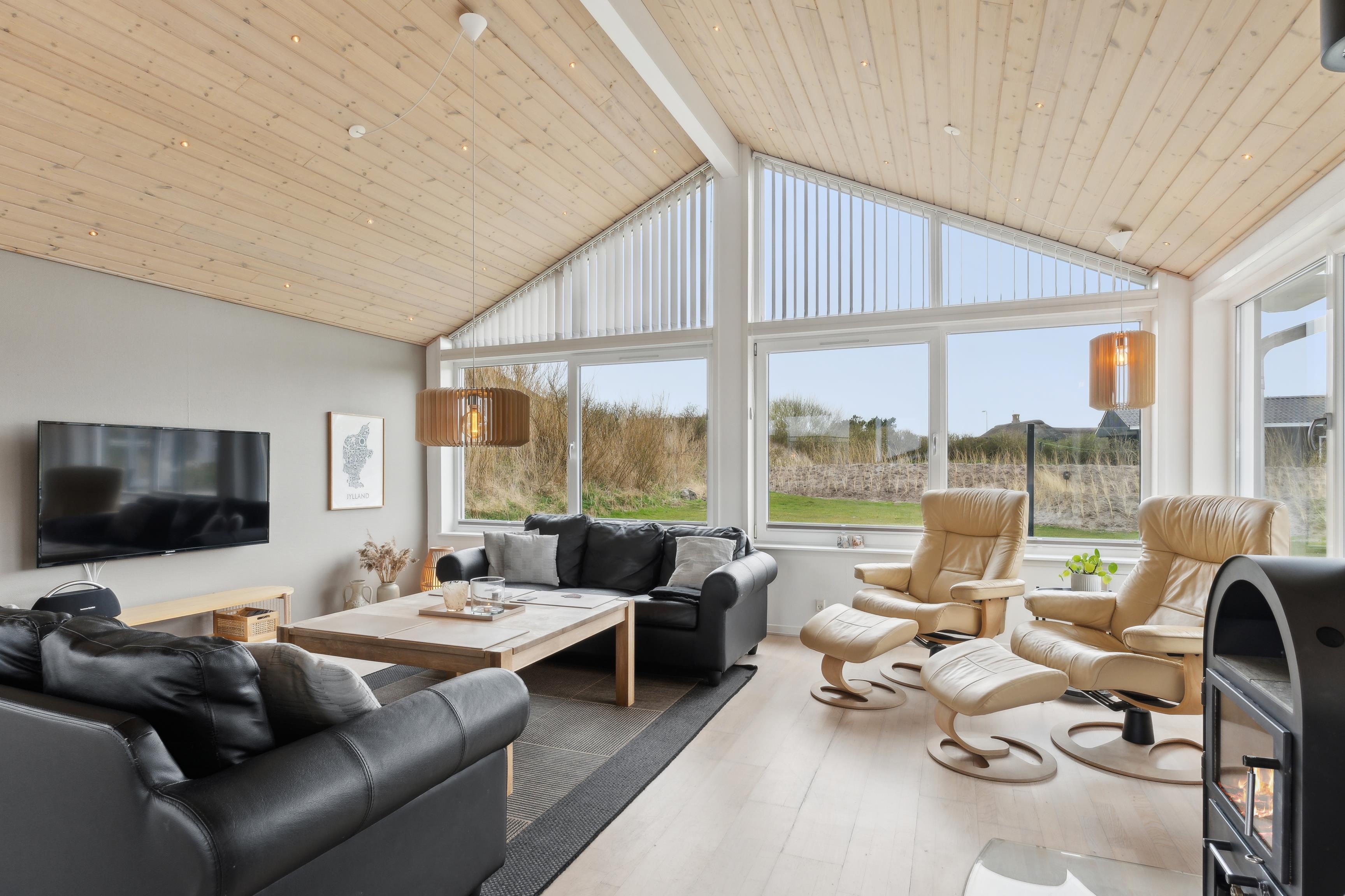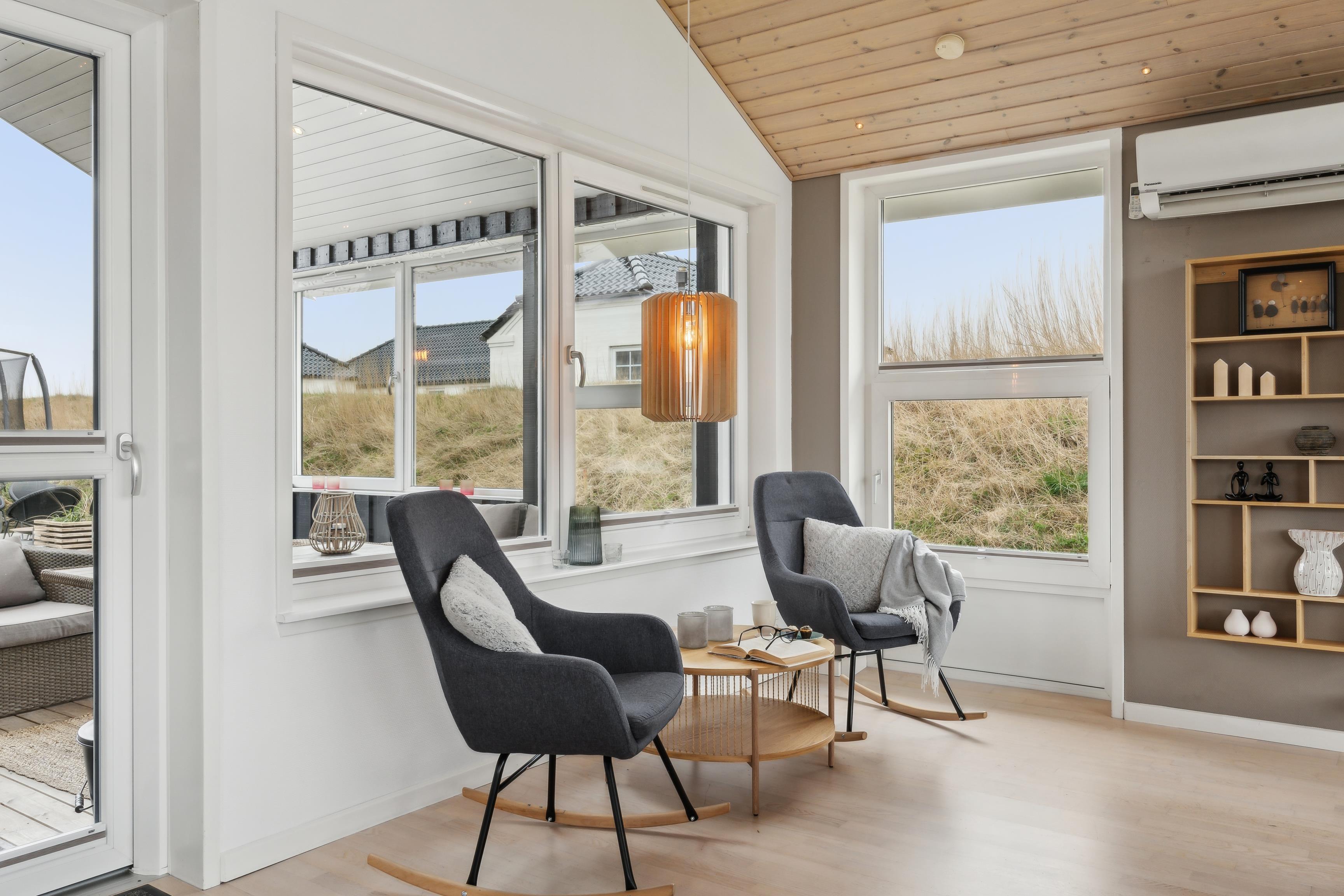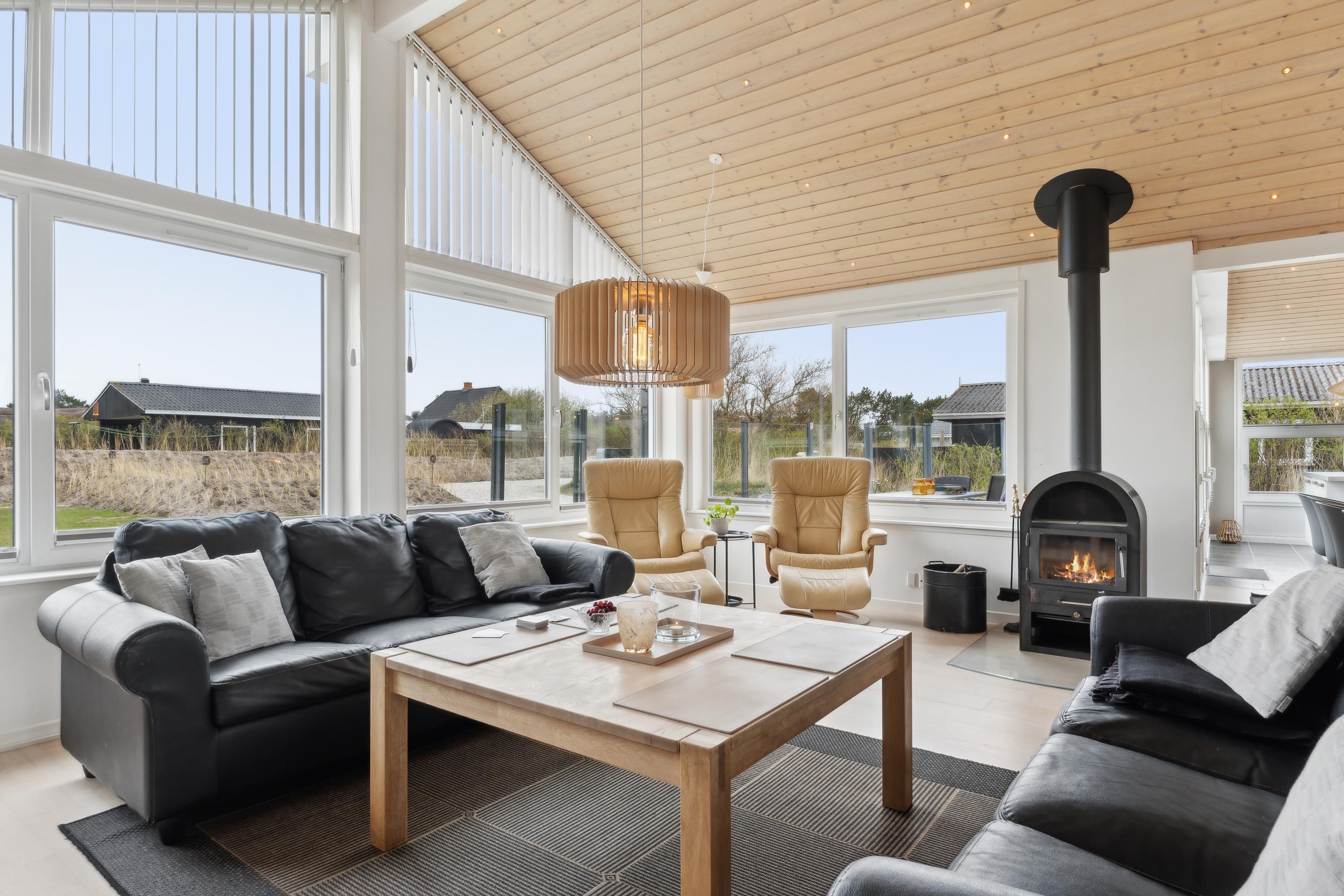 Det velindrettede sommerhus har en varm og indbydende stemning med højt til loftet og store vinduer, der lader lyset strømme ind og skaber en ægte feriefornemmelse.