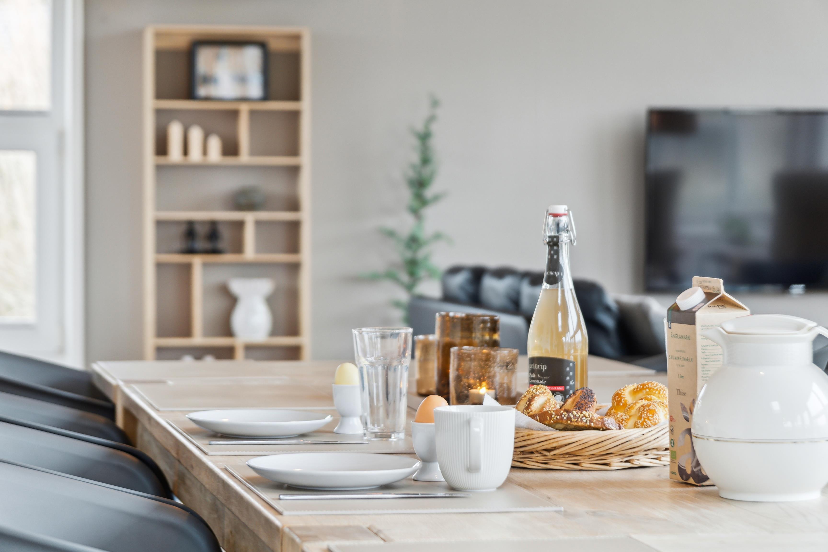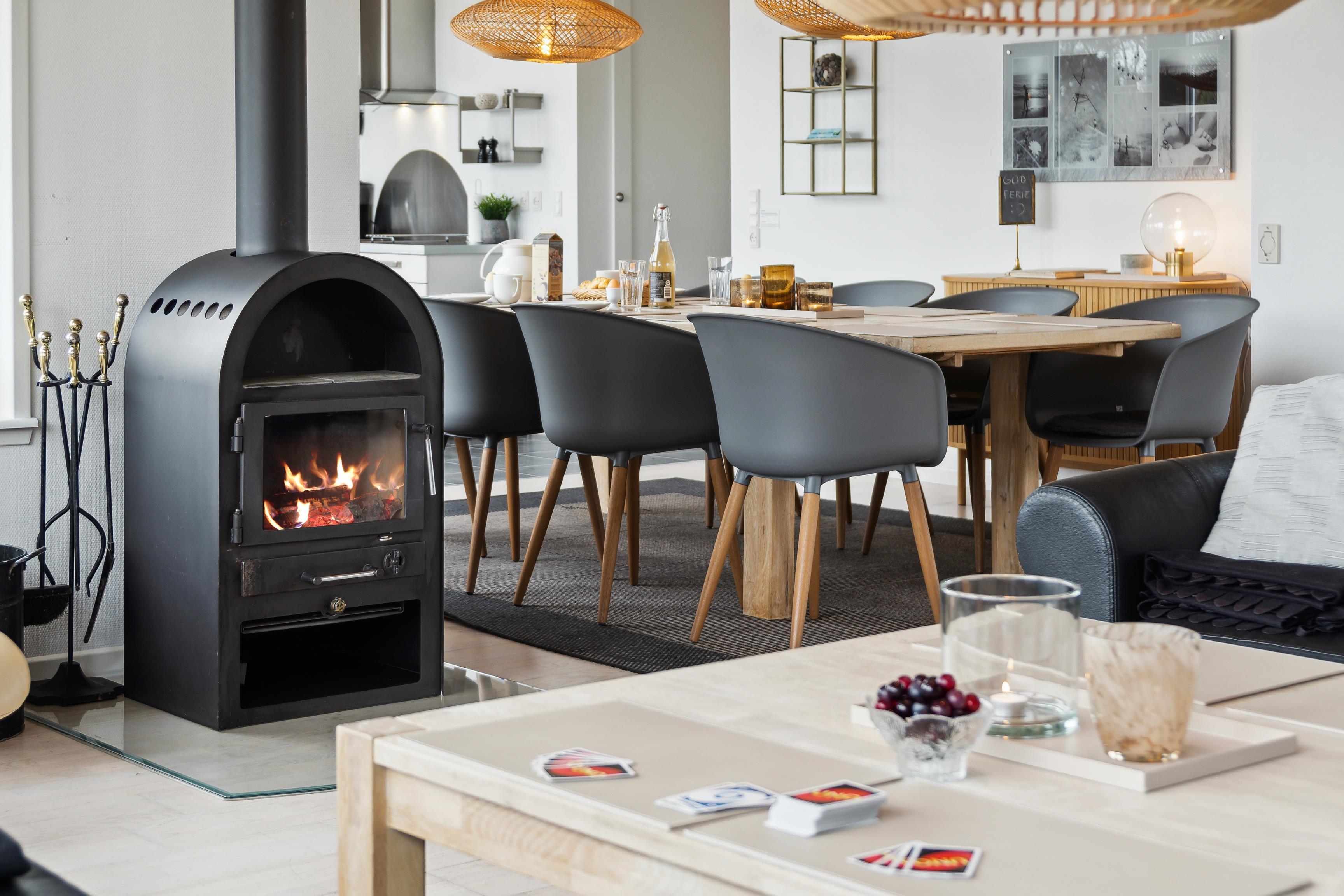 Veludstyret køkken, stue og spiseområde er samlet i ét stort alrum – perfekt til kvalitetstid med madlavning, brætspil eller filmaftener. Via Chromecast kan I streame jeres yndlingsfilm, mens brændeovnen knitrer i baggrunden og spreder hygge.