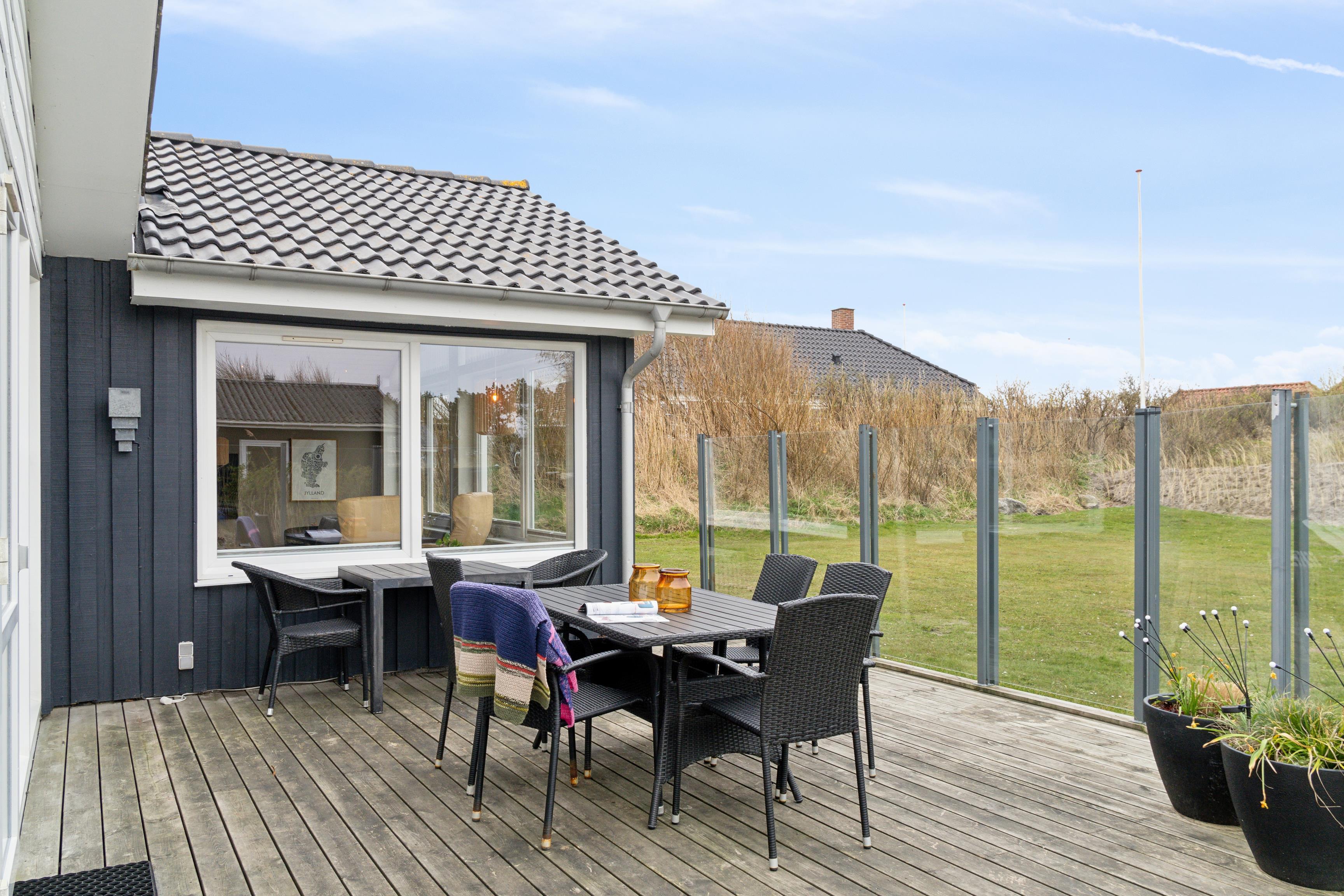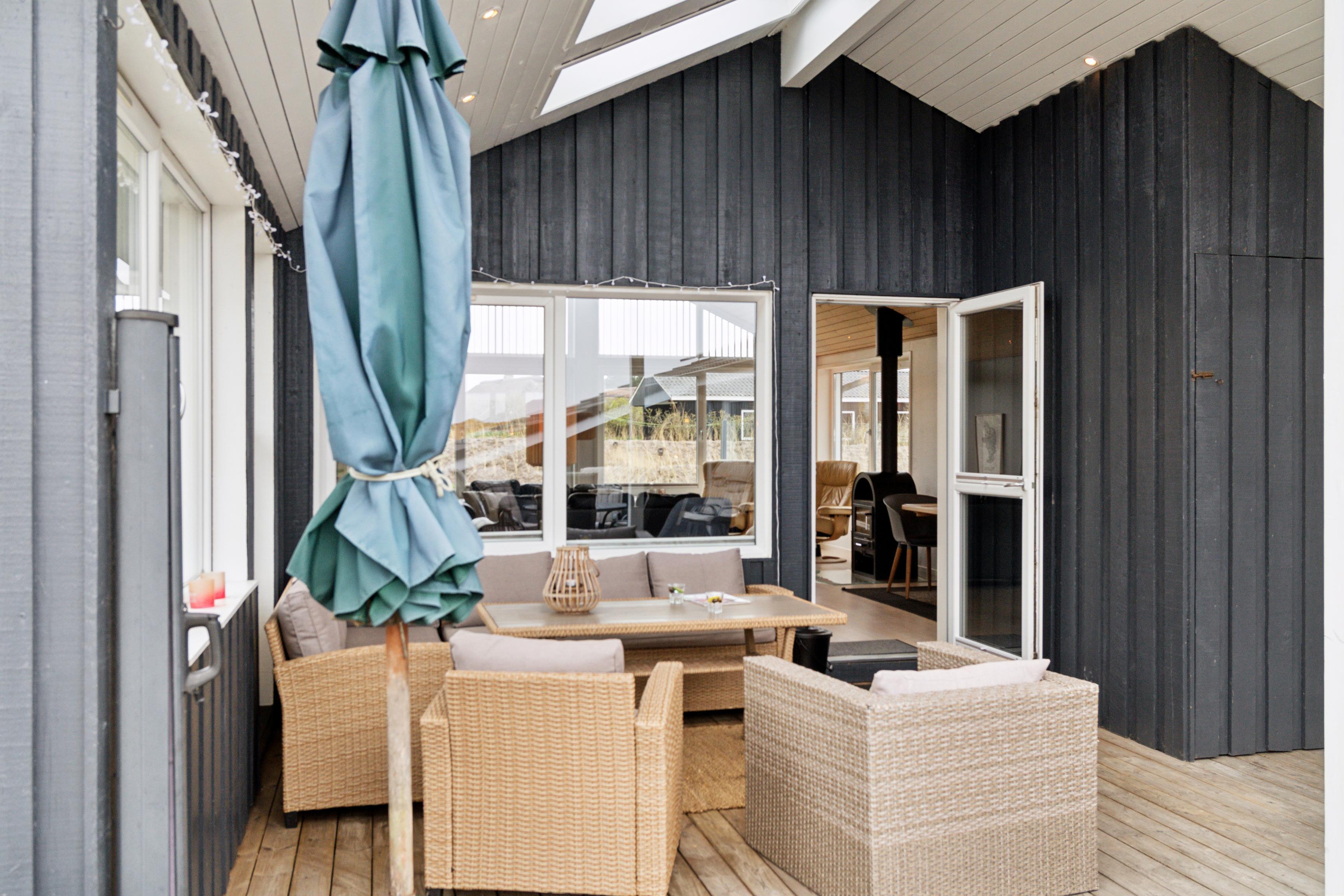 Rundt om huset ligger en rummelig træterrasse, hvor I kan nyde solen på liggestolene eller samles til grillmiddage under åben himmel.