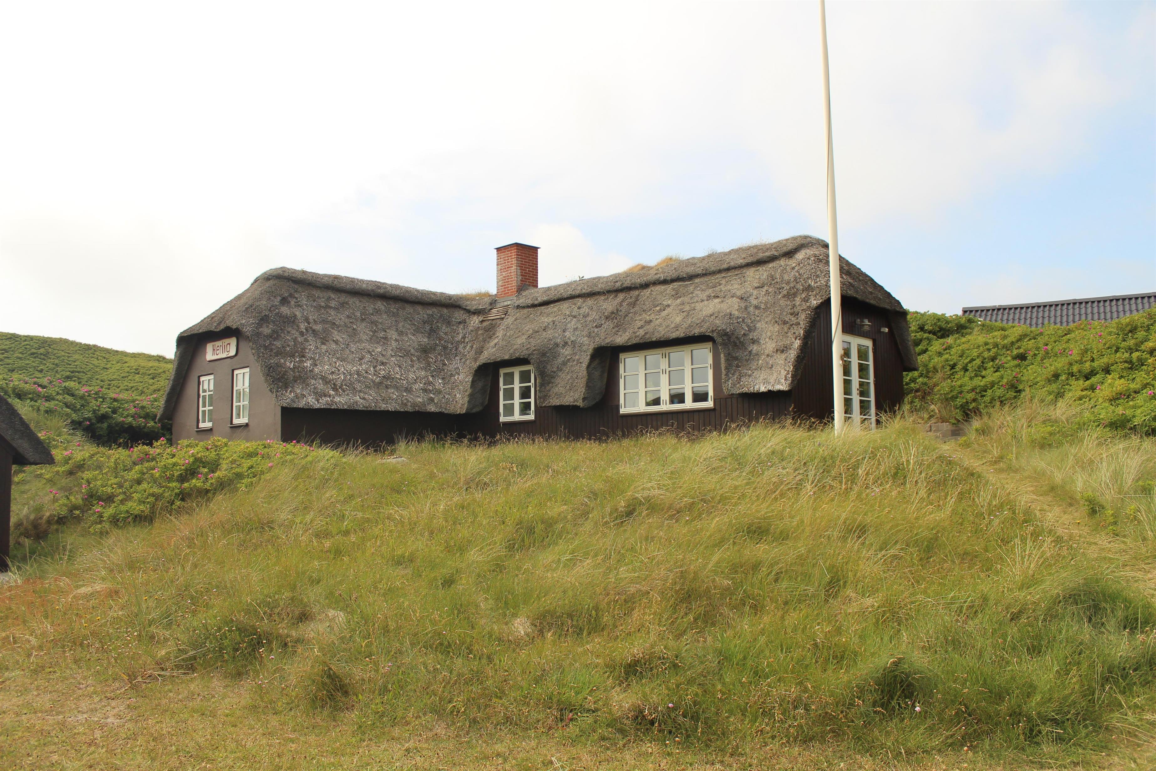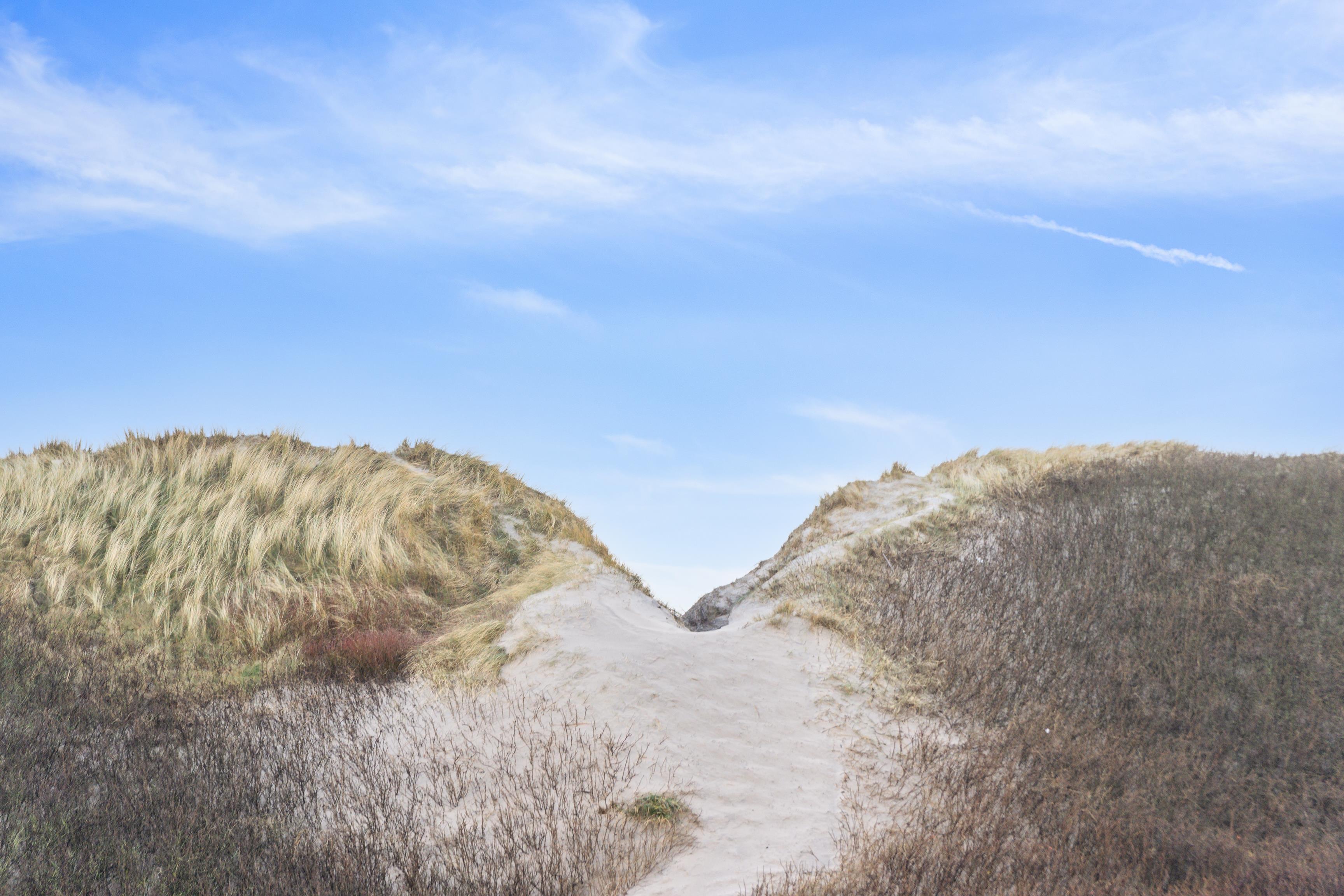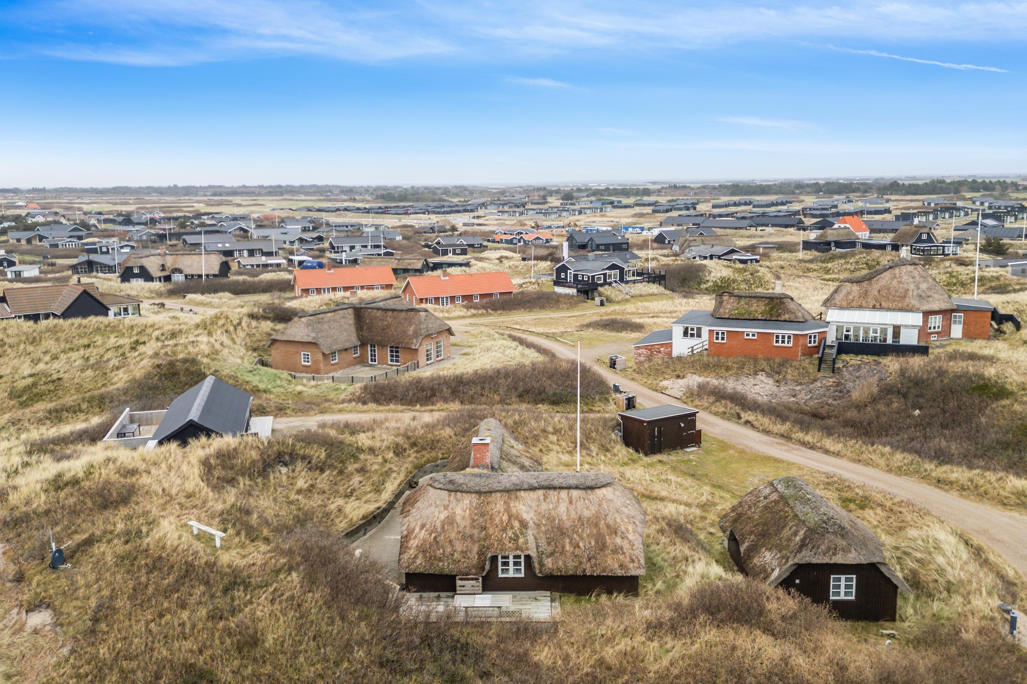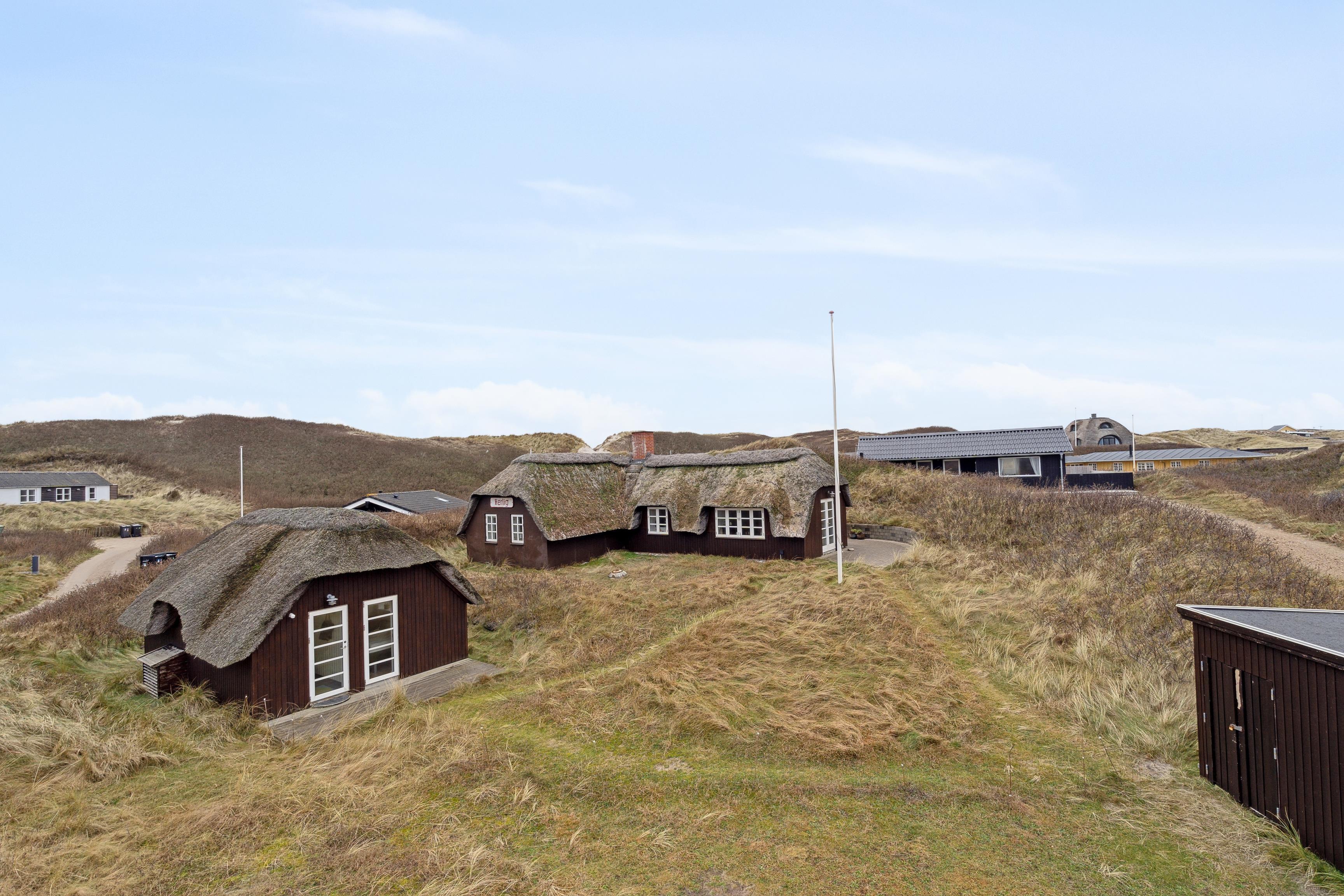 En smuk terrasse omgiver huset på tre sider, hvilket sikrer, at du altid finder et solrigt sted eller et skyggefuldt tilflugtssted nær Vesterhavet. Fra en lille bænk på en tilstødende klit kan du se solopgangen over Ringkøbing Fjord eller nyde solnedgangen over Vesterhavet. Klitten giver naturlig beskyttelse mod vinden, hvilket gør den ideel for familier med små børn, der kan lege trygt udendørs.