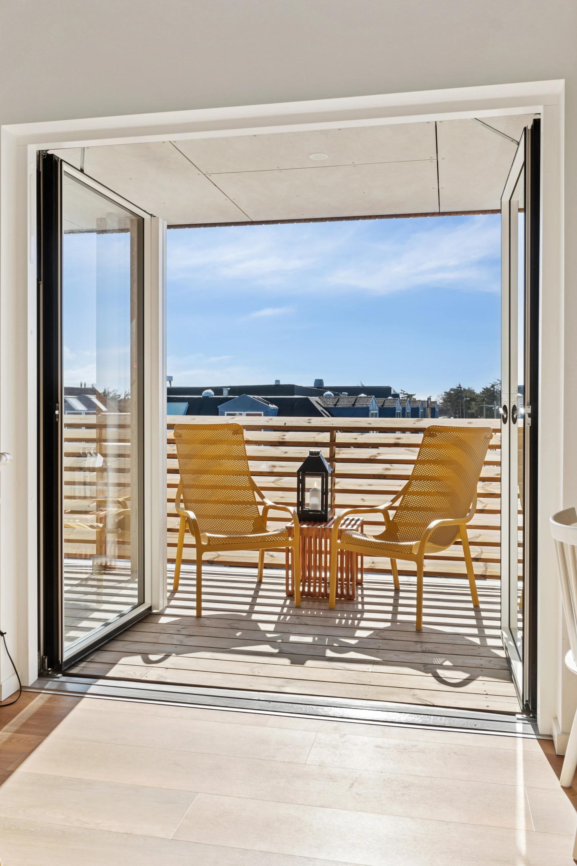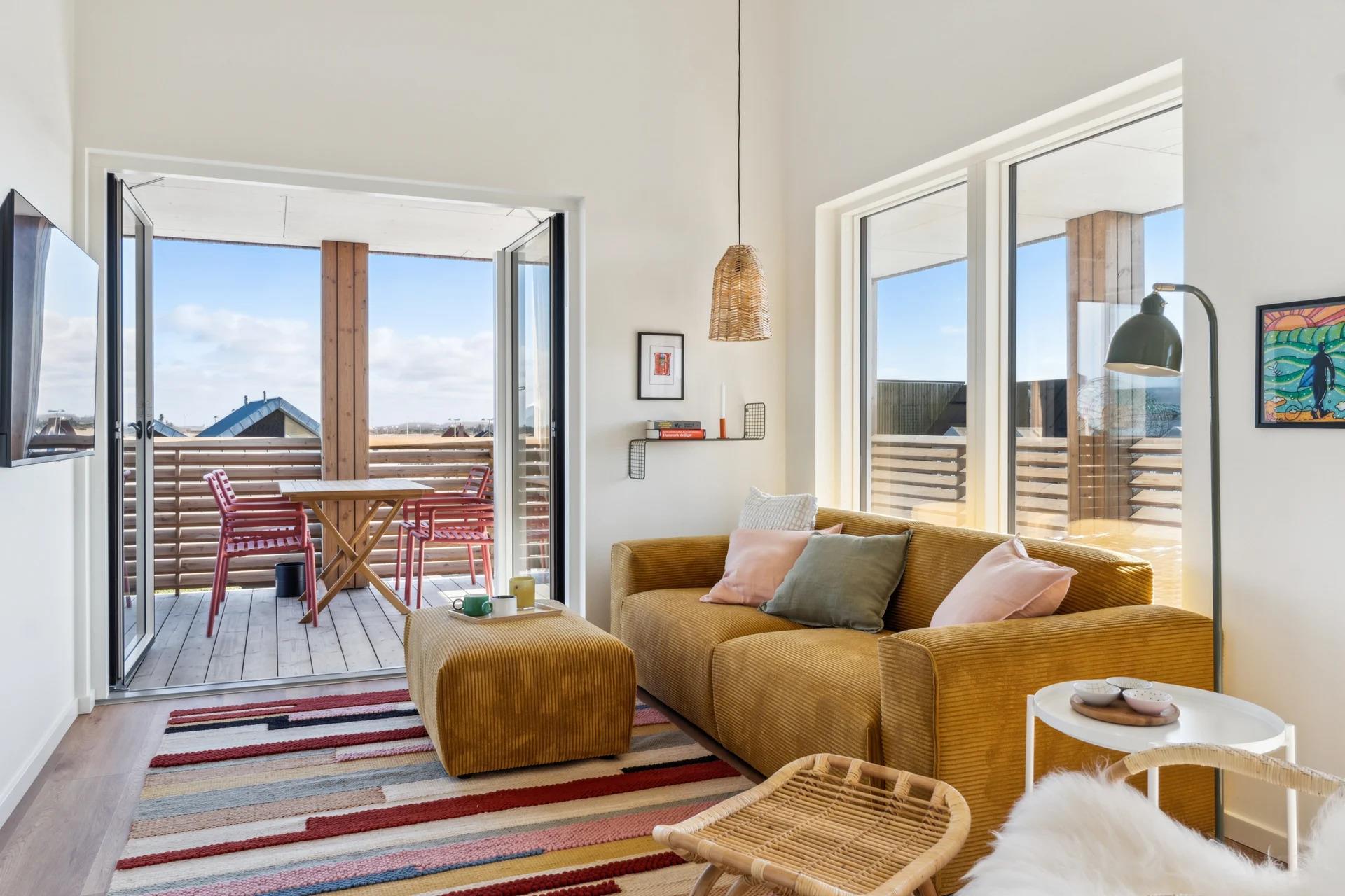 Moderne ferielejlighed i Søndervig med udsigt over Ringkøbing Fjord og tæt på strand og byliv.