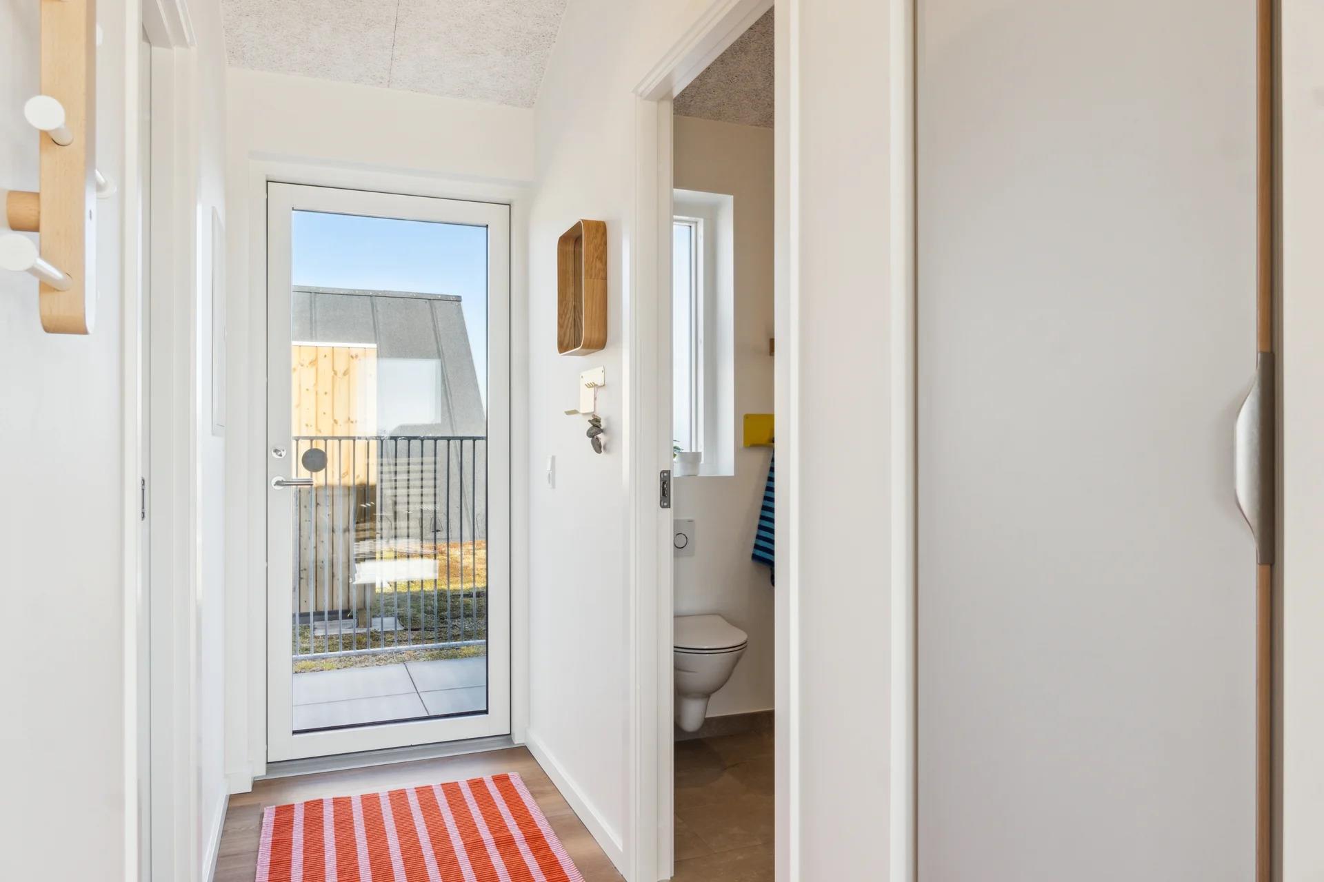 Lejligheden ligger på første sal og har en lys og indbydende indretning af høj kvalitet. Den består af to soveværelser med komfortable senge, et moderne badeværelse med gulvvarme og et åbent, fuldt udstyret køkken med opvaskemaskine. Køkkenet går over i stuen, hvor I finder et smart-tv med streamingtjenester og gratis wifi – perfekt til hyggelige aftener i huset. Fra stuen har du direkte adgang til en solrig altan med havemøbler, hvor du kan nyde både din morgenkaffe og aftensolen. Fra den 35 m² store altan, hvoraf 18 m² er overdækket, har du en smuk udsigt over Ringkøbing Fjord.