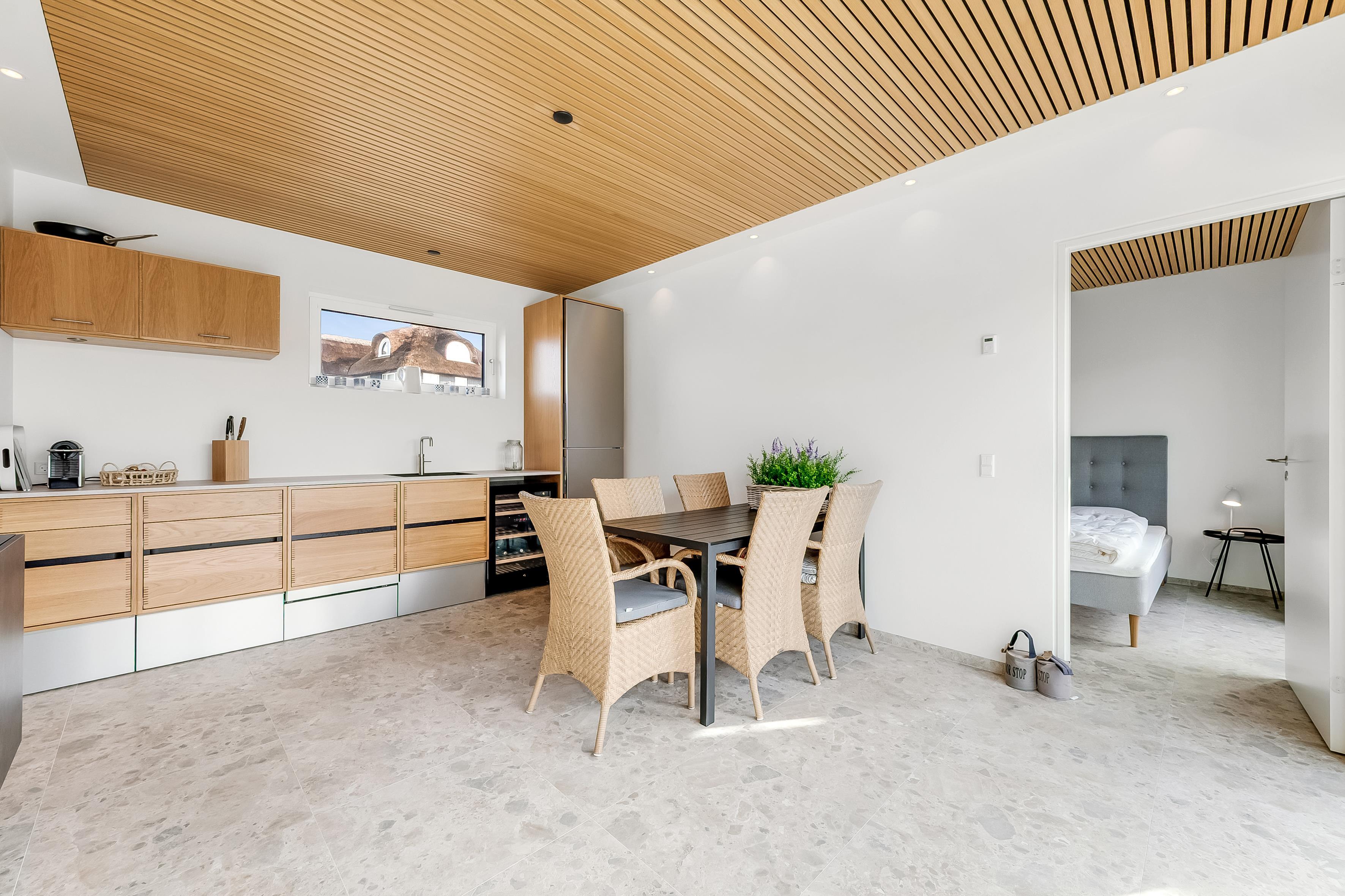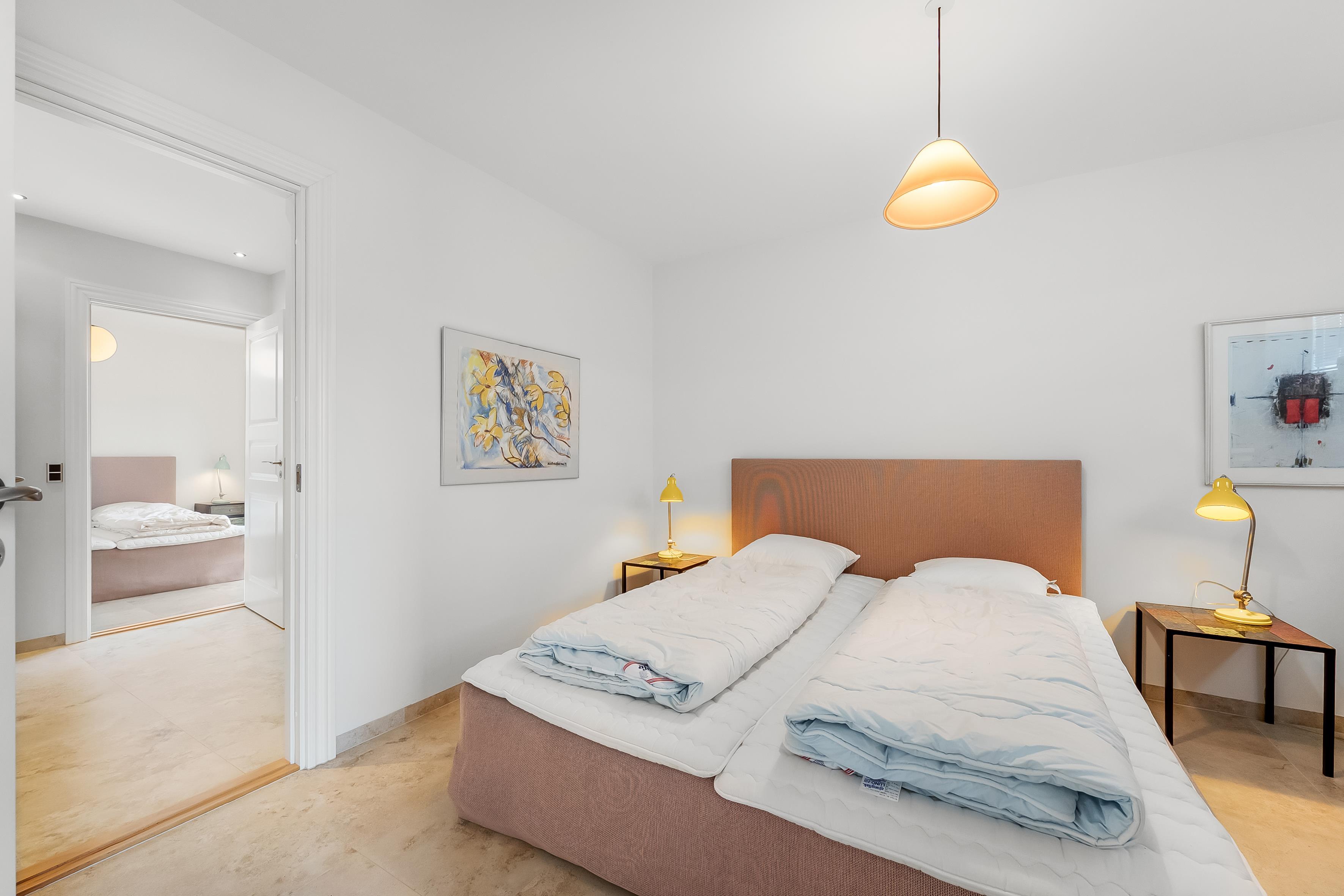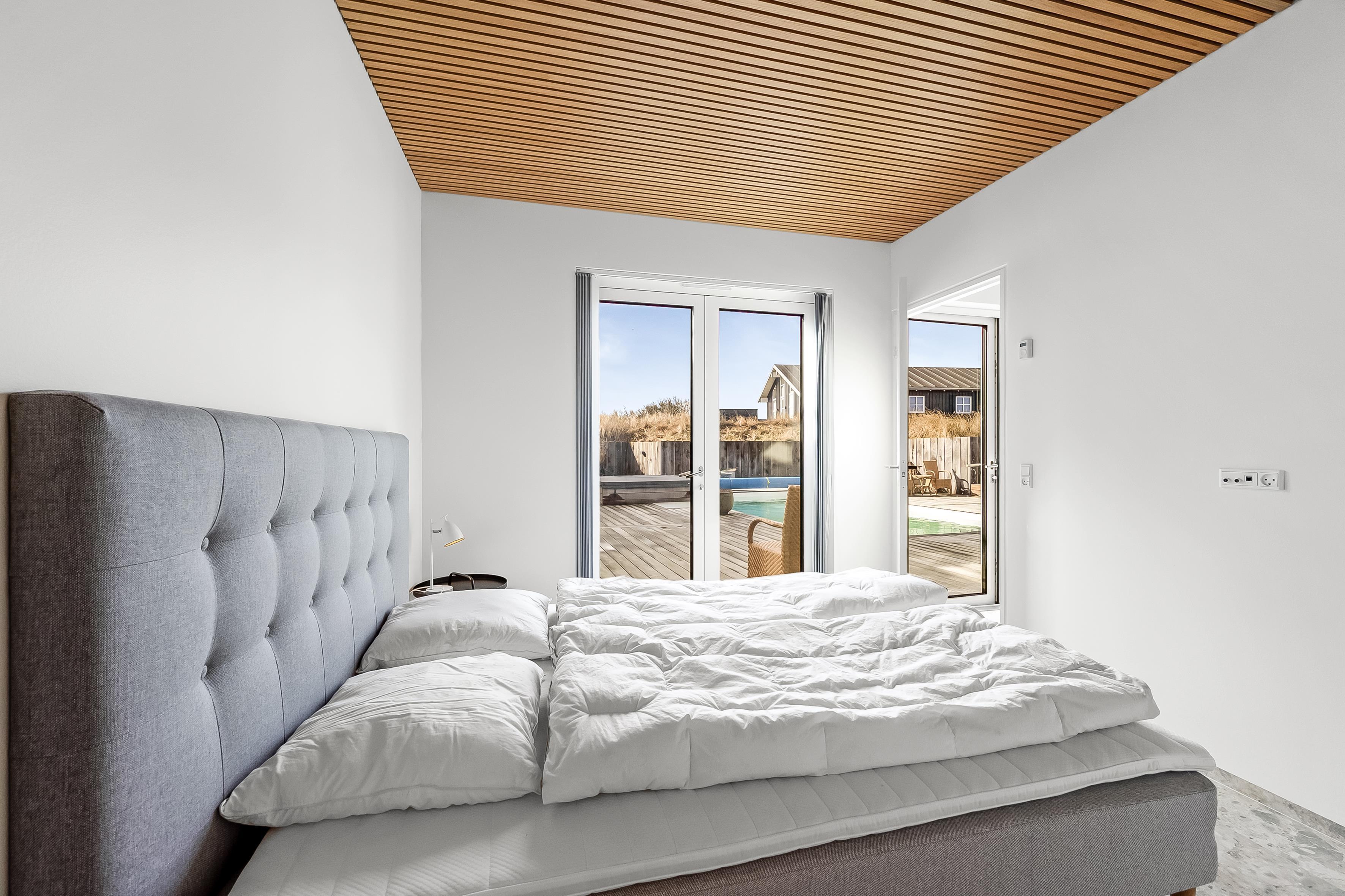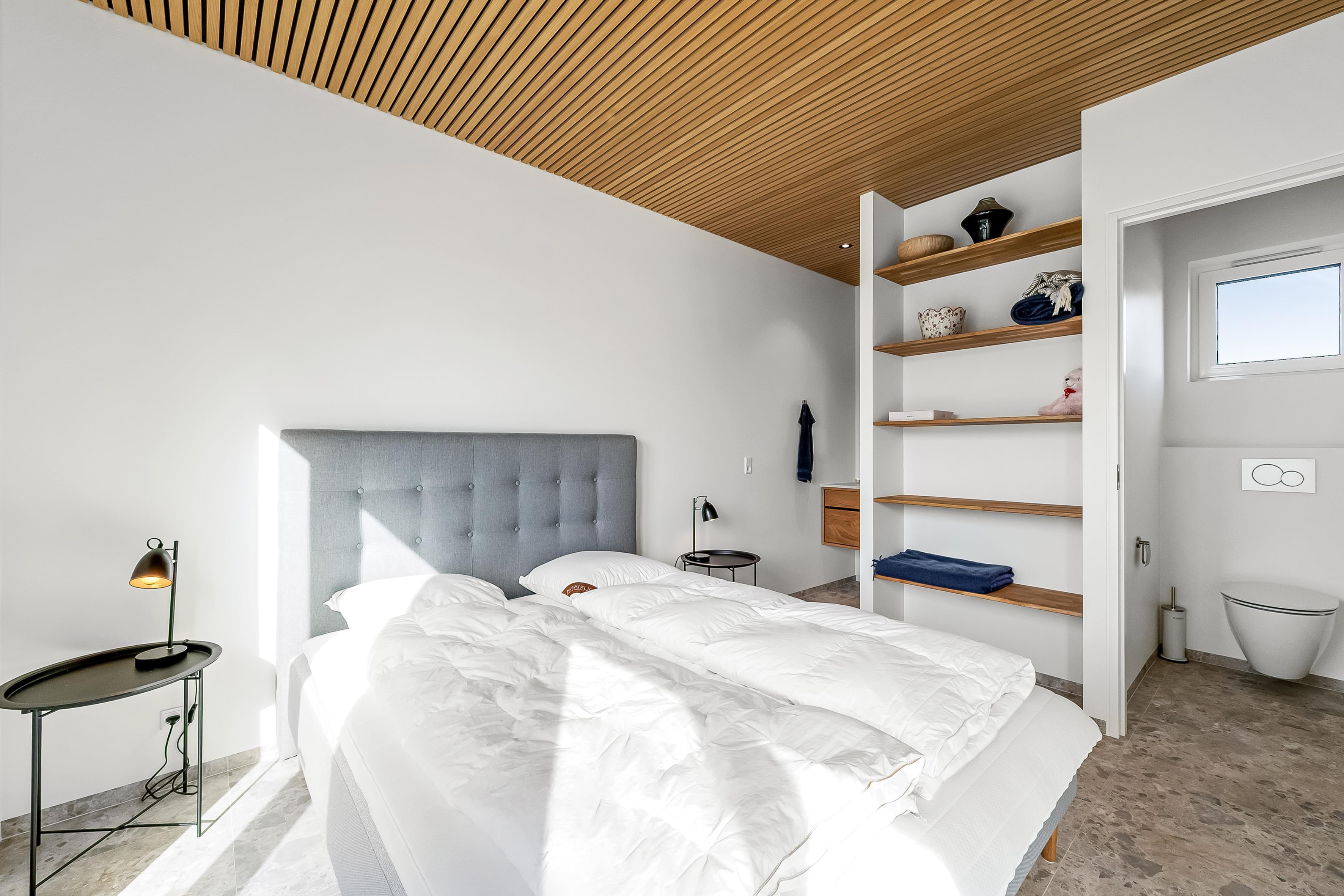 Dette rummelige feriehus strækker sig over 240 m² og tilbyder tre luksuriøse soveværelser i hovedhuset, alle møbleret med komfortable dobbeltsenge. Det ene soveværelse har eget badeværelse med bruser og badekar samt et walk-in-garderobe, mens de to andre deler et stort badeværelse med bruser. Hele huset har gulvvarme, drevet af en energieffektiv varmepumpe, der sikrer optimal komfort året rundt. Det separate gæstehus indeholder to ekstra soveværelser, hver med eget toilet og bruser. En fælles opholdsstue omfatter et tekøkken med køleskab, vinkøleskab og opvaskemaskine; madlavning er dog ikke tilladt i dette tekøkken.