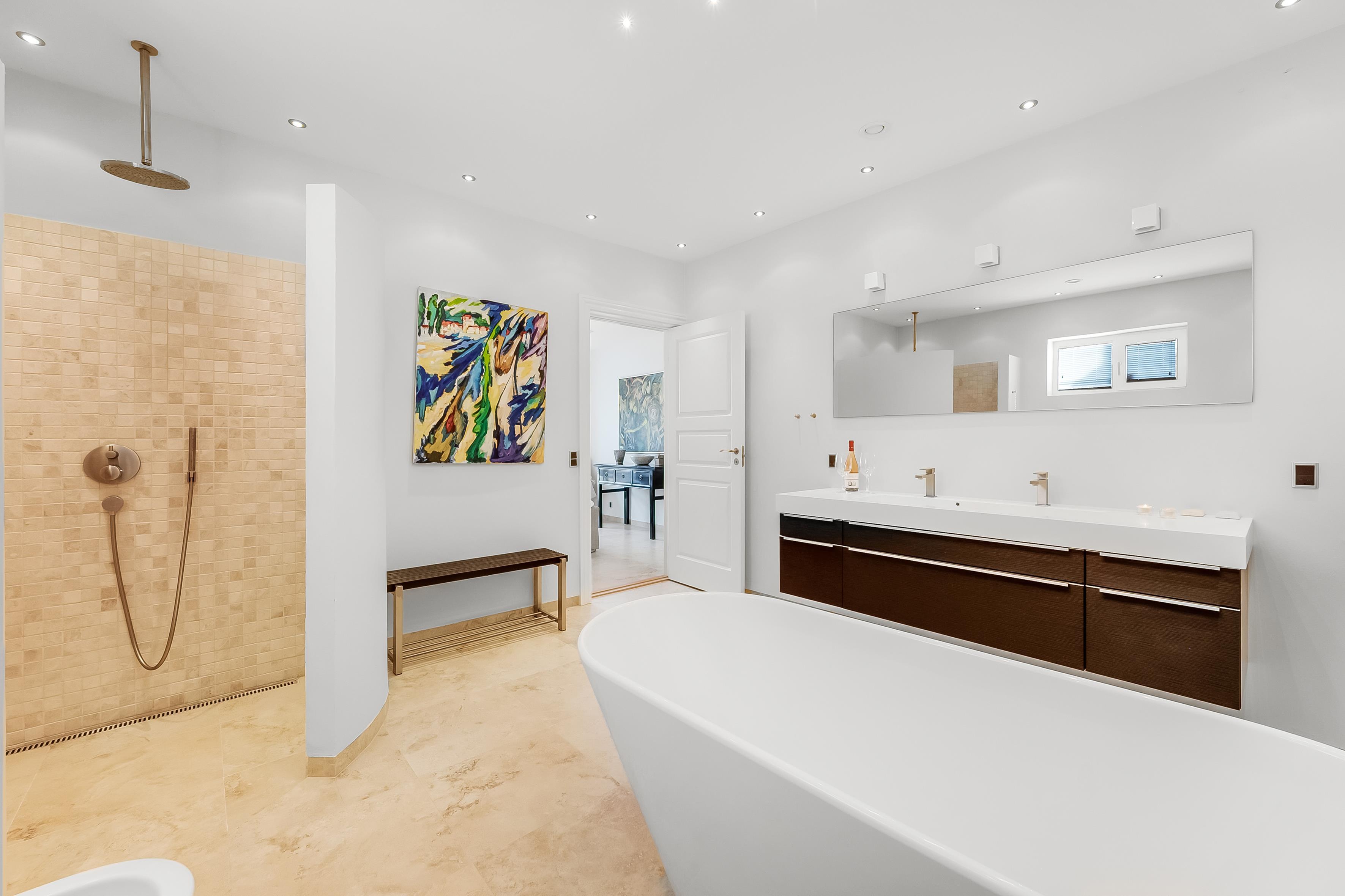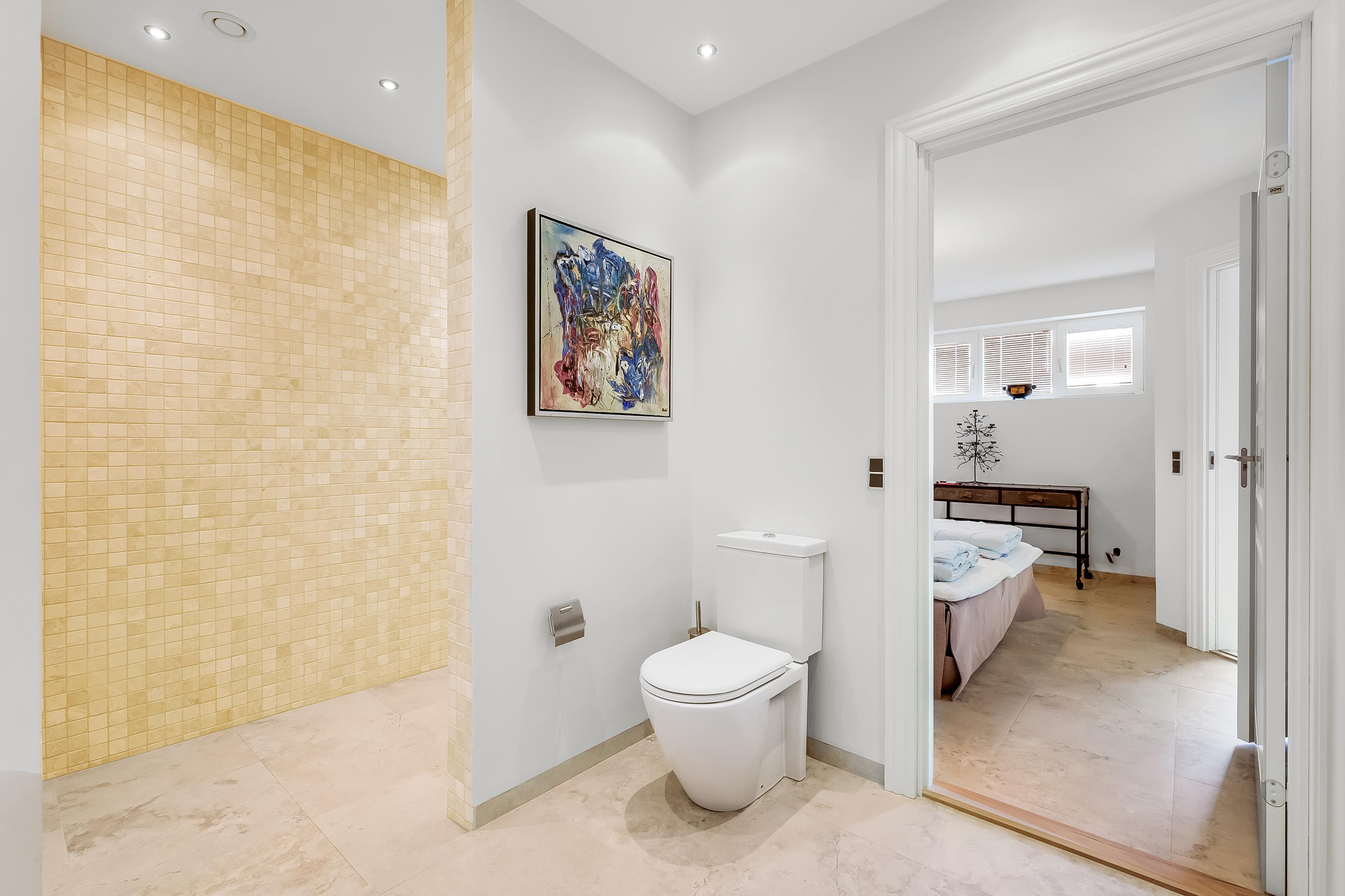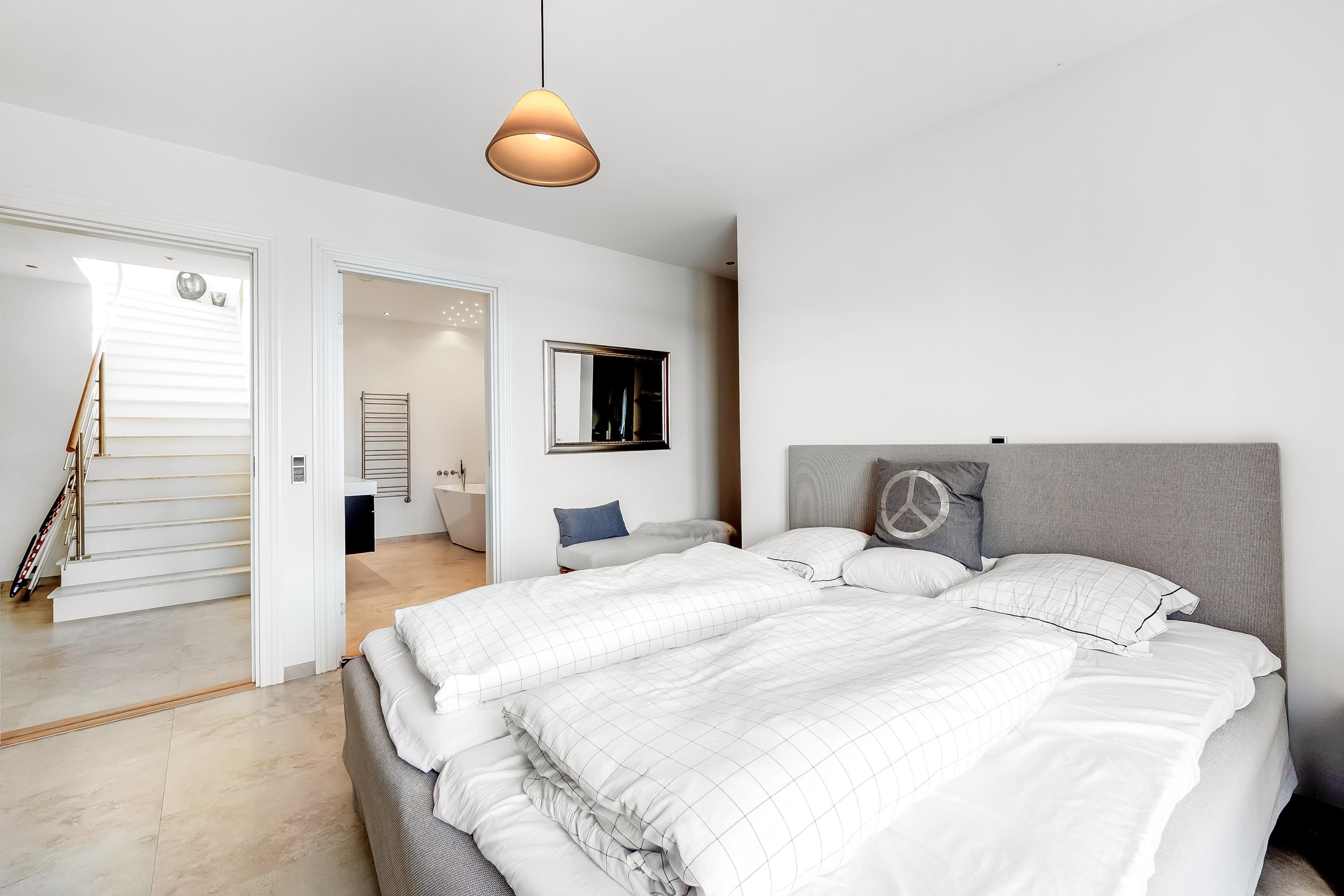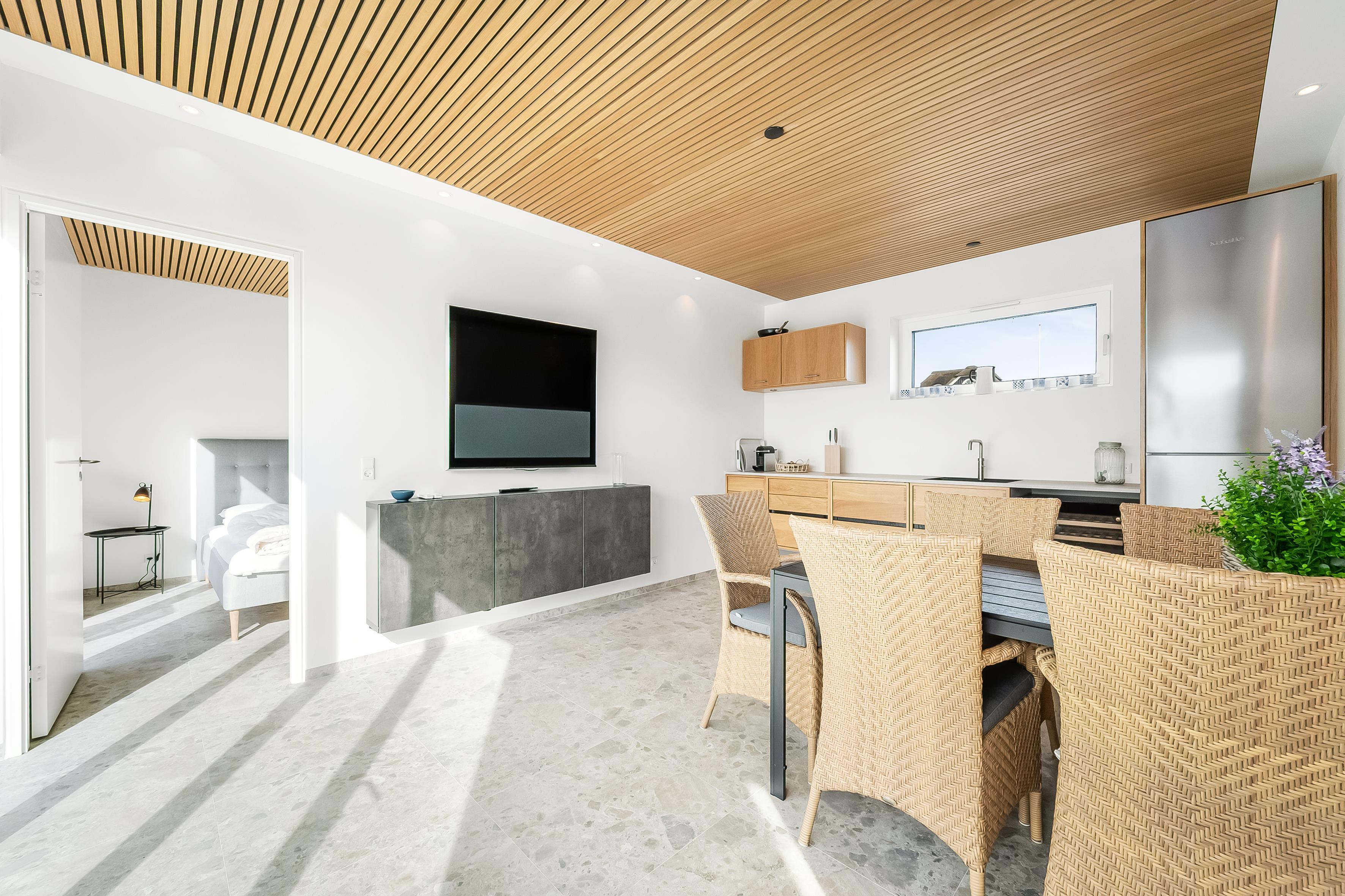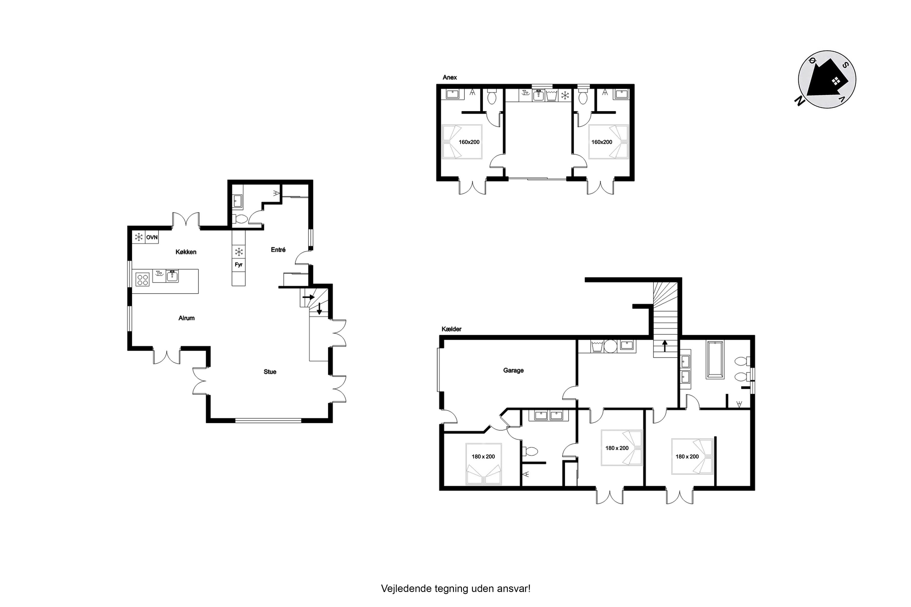 Dette rummelige feriehus strækker sig over 240 m² og tilbyder tre luksuriøse soveværelser i hovedhuset, alle møbleret med komfortable dobbeltsenge. Det ene soveværelse har eget badeværelse med bruser og badekar samt et walk-in-garderobe, mens de to andre deler et stort badeværelse med bruser. Hele huset har gulvvarme, drevet af en energieffektiv varmepumpe, der sikrer optimal komfort året rundt. Det separate gæstehus indeholder to ekstra soveværelser, hver med eget toilet og bruser. En fælles opholdsstue omfatter et tekøkken med køleskab, vinkøleskab og opvaskemaskine; madlavning er dog ikke tilladt i dette tekøkken.