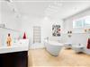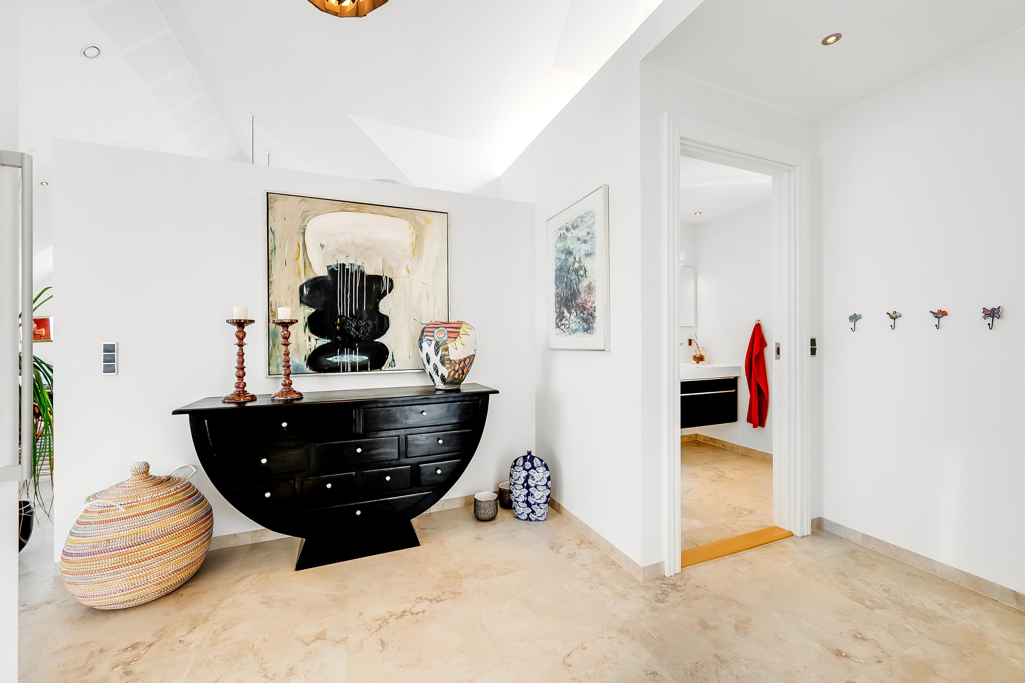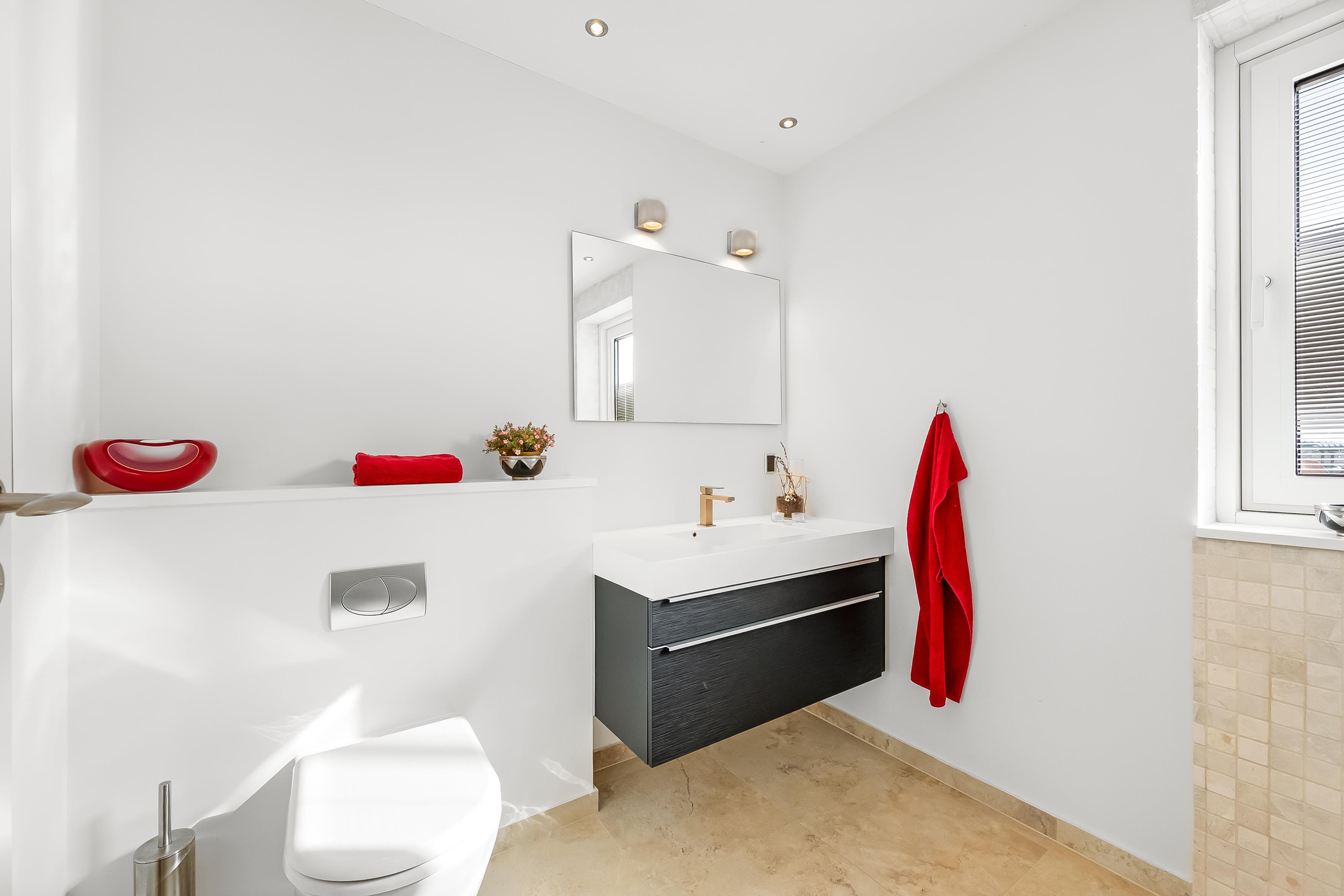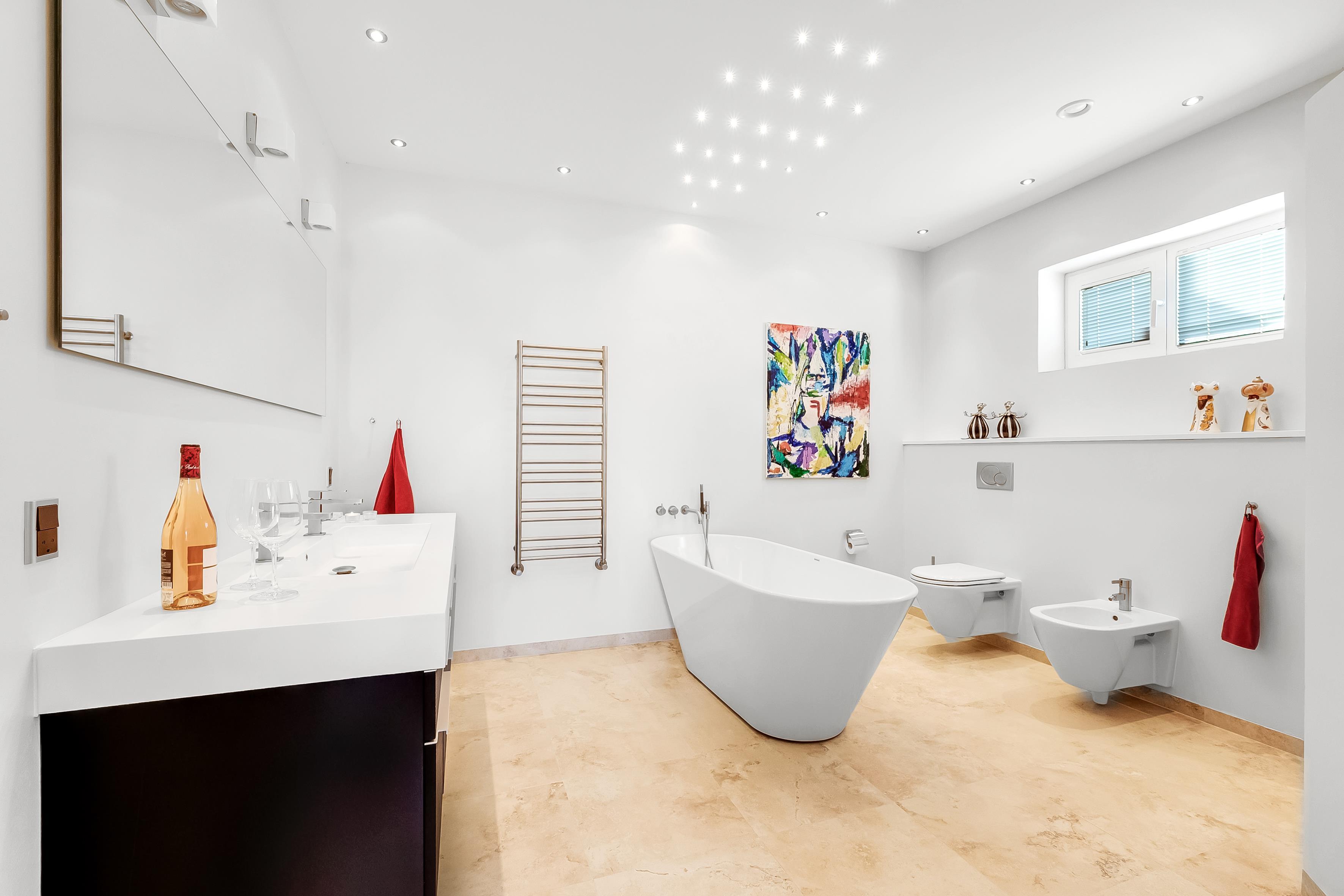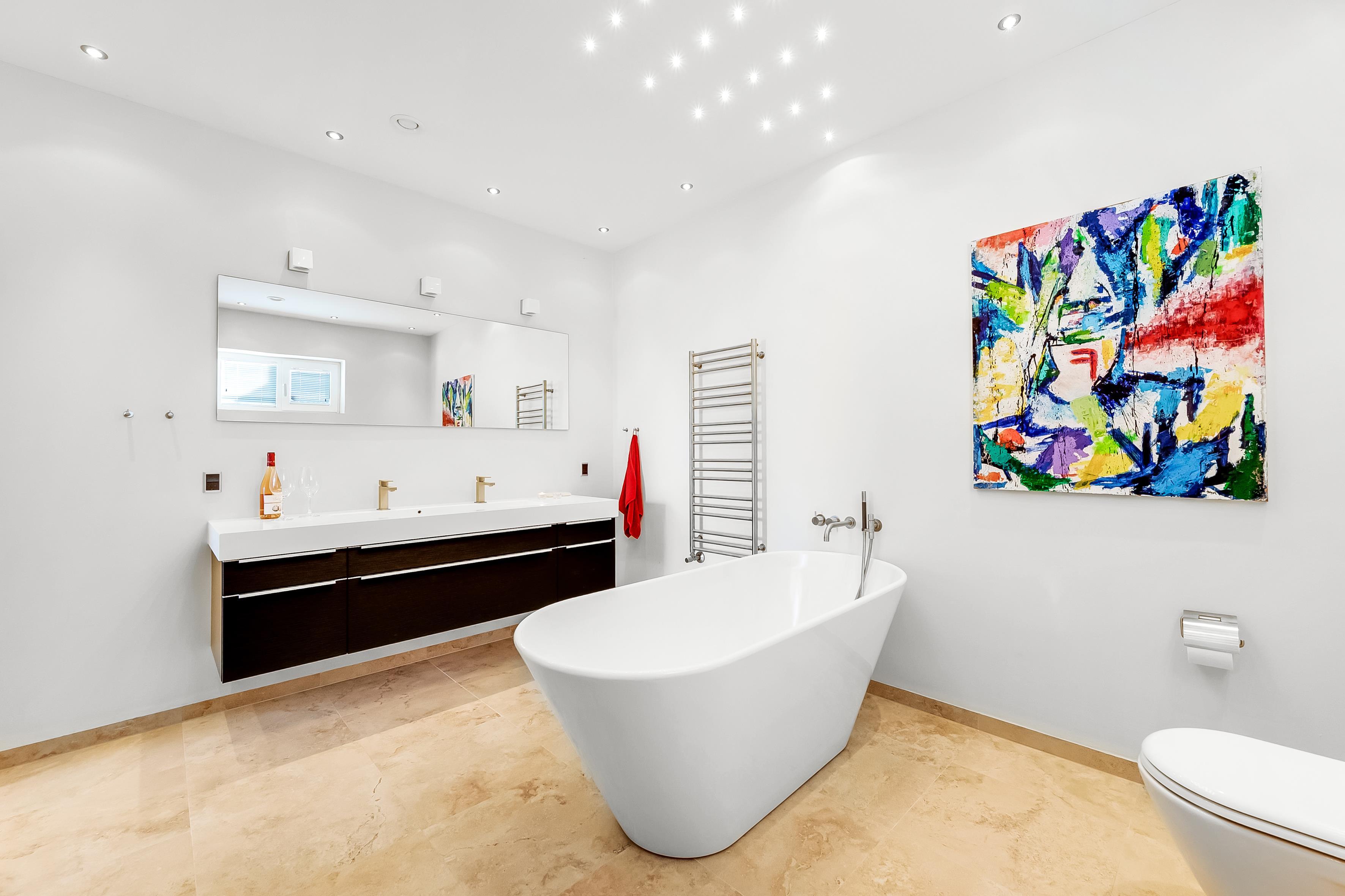 Dette rummelige feriehus strækker sig over 240 m² og tilbyder tre luksuriøse soveværelser i hovedhuset, alle møbleret med komfortable dobbeltsenge. Det ene soveværelse har eget badeværelse med bruser og badekar samt et walk-in-garderobe, mens de to andre deler et stort badeværelse med bruser. Hele huset har gulvvarme, drevet af en energieffektiv varmepumpe, der sikrer optimal komfort året rundt. Det separate gæstehus indeholder to ekstra soveværelser, hver med eget toilet og bruser. En fælles opholdsstue omfatter et tekøkken med køleskab, vinkøleskab og opvaskemaskine; madlavning er dog ikke tilladt i dette tekøkken.