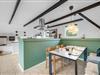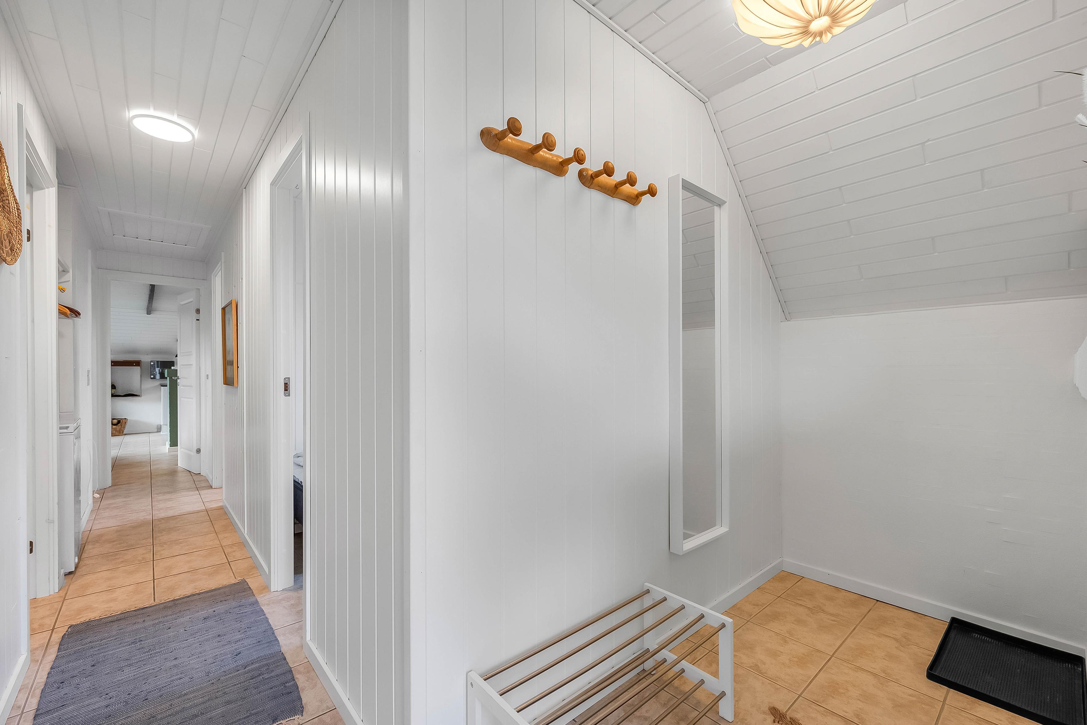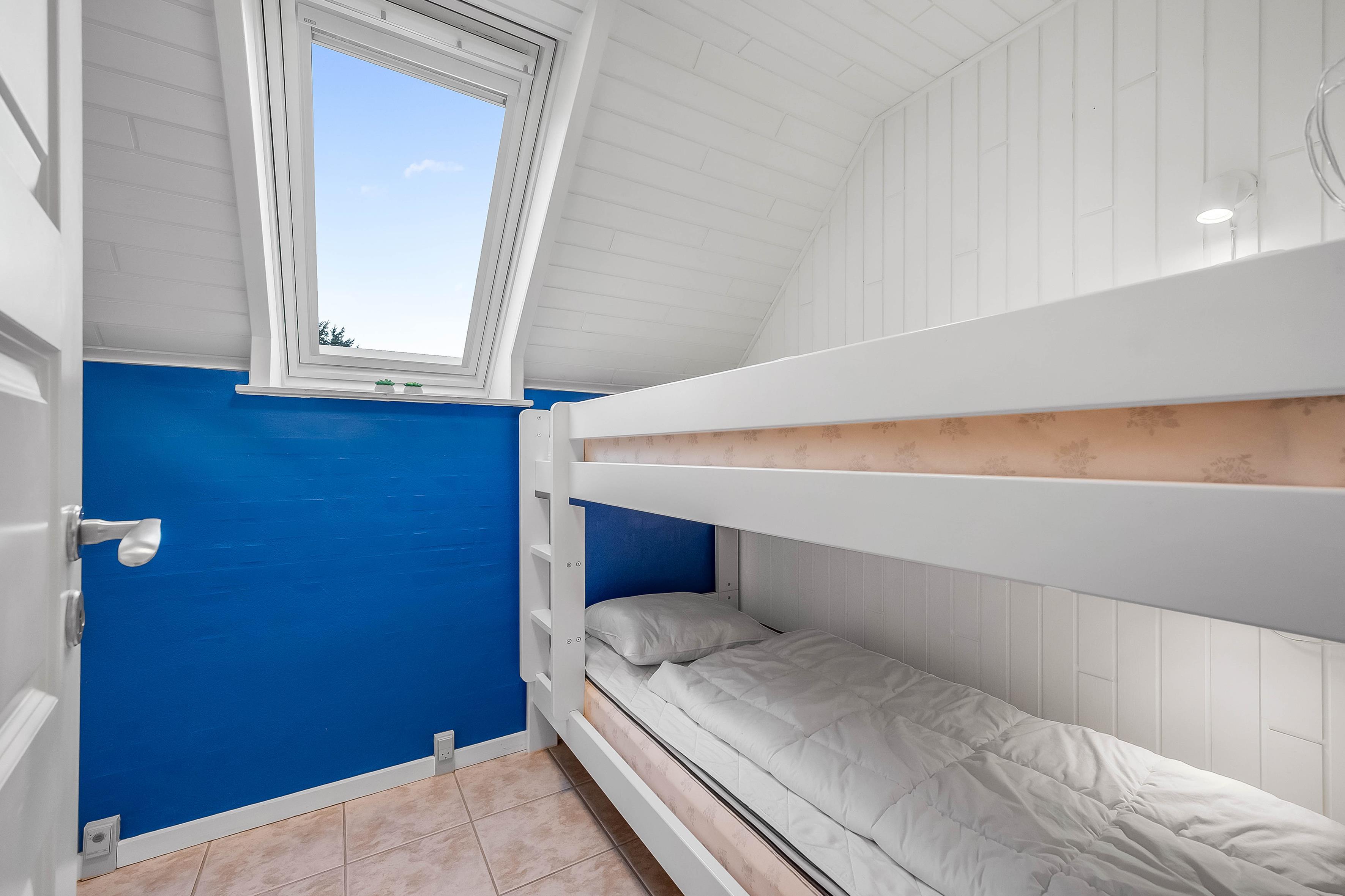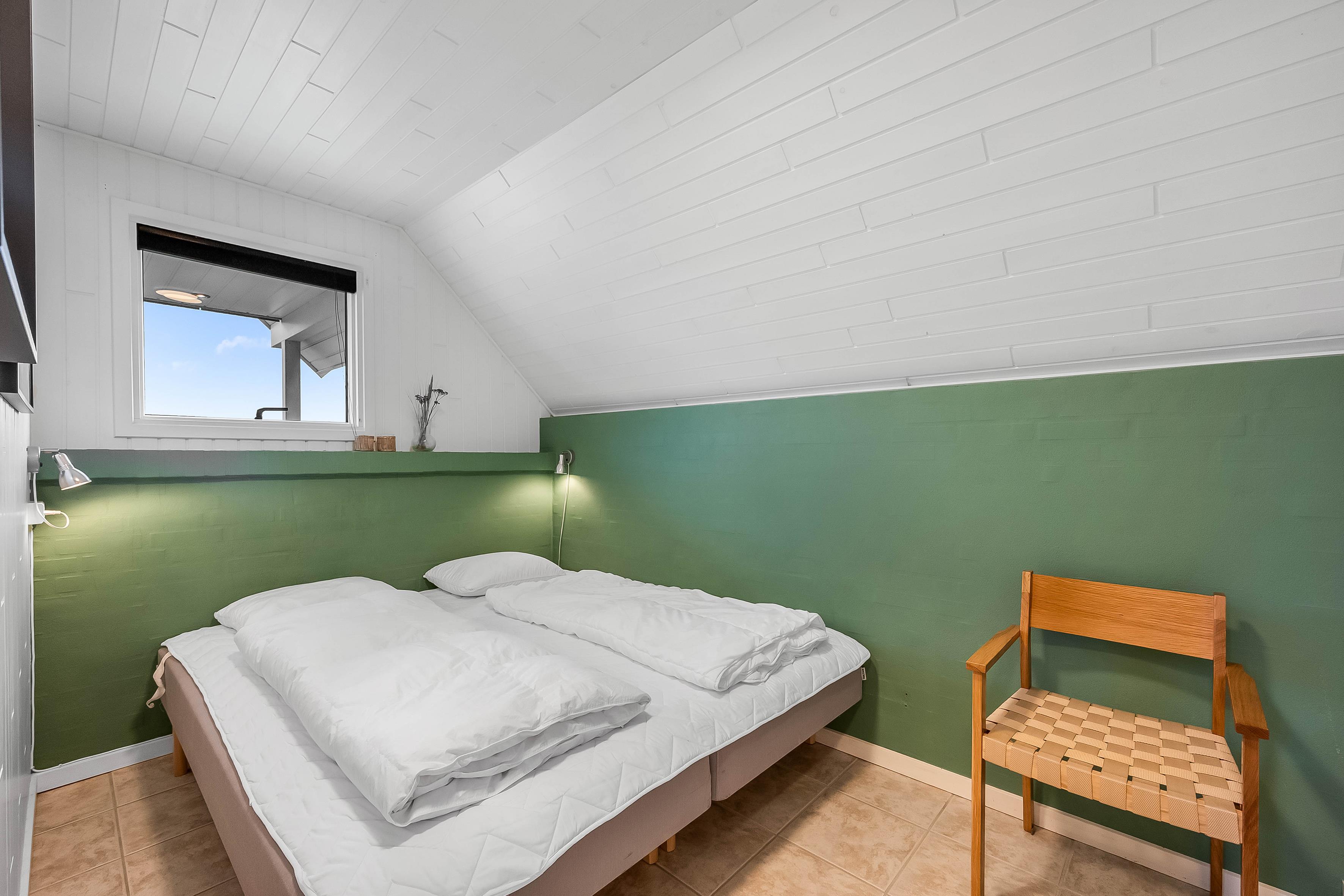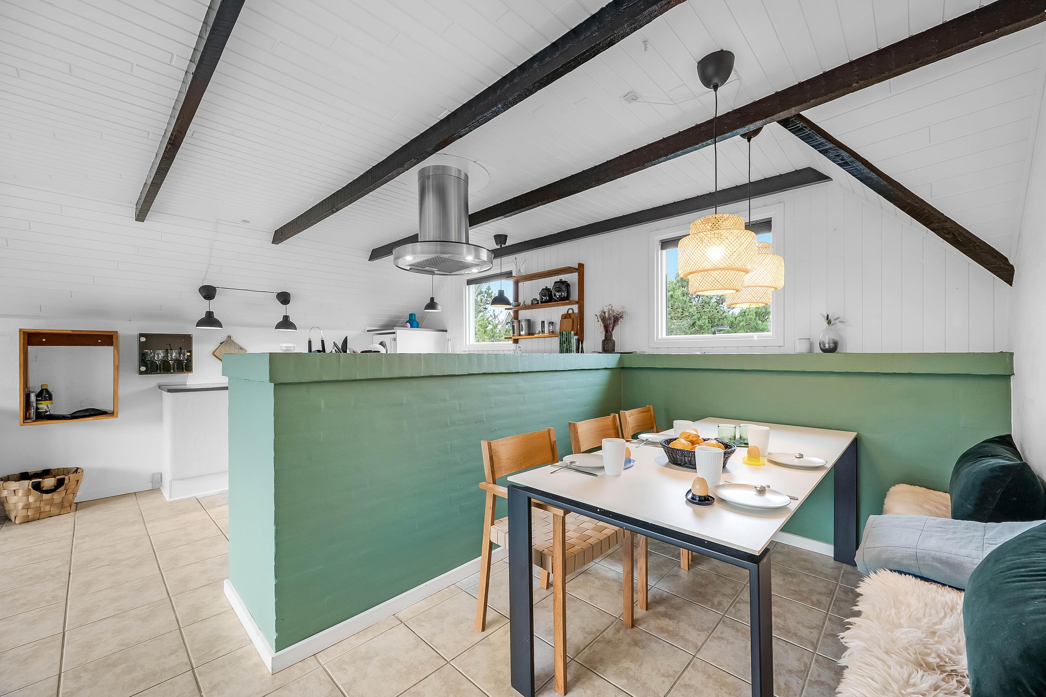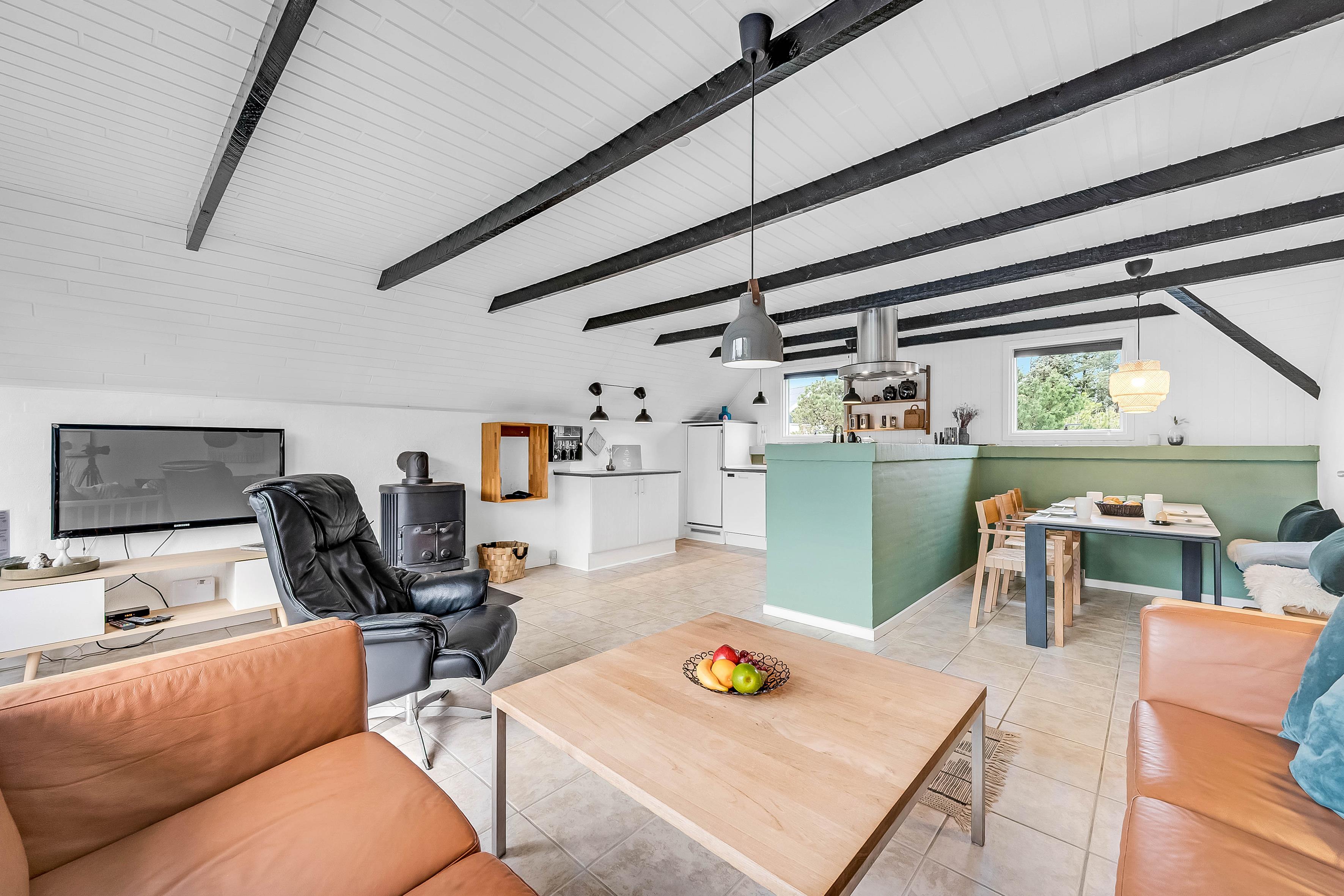 Husets hjerte er den kombinerede stue/spisestue med køkken og et stort vinduesparti, der skaber en lys og luftig atmosfære. Køkkenet er udstyret med komfur, opvaskemaskine og et 100-liters køleskab med en lille fryser. Der er et soveværelse med en dobbeltseng, et med to enkeltsenge og et med en køjeseng.