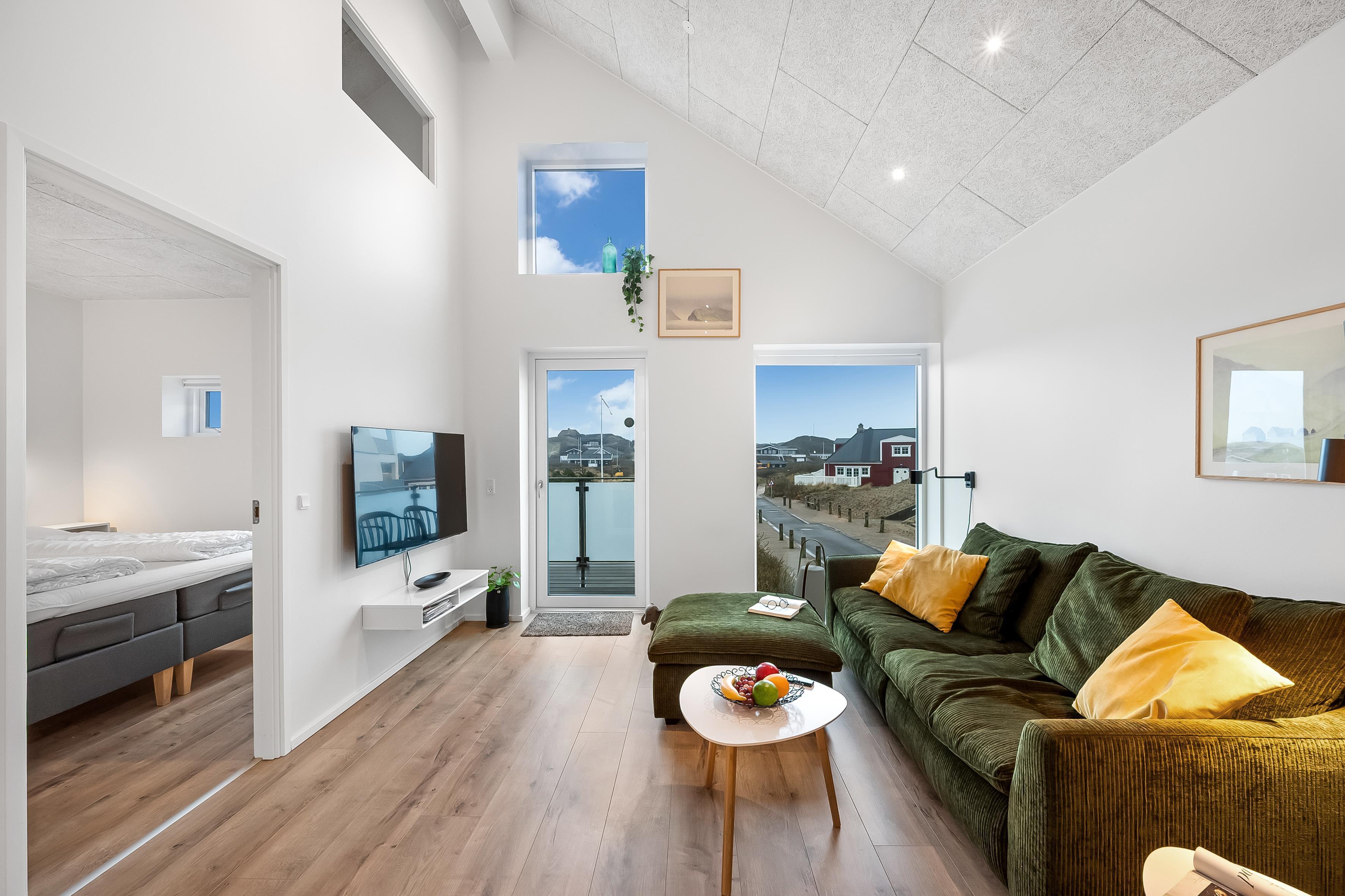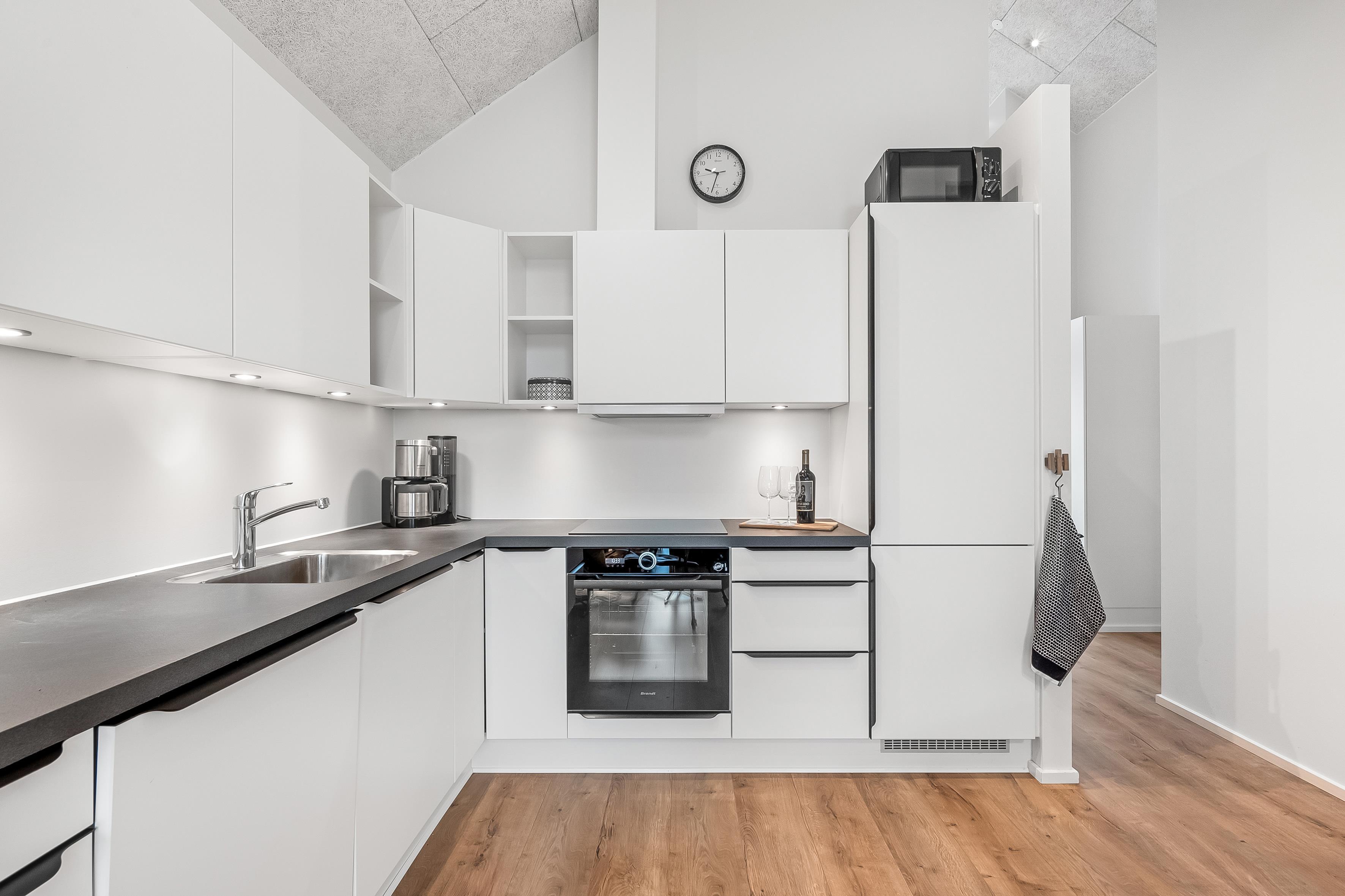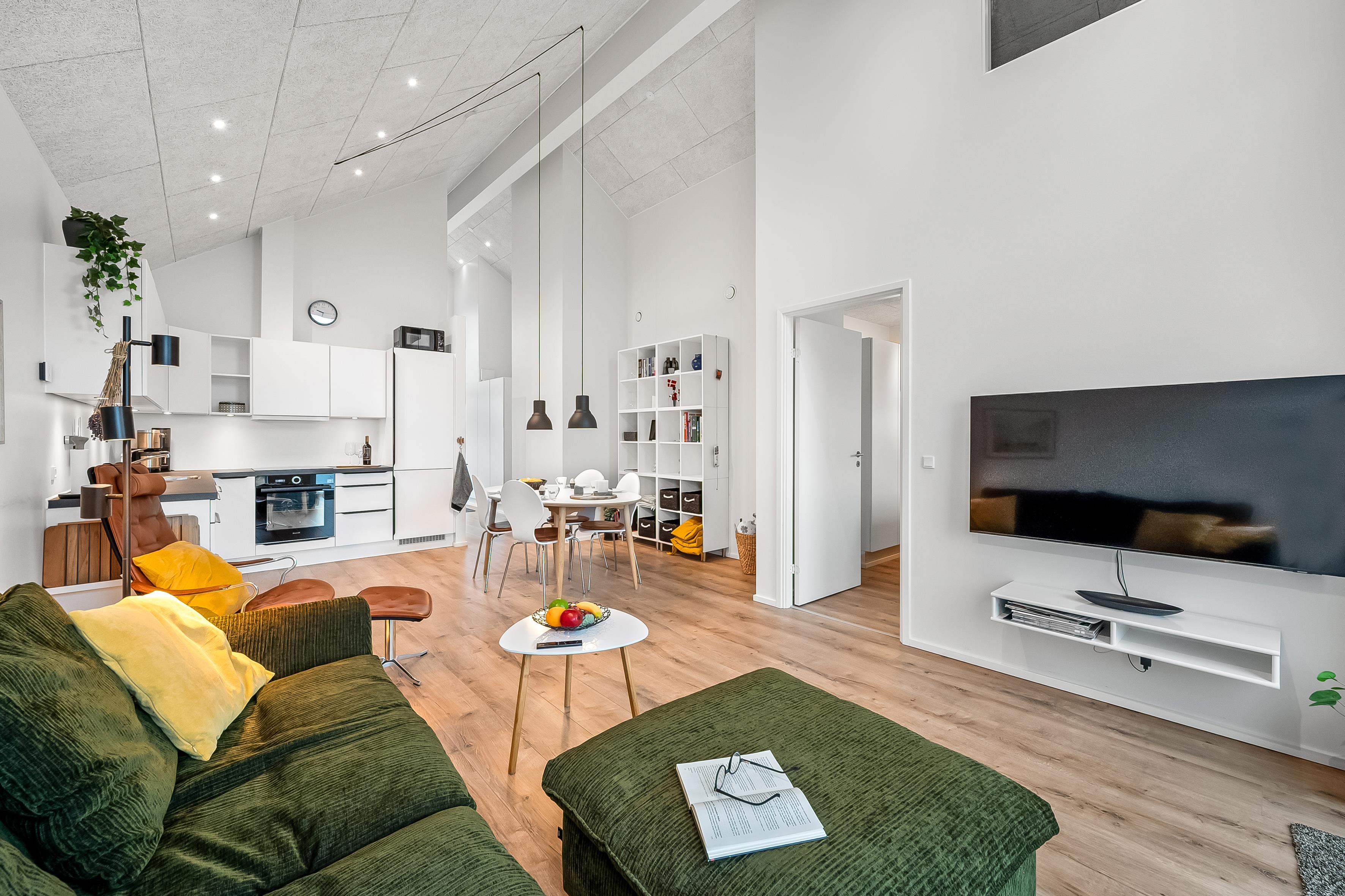 Fra det åbne, fuldt udstyrede køkken med ovn, 4-blus kogeplader, opvaskemaskine, køleskab og en rummelig 60-liters fryser, kan du nemt komme ind i den lyse og indbydende stue. Der kan du slappe af foran fladskærms-tv'et med danske og tyske kanaler og Chromecast, nyde en god film eller blot beundre udsigten over det omkringliggende landskab. Hele lejligheden har trådløst internet, så du nemt kan holde kontakten med dem derhjemme. En energieffektiv varmepumpe sikrer en behagelig temperatur, og hele lejligheden er desuden udstyret med gulvvarme.