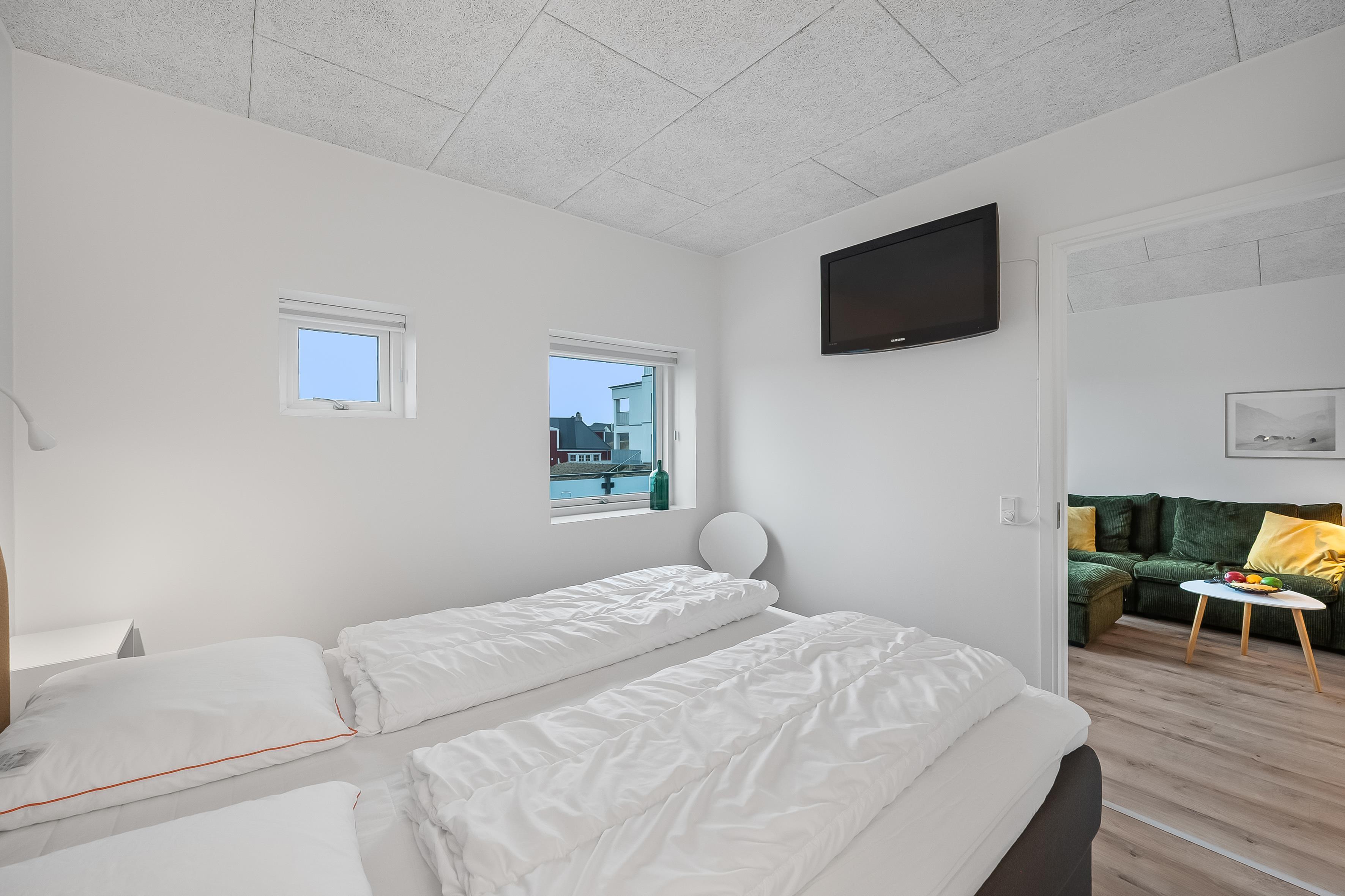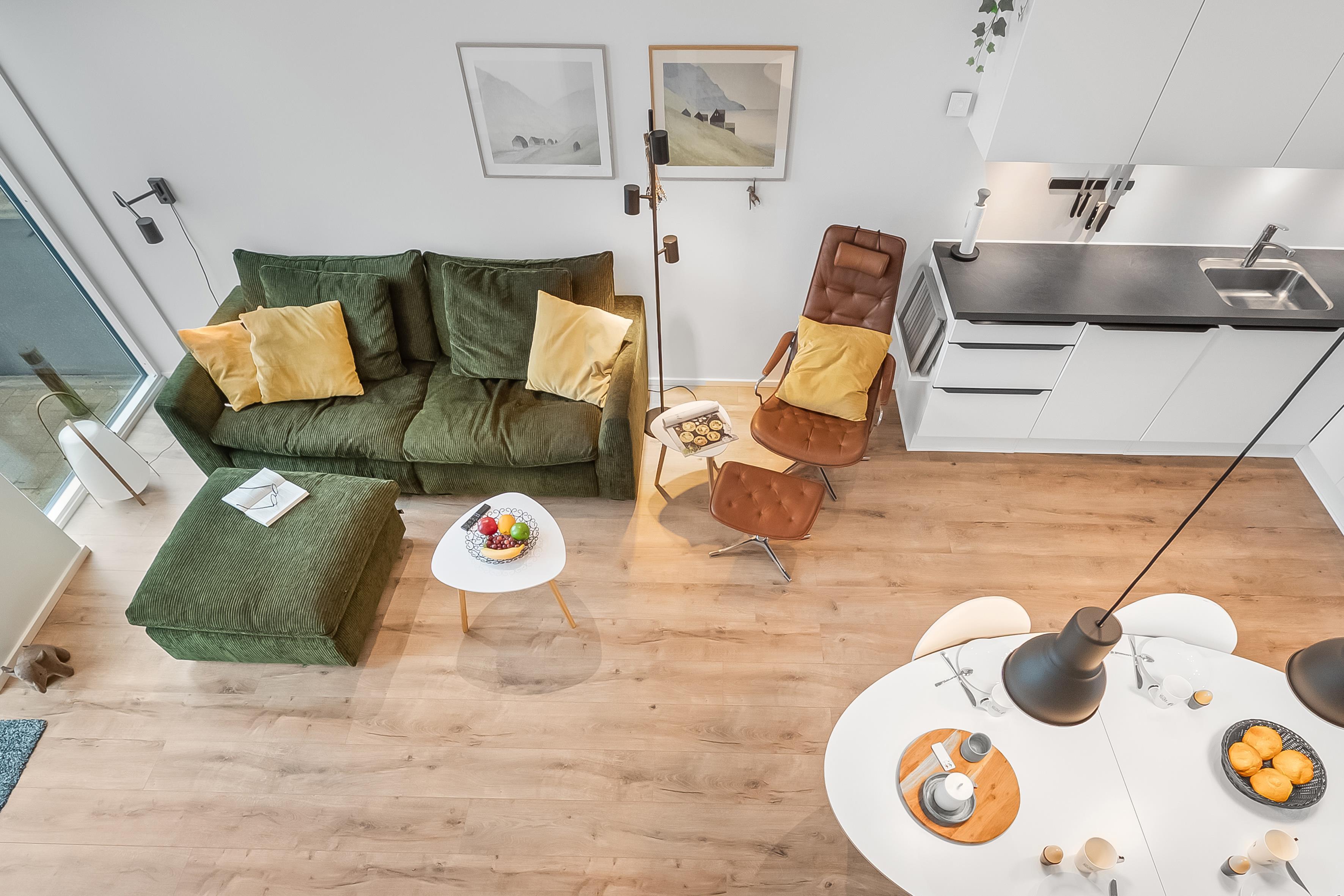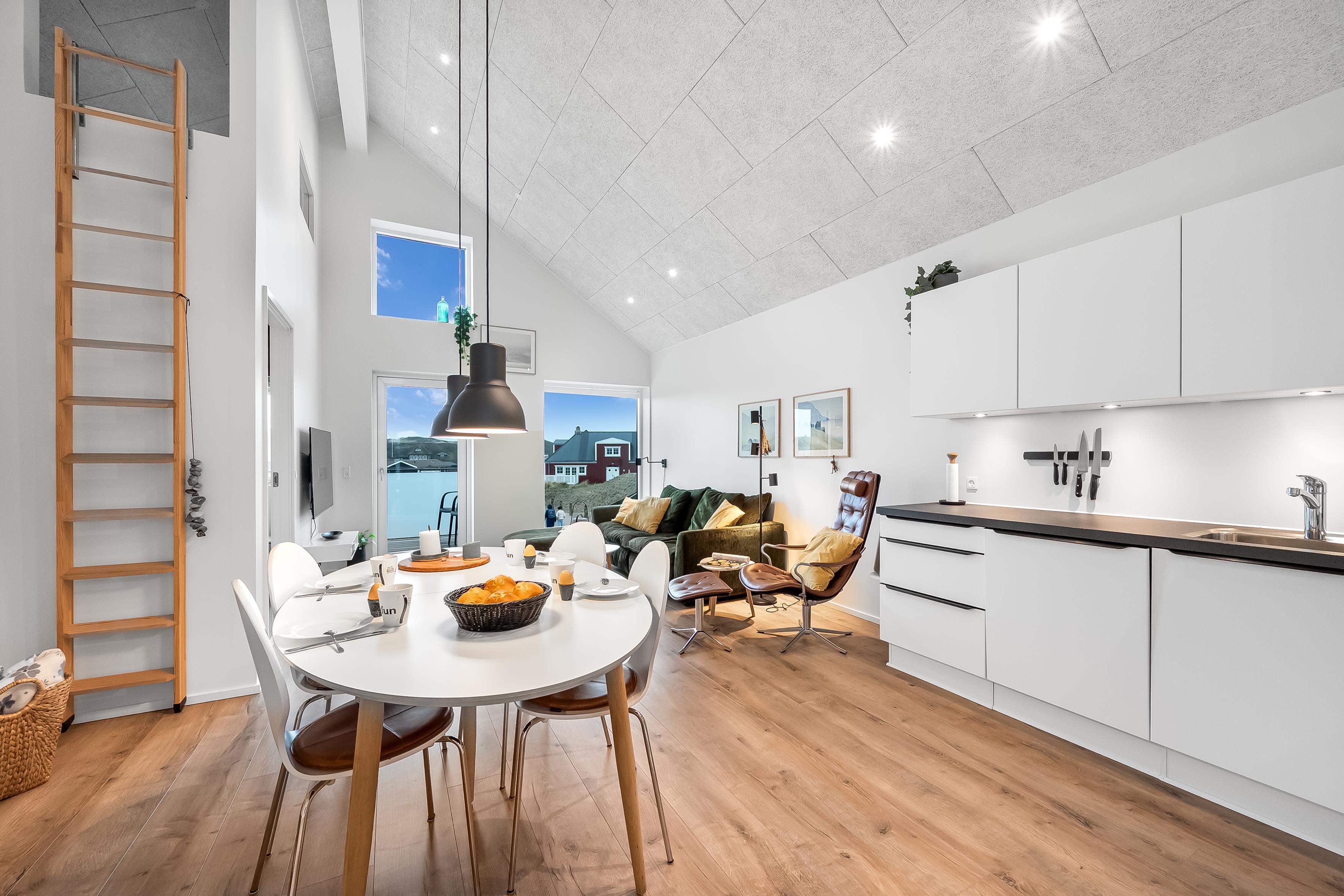 Fra det åbne, fuldt udstyrede køkken med ovn, 4-blus kogeplader, opvaskemaskine, køleskab og en rummelig 60-liters fryser, kan du nemt komme ind i den lyse og indbydende stue. Der kan du slappe af foran fladskærms-tv'et med danske og tyske kanaler og Chromecast, nyde en god film eller blot beundre udsigten over det omkringliggende landskab. Hele lejligheden har trådløst internet, så du nemt kan holde kontakten med dem derhjemme. En energieffektiv varmepumpe sikrer en behagelig temperatur, og hele lejligheden er desuden udstyret med gulvvarme.