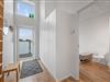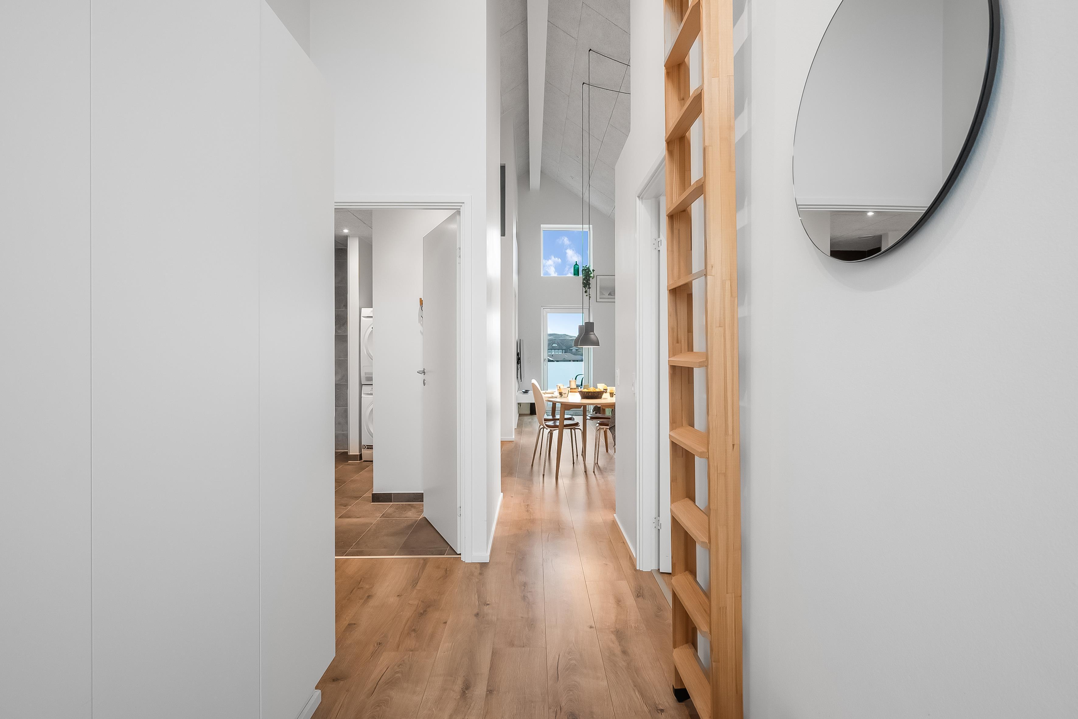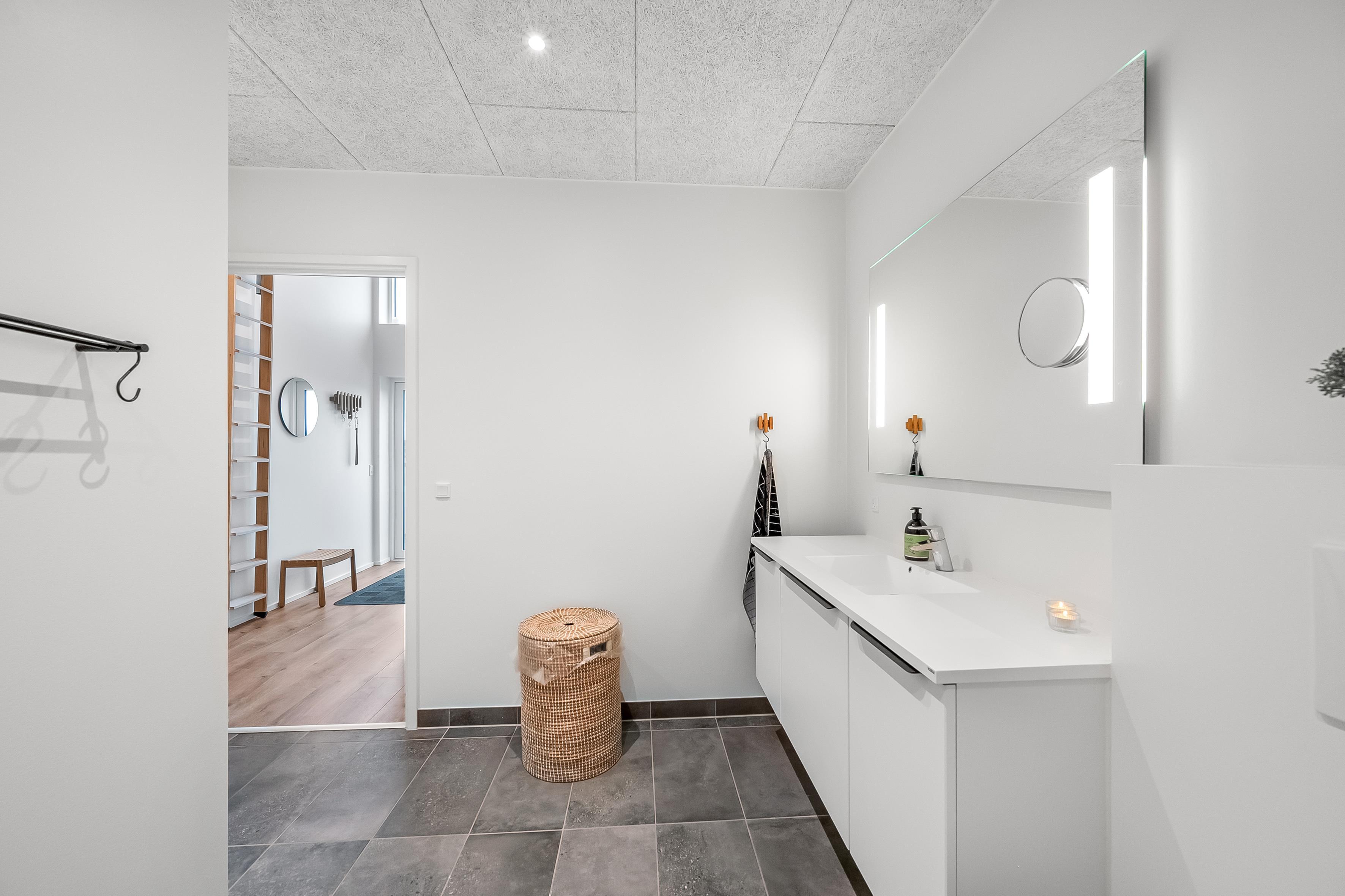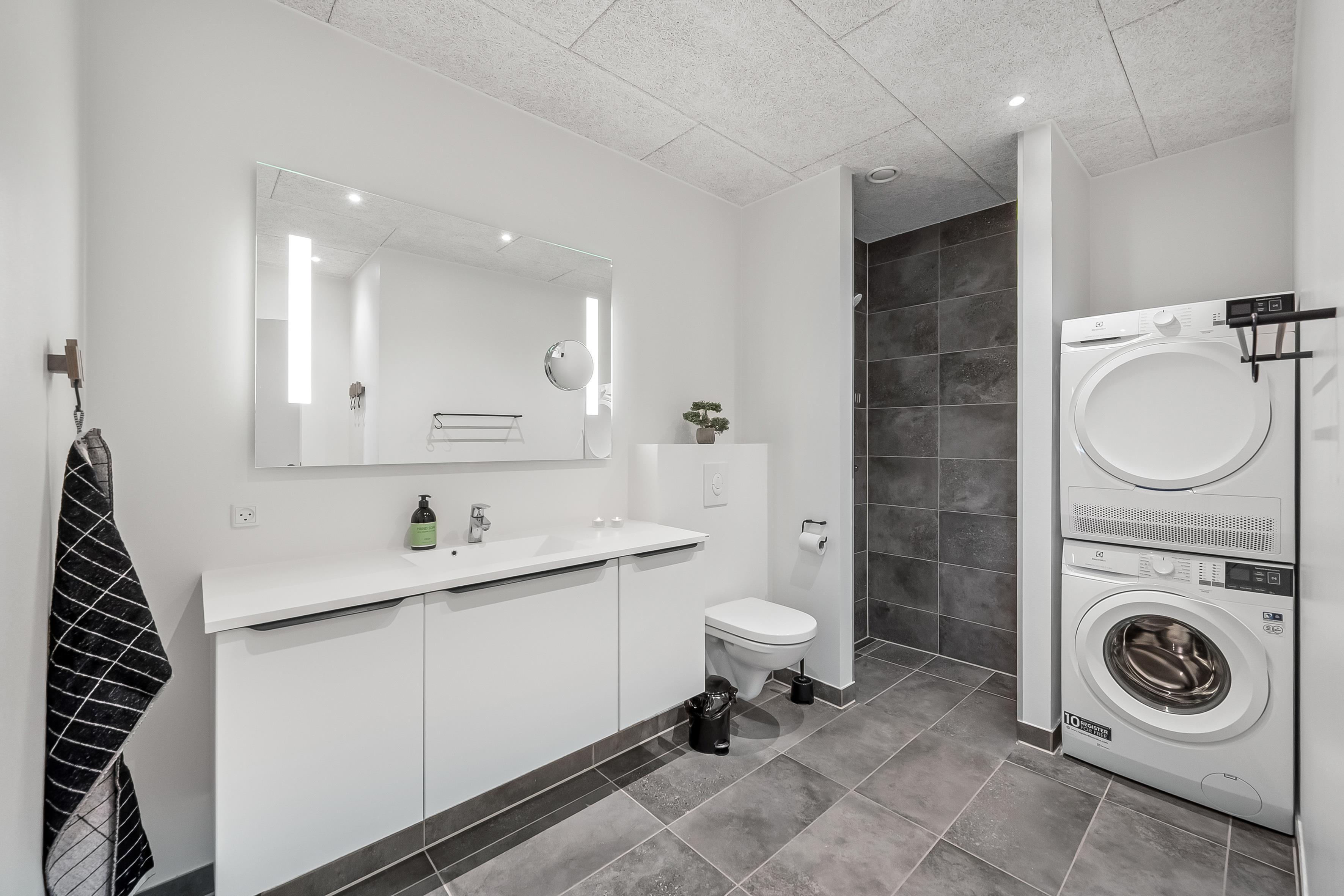 Det elegante, helt hvide badeværelse med bruser har et spejl, der spænder over hele håndvasken, og som også tilbyder rigelig opbevaringsplads. Vaskemaskine og tørretumbler er også placeret der.