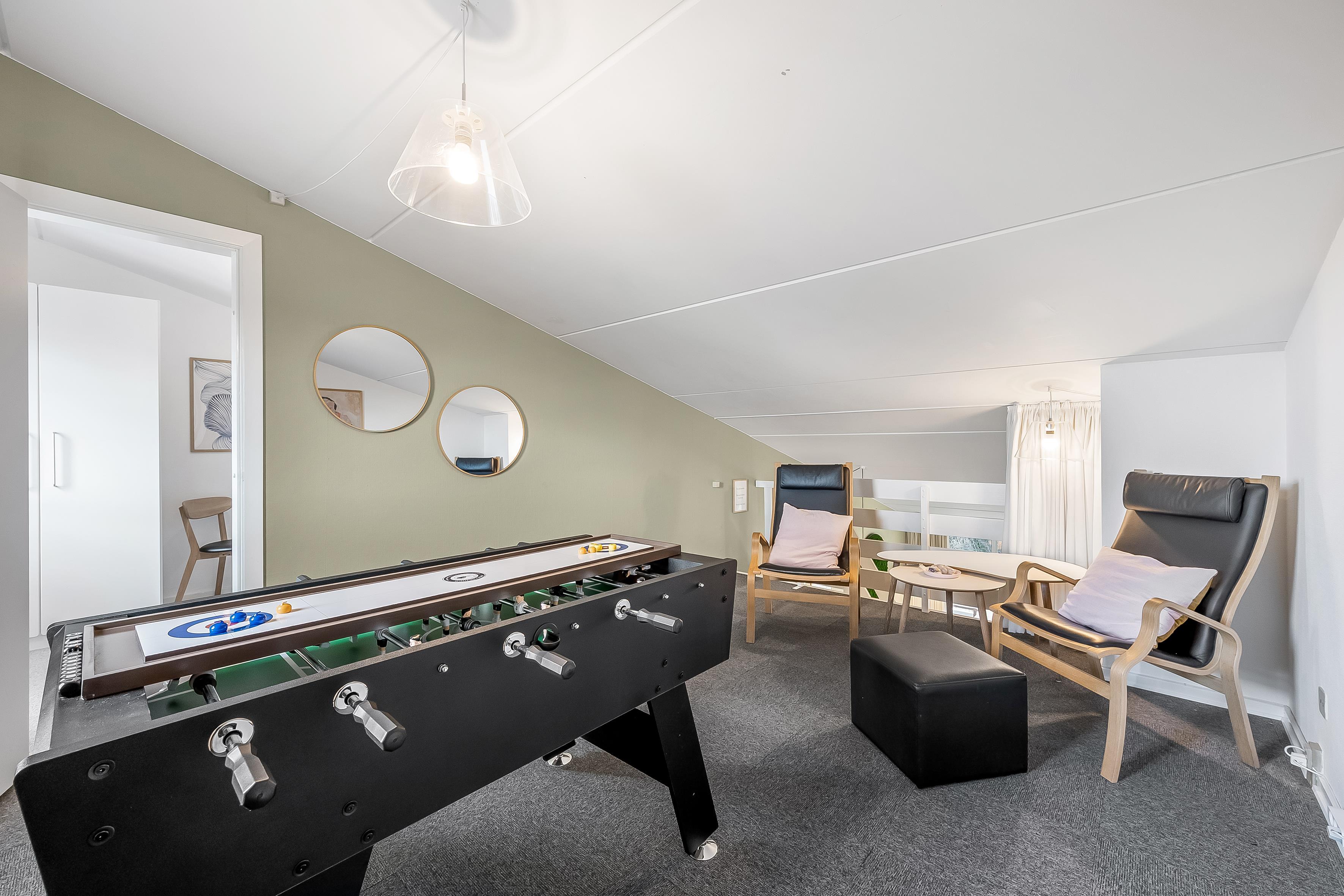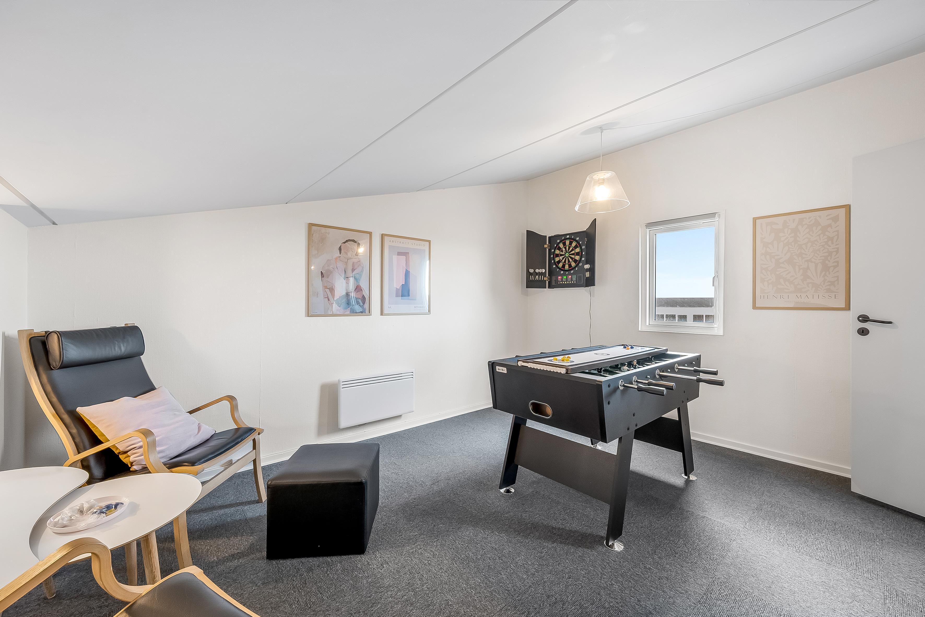 Det funktionelle badeværelse er udstyret med en bruser og et toilet, hvilket giver alt, hvad I behøver for at føle jer hjemme. Ferieboligen har også en lukket balkon, hvor I kan nyde de milde sommeraftener eller blot slappe af med en god bog. For dem, der elsker at holde sig aktive, er der et aktivitetsrum med dart, bordfodbold og shuffleboard, som vil bringe timevis af sjov og underholdning.