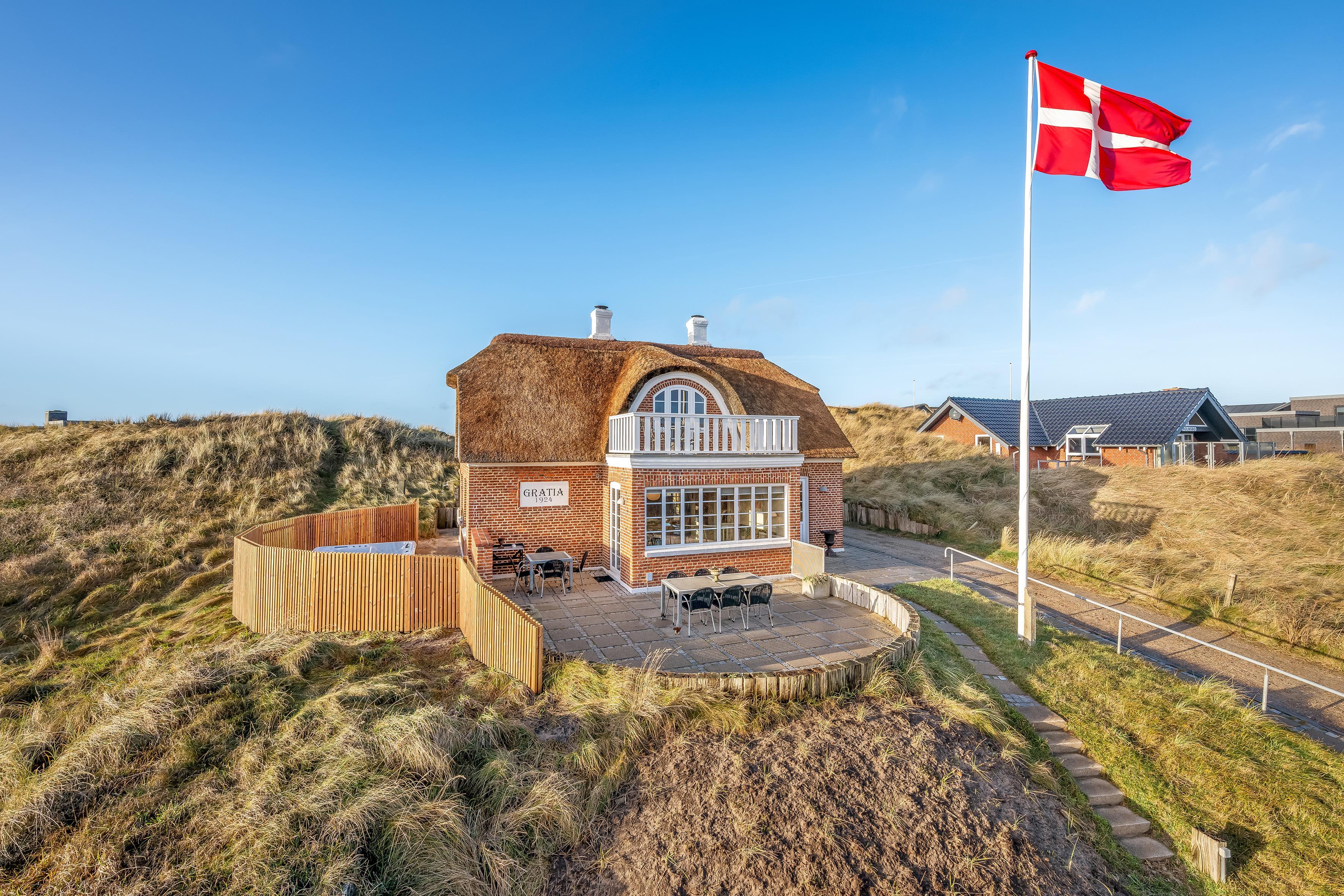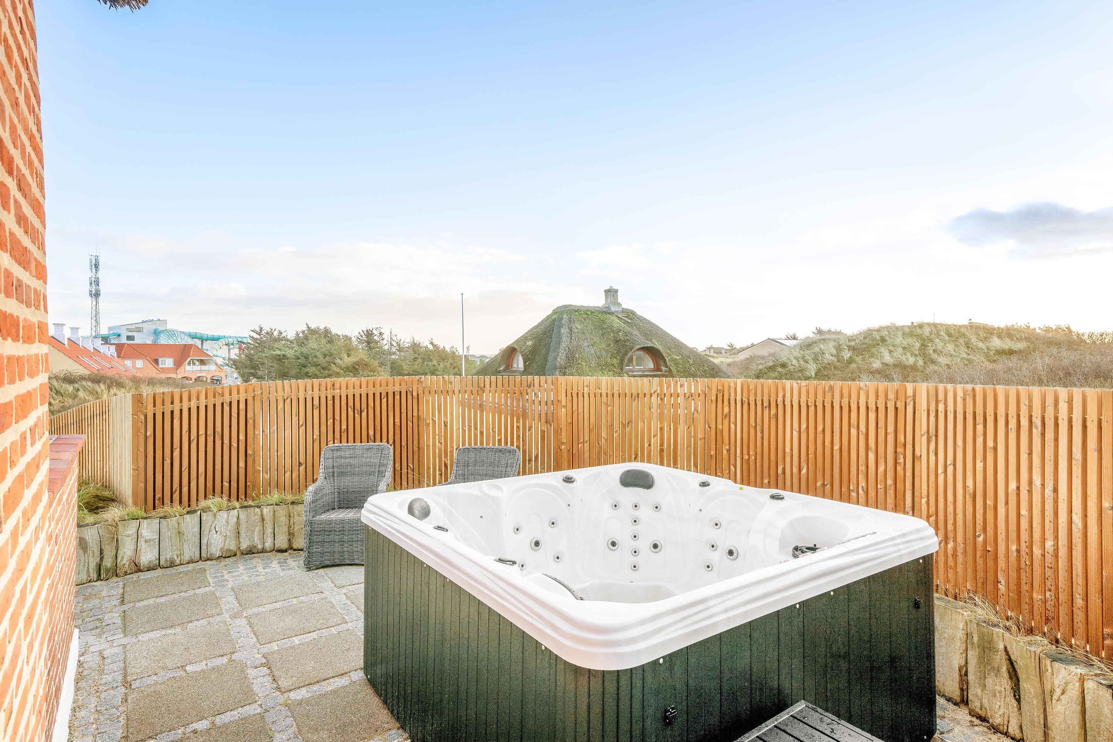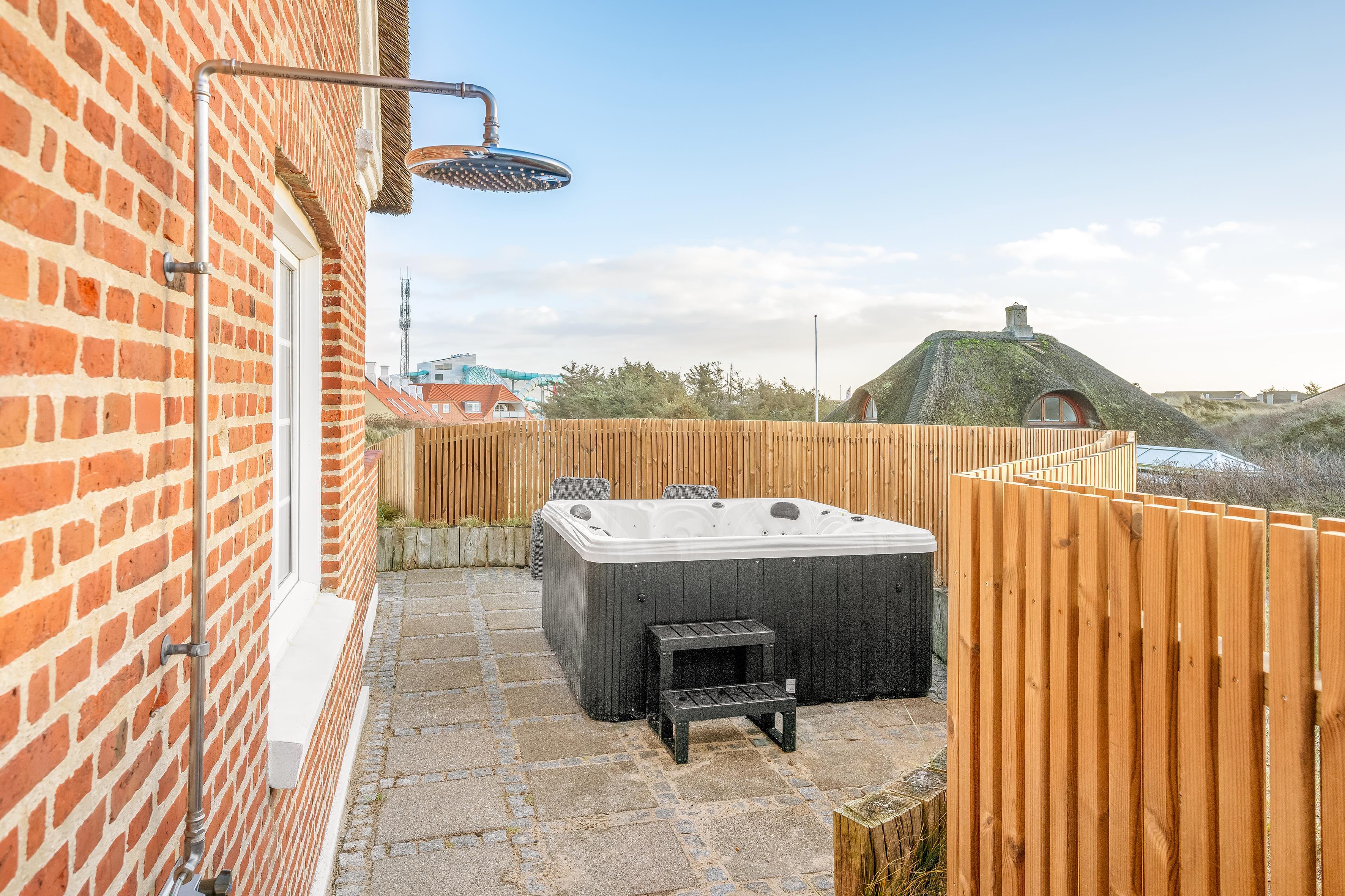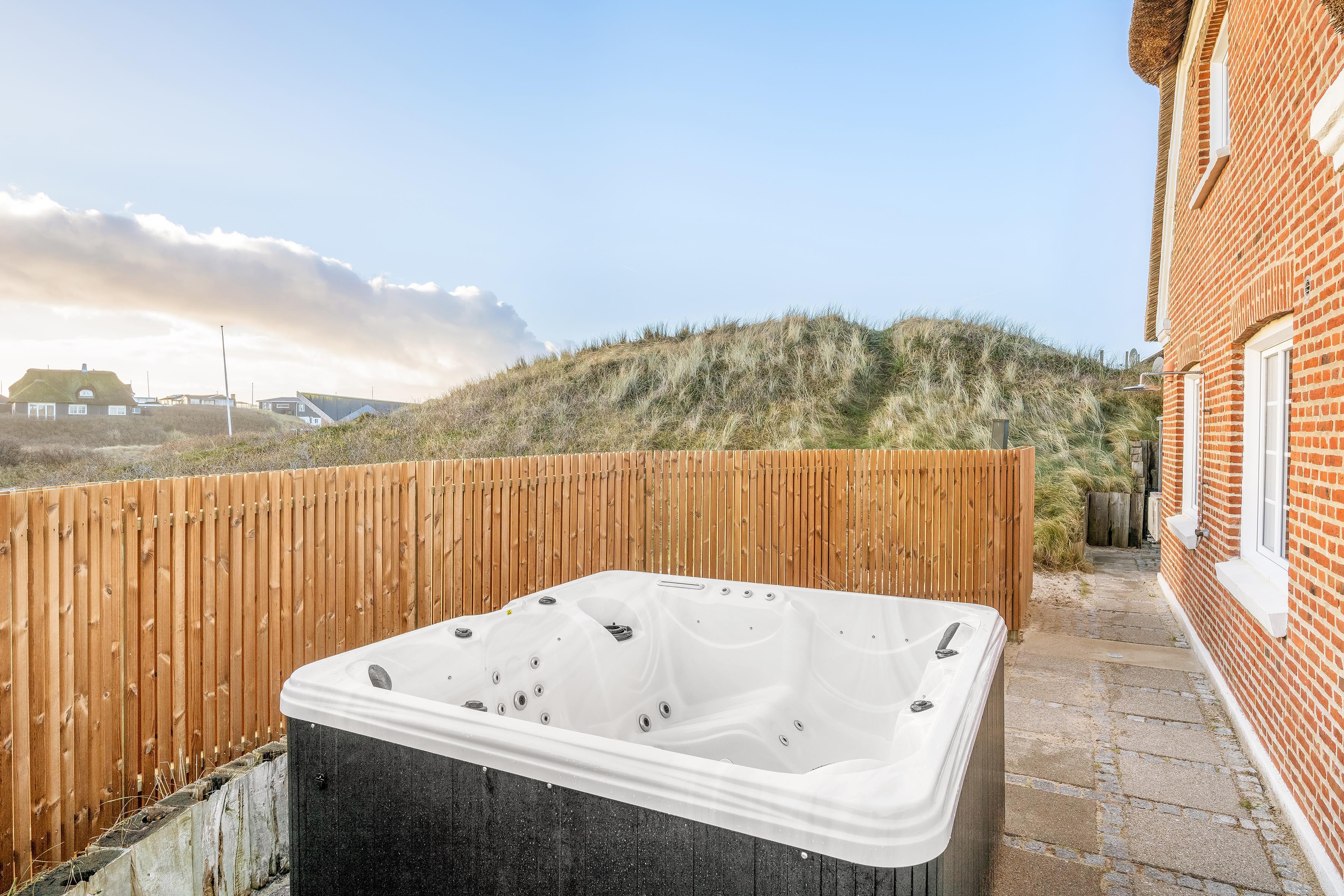 Udenfor kan du nyde den fantastiske udsigt fra balkonen, eller slappe af på den afskærmede terrasse, hvor der også er en grill til rådighed. Det udendørs spa er en ekstra luksus, der kan rumme op til 6 personer, så du kan slappe af under stjernerne efter en lang dag. På den højest beliggende del af husets grund, kan i nyde klitlandskabet og opleve den fantastiske solnedgang.