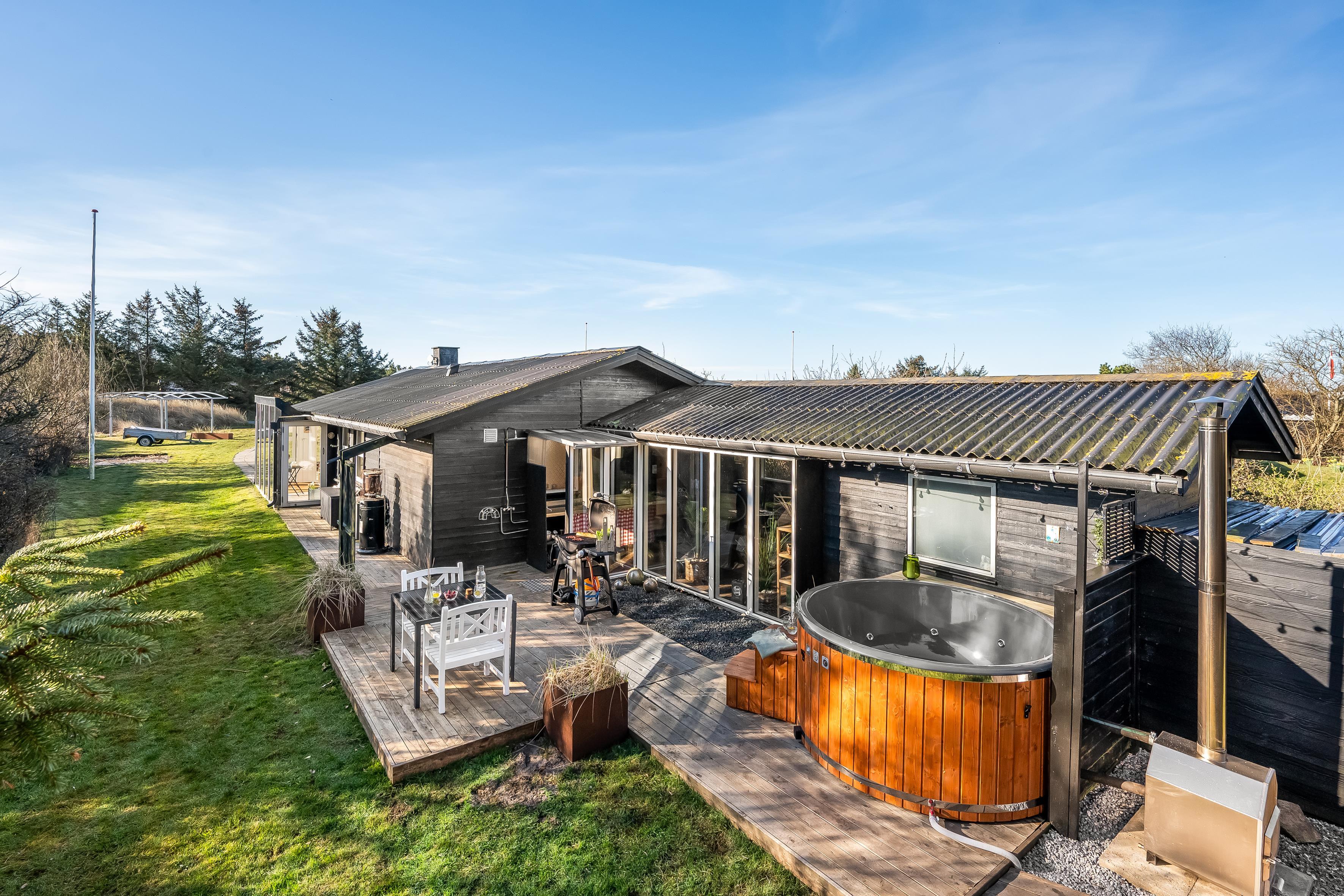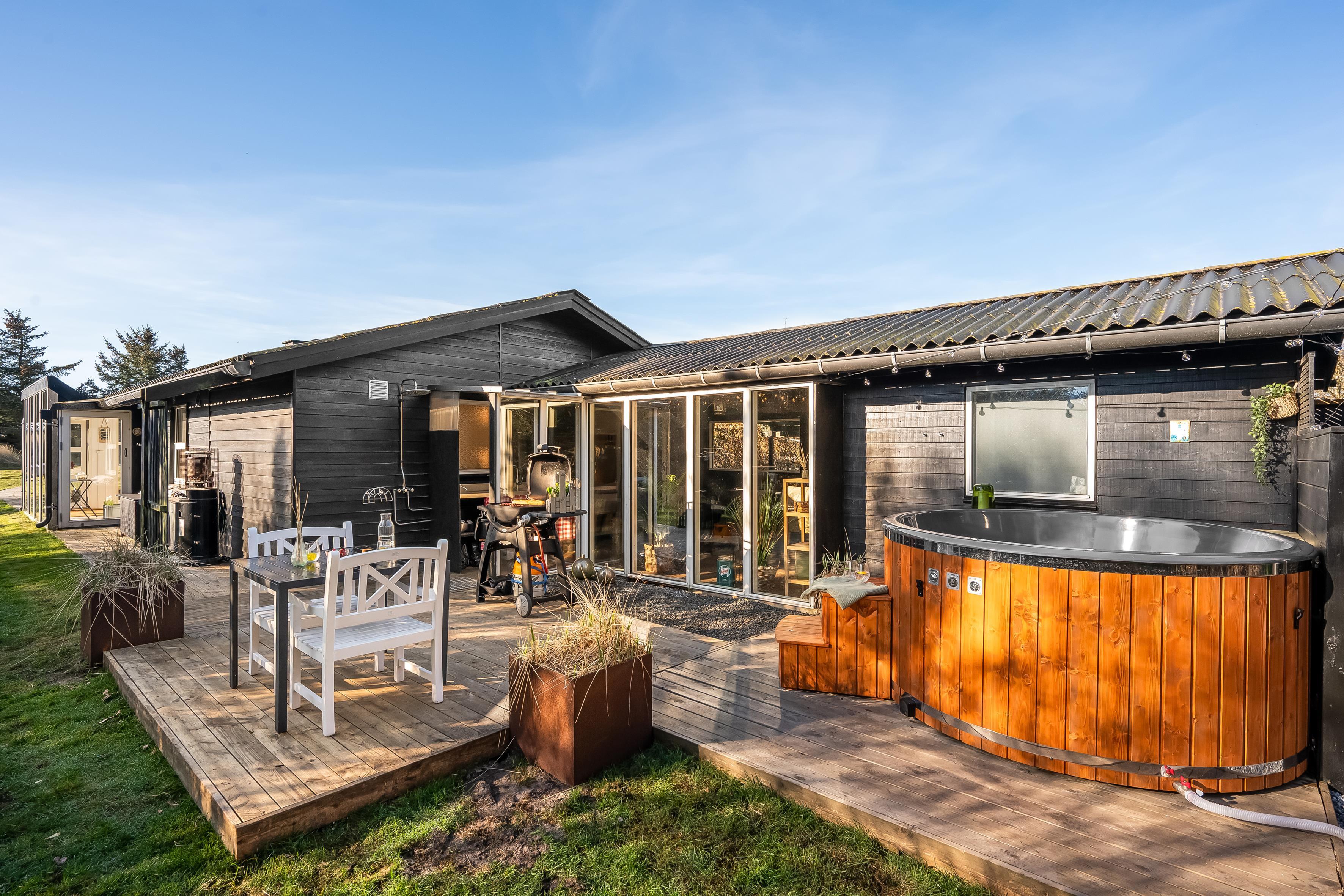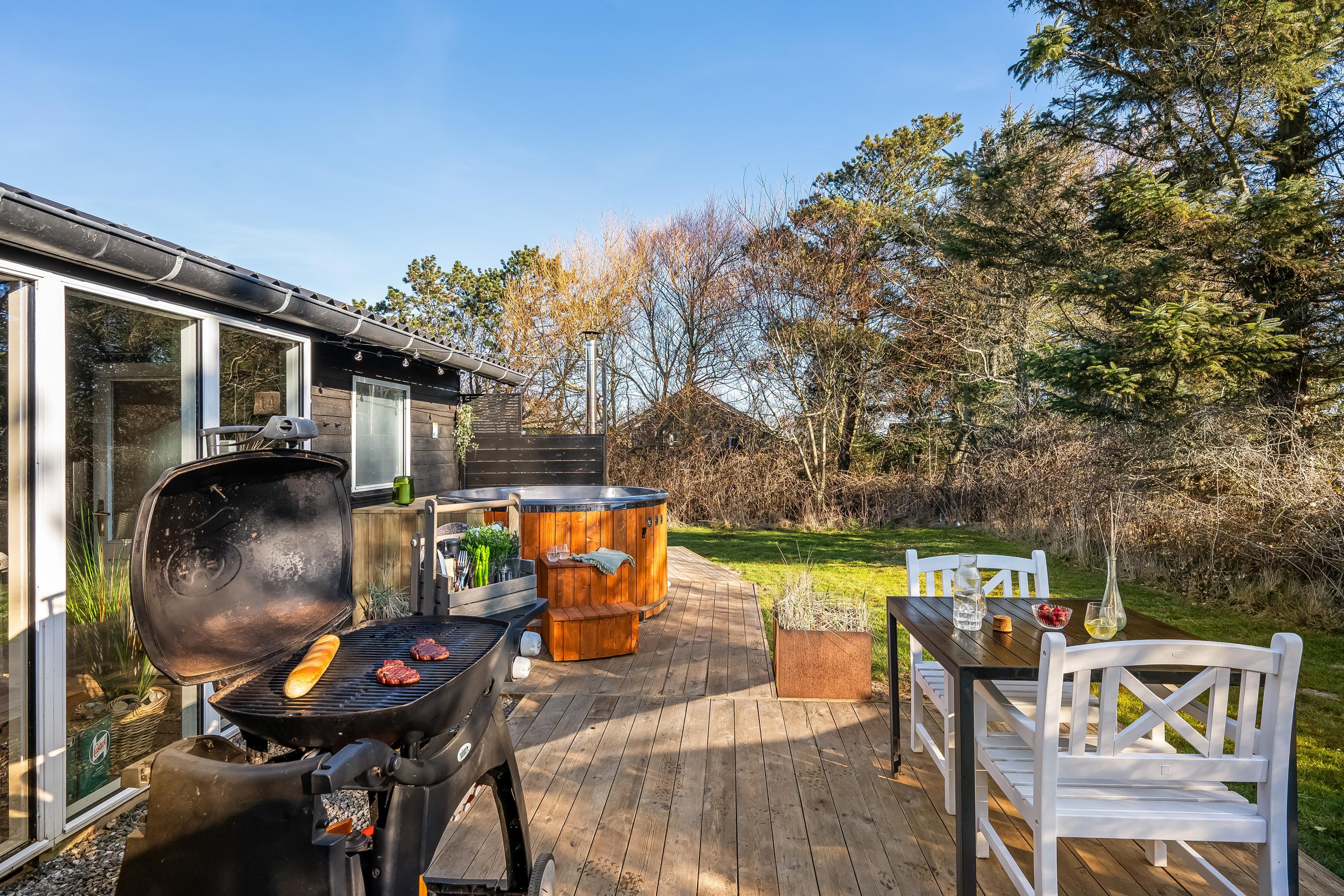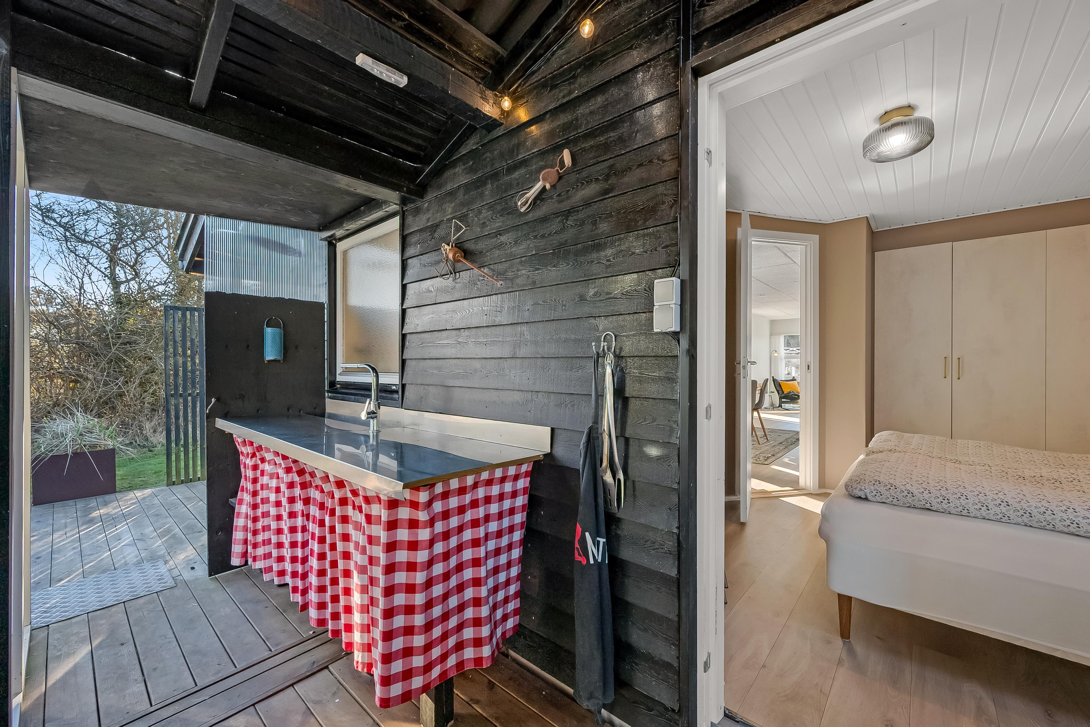 Køkkenet er veludstyret med moderne apparater, herunder en mikrobølgeovn, ovn, keramisk komfur, køleskab og fryser på 80 liter. Opvaskemaskinen gør oprydningen efter måltiderne til en leg. Udenfor kan du nyde de dejlige danske sommeraftener på den overdækkede terrasse, hvor der også er en grill til hyggelige grillfester. Udebruseren er perfekt til at skylle sand og salt af efter en dag ved Vesterhavet, som ligger kun 600 meter væk.