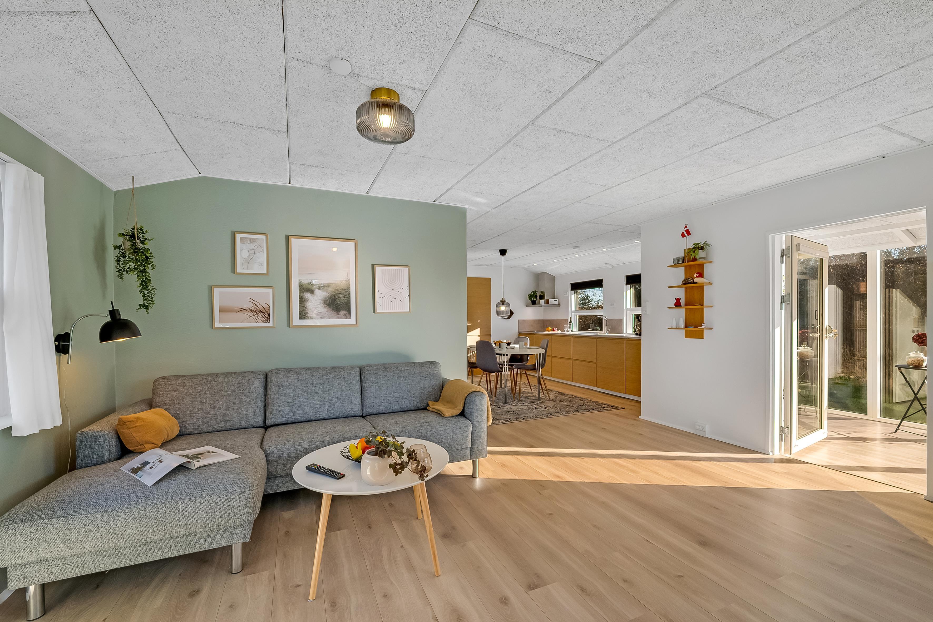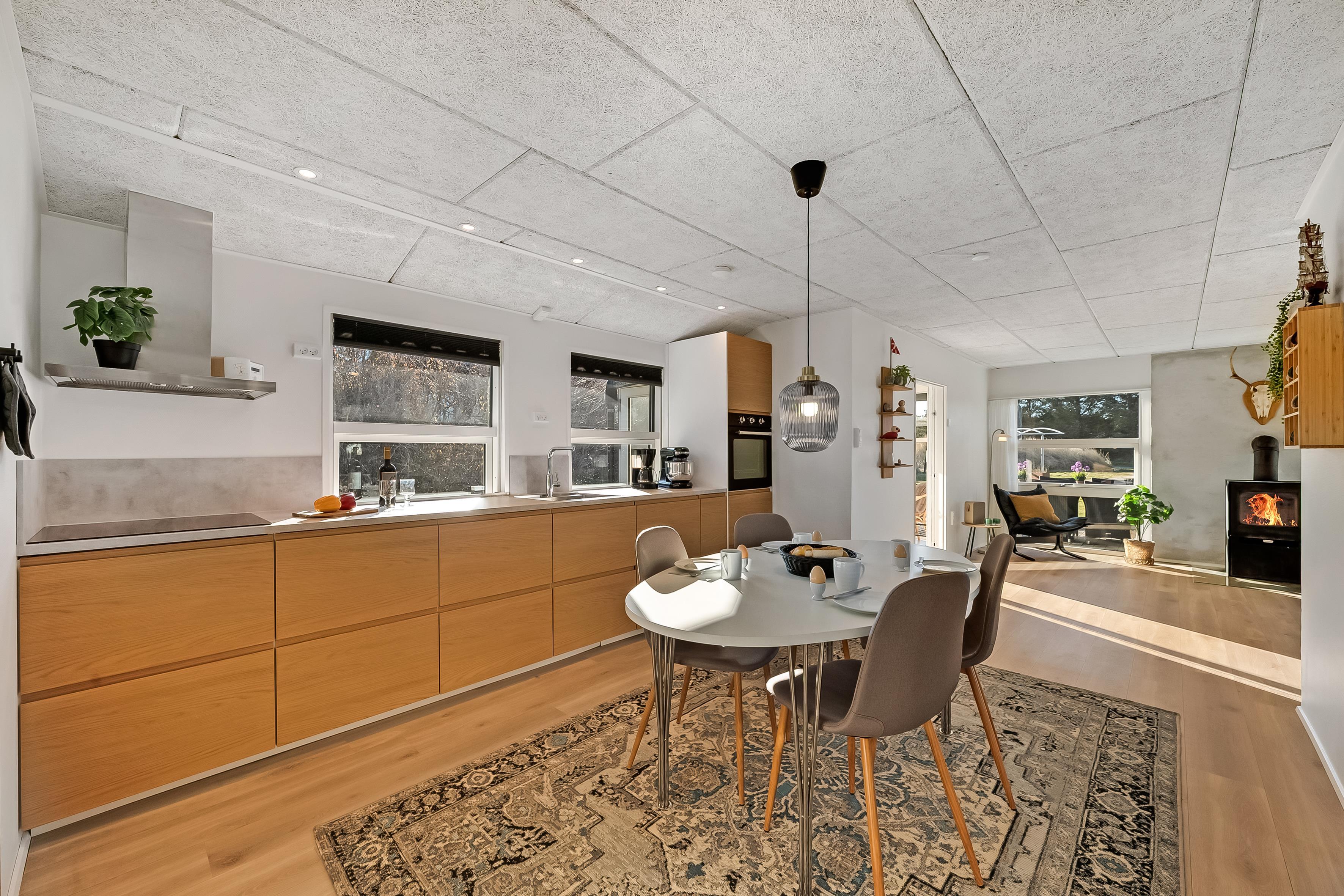 Det moderne badeværelse er udstyret med gulvvarme, en bruser og et toilet, hvilket giver en behagelig oplevelse hele året rundt. I stuen finder du en hyggelig brændeovn, der skaber den perfekte atmosfære på kolde aftener, samt gulvvarme via husets energibesparende varmepumpe, der sikrer et behageligt indeklima året rundt, uden at energiomkostningerne stikker af. Der er også trådløst internet og to fjernsyn til underholdning, det ene er med adgang til både dansk og tysk TV samt Chromecast i dem begge, så du kan streame dine yndlingsprogrammer.