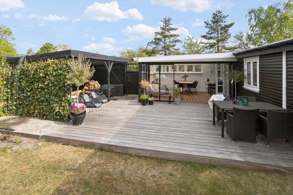 Nye træterrasser på tre sider af huset skaber stor mulighed for det gode udeliv. Mod vest og syd er der et helt ugeneret område i haven, hvor der er overdækket terrasse ud for køkkenet samt overdækket loungeområde. Haven er hyggelig med mange gode læ kroge, så der altid kan findes et sted at opholde sig.