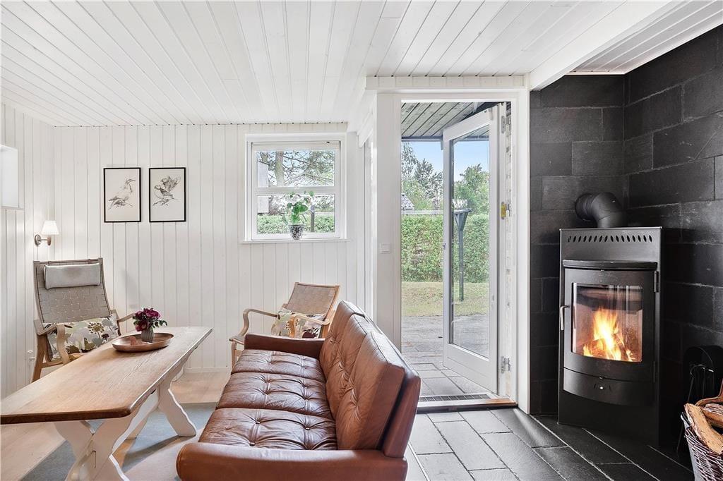 Sommerhuset er stilfuldt og hyggelig indrettet og har dejlig stue med brændeovn og med udgang til haven og et dejligt køkken. Egner sig godt til familier med små børn, da der i huset er børnevenligt og har bl.a. barnestol, barneseng og babybadekar. Udover badeværelset i sommerhuset er der ekstra toilet i tilstødende skur. Hyggelig udestue.