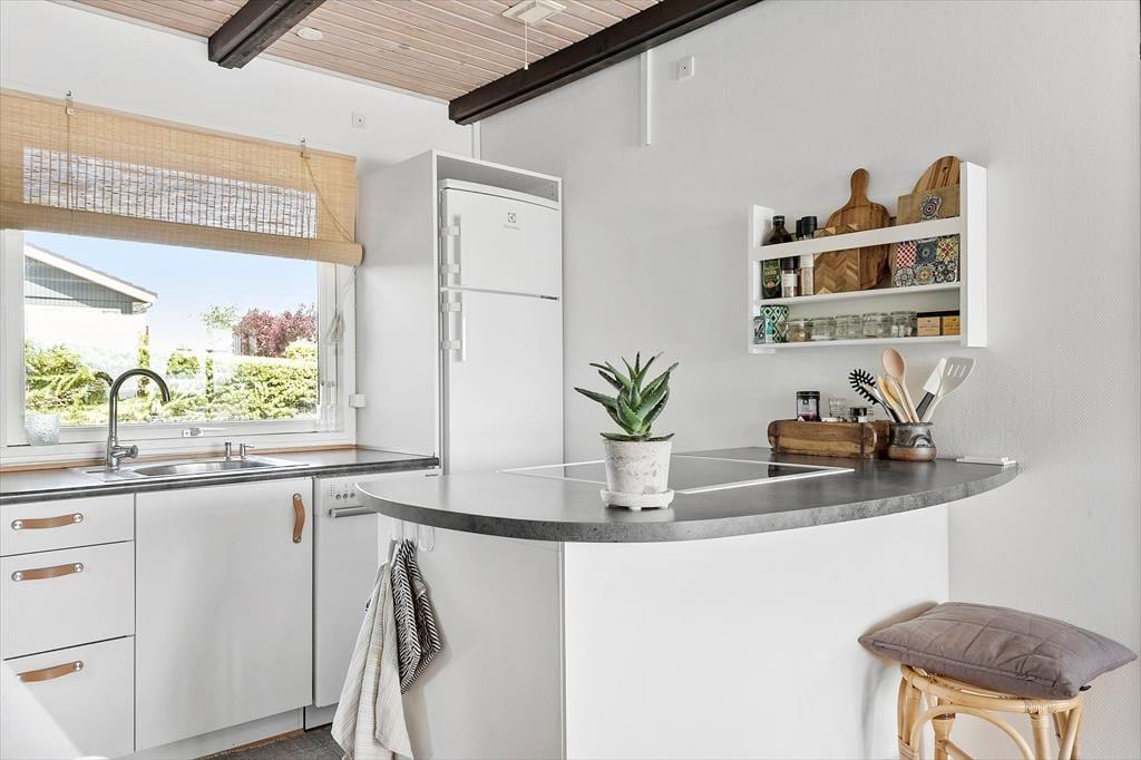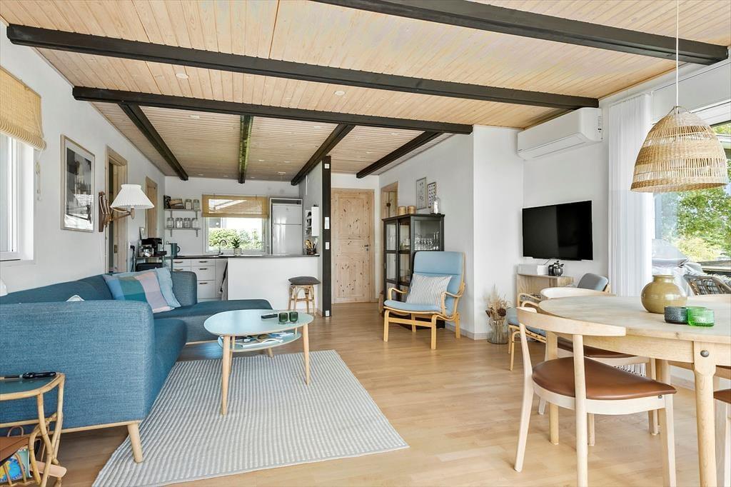 Træd ind i en verden af lys og luft, hvor den moderne sommerhusstil møder ægte dansk feriehygge. Stuen er hjemmets hjerte – med store vinduespartier, der lukker sollyset og naturen ind, og en knitrende brændeovn, der sætter stemningen for de hyggelige aftener. Forestil jer at samles her efter en dag fyldt med oplevelser, mens flammerne fra ovnen danser og varmer jer. Det åbne køkken-alrum indbyder til lange middage med latter og samvær, mens husets lyse og rummelige værelser lover afslappende nætter, så I vågner friske og klar til nye eventyr.