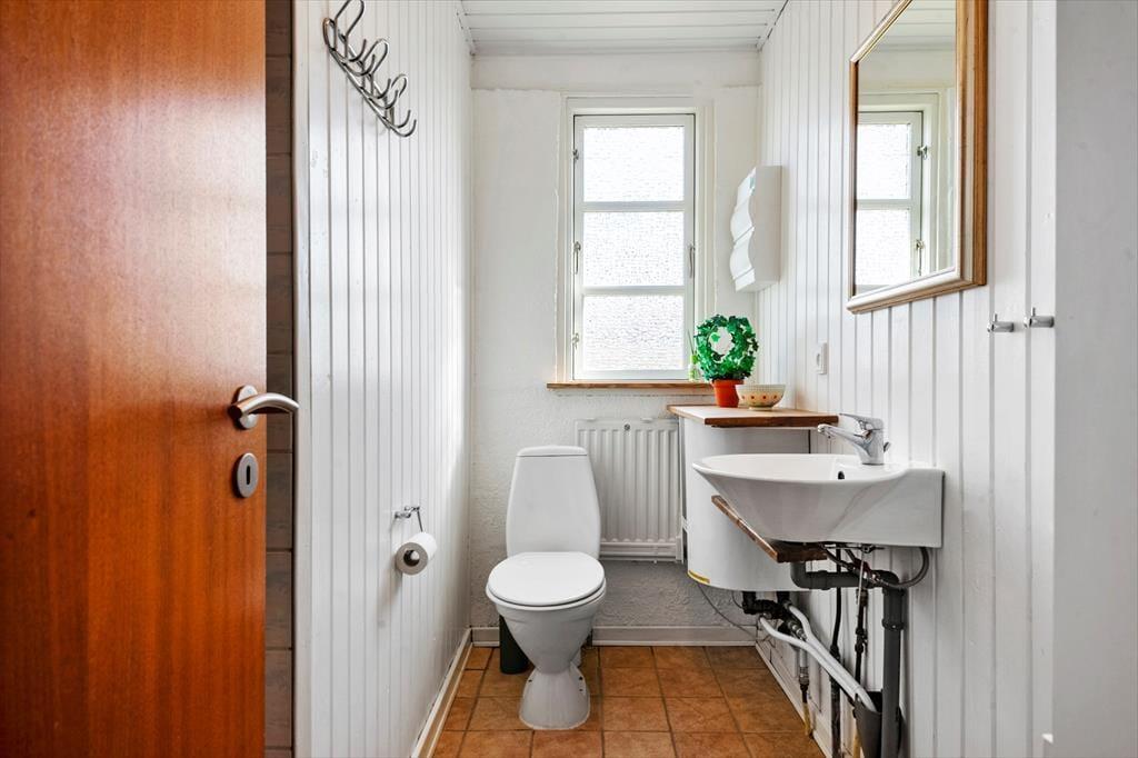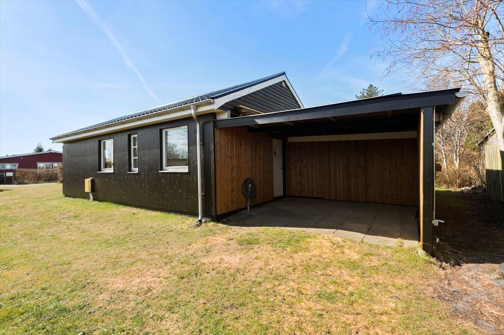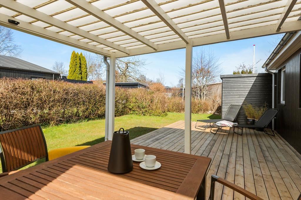 Fra stuen er der direkte udgang til den store overdækkede terrasse. Der er høj hæk om haven og med havens fodboldmål er der fløjtet op til kamp. Til huset hører carport.