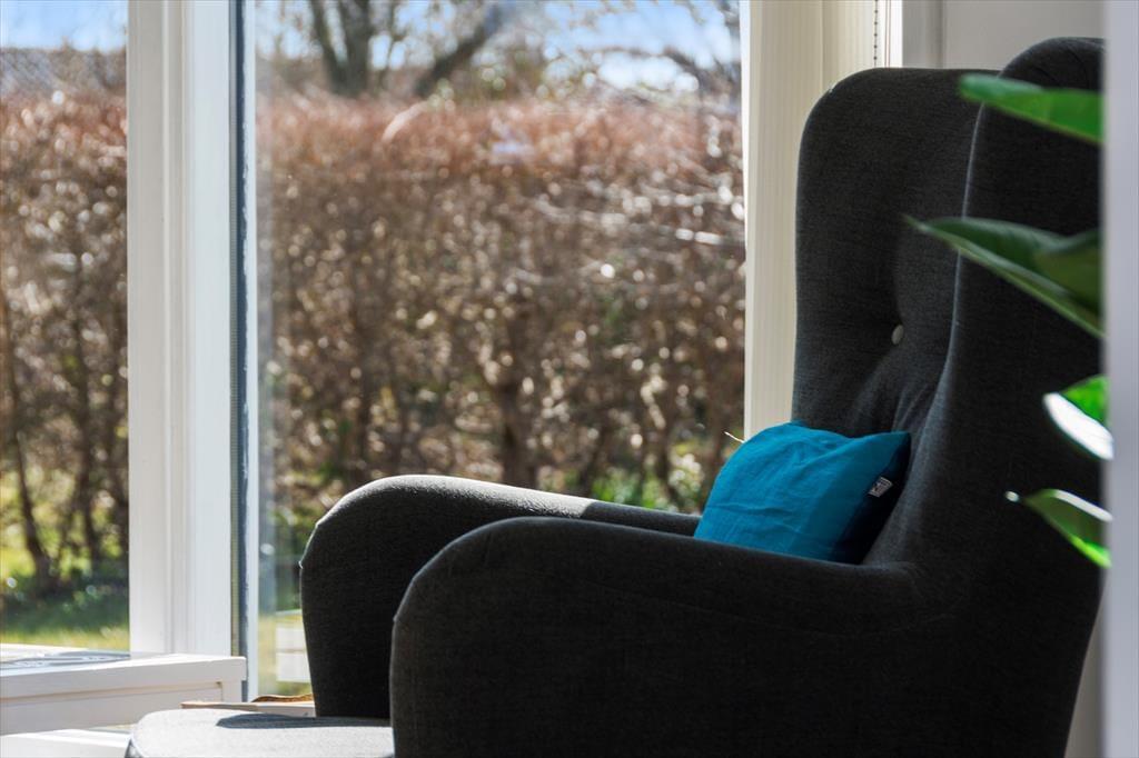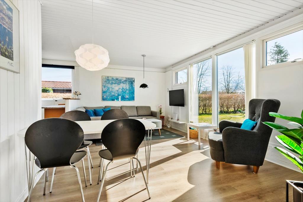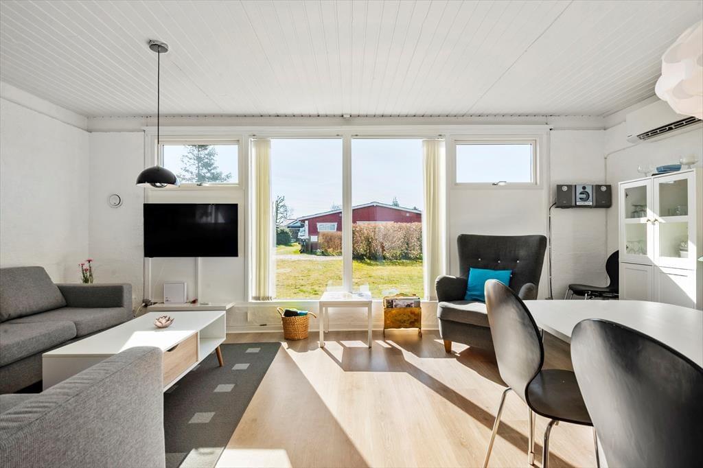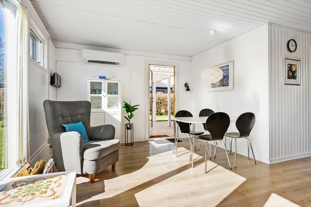 Stuen har et stort vinduesparti ud mod haven som giver et godt lysindfald og udsyn til haven. Stuen ligger i forbindelse med køkkenet. Tre soverum og badeværelse. Varmepumpe med køl sparer på el-udgifterne og solcelleventilation giver huset et godt indeklima.