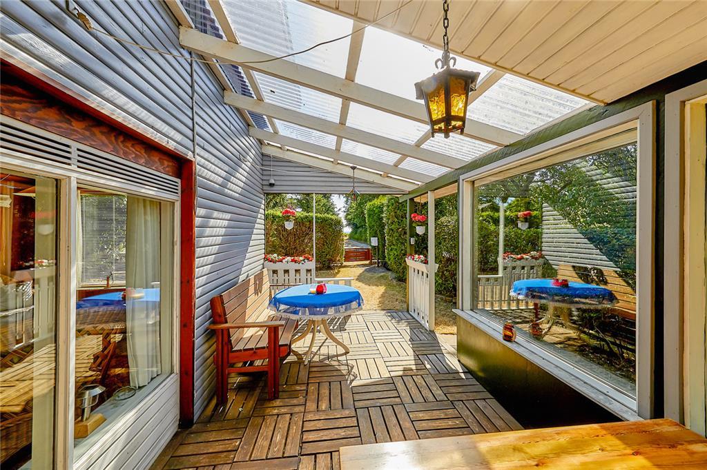 Dejlig have med skøn overdækket terrasse som er delvis lukket. Derudover er der en hyggelig solgård, hvor man er helt ugeneret for indkig.