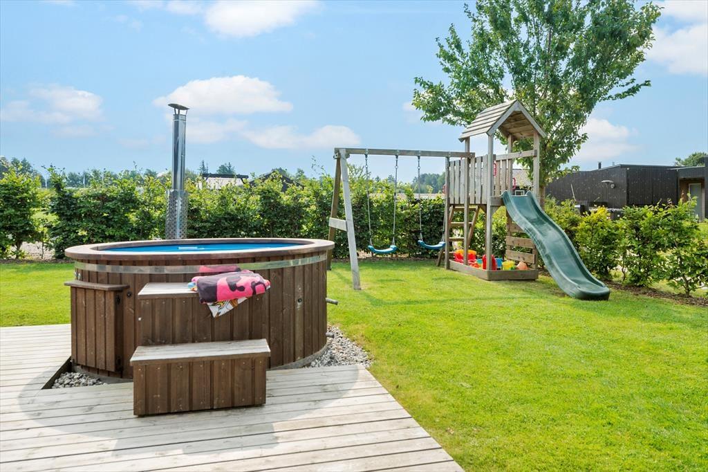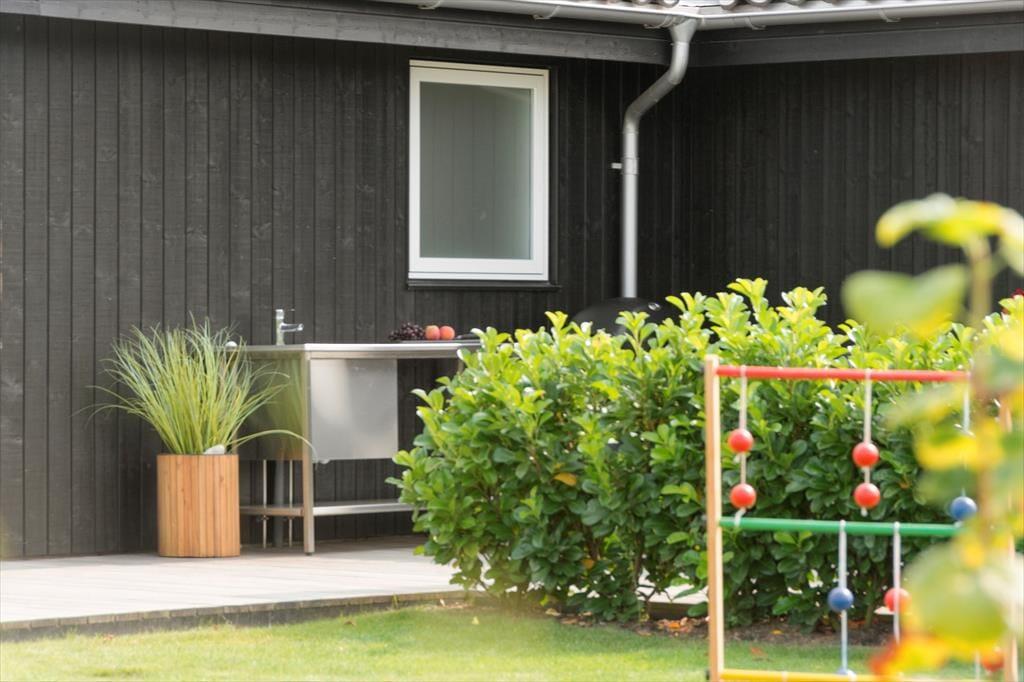 Herudover udendørskøkken, udebruser og en stor gasgrill. Til de mindste er der legetårn med både gynger, rutsjebane, klatrevæg og sandkasse.