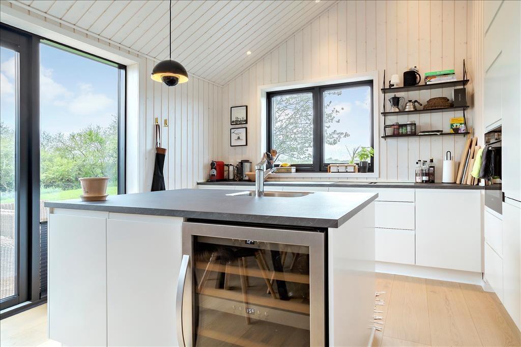 Husets hjerte og samlingssted er absolut det lyse køkken/alrum som er central placeret i huset med flot lysindfald fra de store vinduespartier. I køkkenet er der alt, hvad I skal bruge af moderne faciliteter. Her er induktionskogeplader med indbygget emhætte, ovn, mikroovn, kaffemaskine, Espresso kaffemaskine, opvaskemaskine, køleskab, fryser og et fint vinkøleskab som kan sikre, at hvidvinen er kold til de hyggelige timer på terrassen.