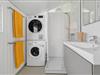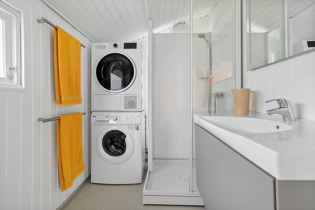 Fra den overdækkede terrasse er der desuden adgang til et praktisk bryggers med vaskemaskine og tørretumbler – og herfra finder du også indgangen til sommerhusets toilet og bad. Alt sammen under tag, men med adgang udefra.