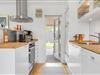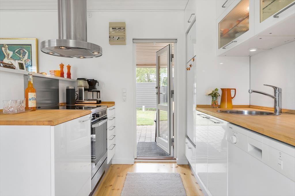 Det veludstyrede køkken har direkte adgang til en overdækket terrasse, som er oplagt til morgenkaffen. Vi anbefaler en tur til Saksild efter frisk morgenbrød – enten fra Bagergården, der mestrer det klassiske håndværk, eller mikrobageriet Groft, hvor surdejen er i centrum.