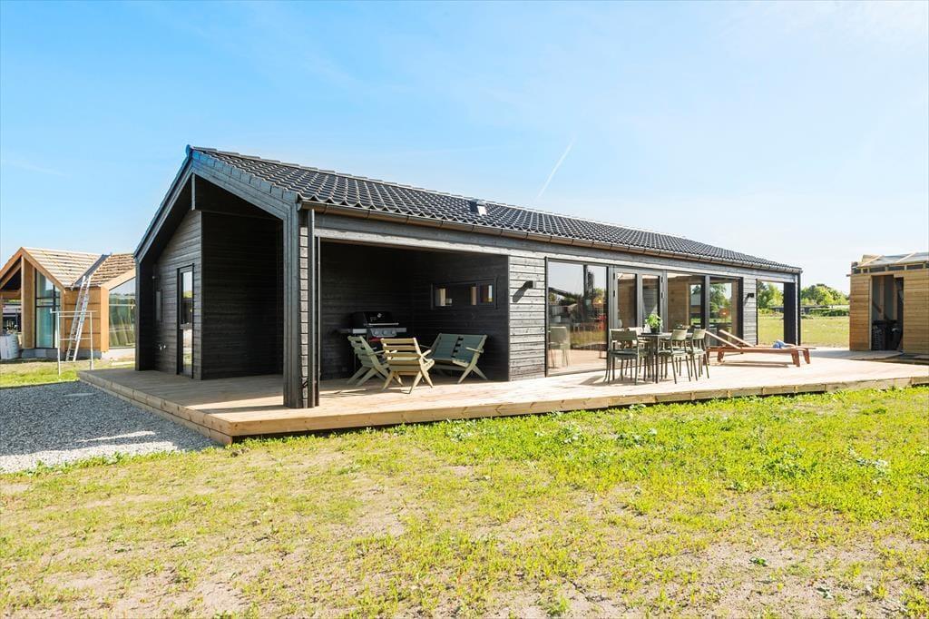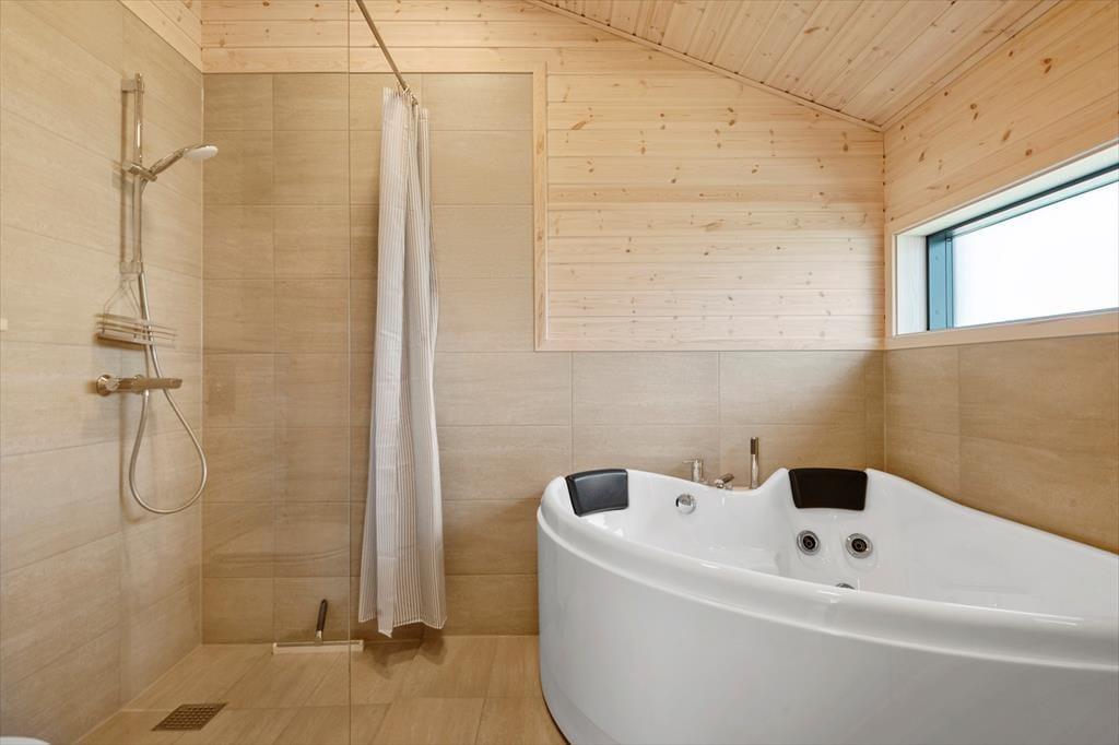 Udenfor venter en rummelig træterrasse med havemøbler, liggestole og en lækker udespa – perfekt til lange aftener under himmelens skiftende farver. I haven er der god plads til leg og ophold, og den udendørs bruser gør det nemt at skylle sandet af efter en tur til stranden.