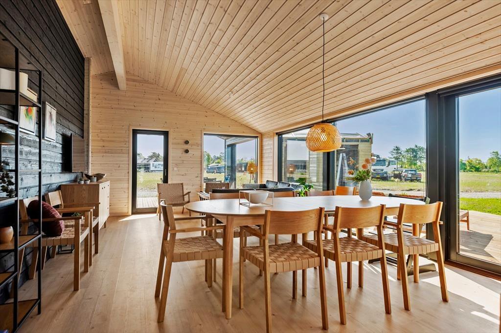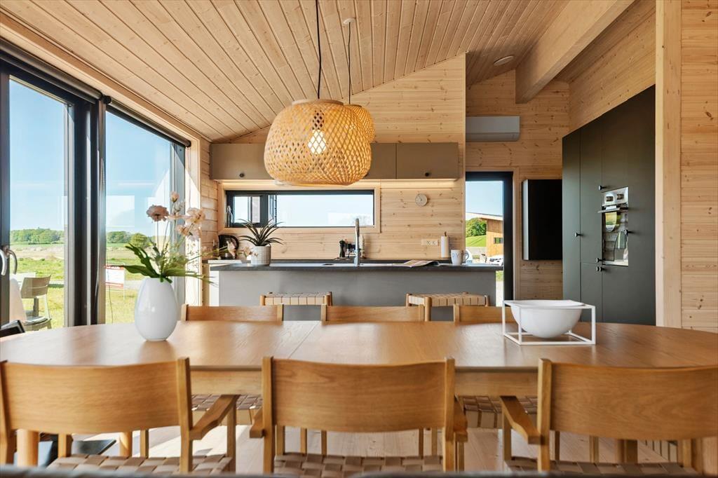 Allerede når du træder ind ad døren, fornemmer du, at her er tænkt over både æstetik og funktionalitet. Det lyse opholdsrum er feriehusets naturlige samlingspunkt – med loft til kip, store vinduespartier og et skønt lysindfald, der skaber en behagelig og luftig atmosfære fra morgen til aften. Her smelter køkken, spiseområde og stue sammen i én indbydende helhed, hvor der er plads til både grin, nærvær og gode måltider.
