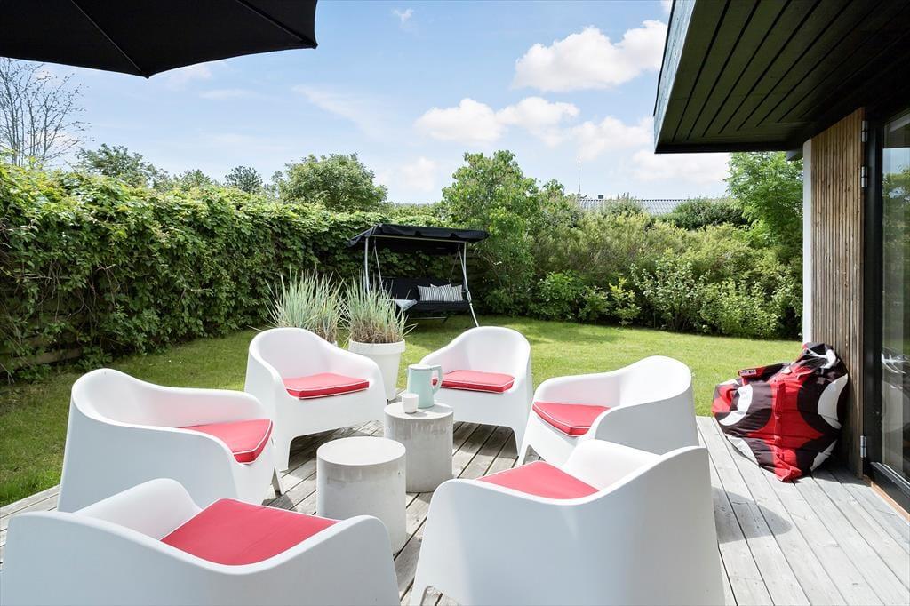 Udendørs finder I en stor terrasse hvorfra man næsten kan høre havet, som kun ligger 175 meter fra havet. Der er overdækket terrasse når sejlet er spændt ud, så der er rig mulighed for at nyde solen eller søge skygge – alt efter behov. Og elsker man en morgendukkert så er det med den korte afstand til stranden, meget nemt at tage en dukkert og bagefter blive skyllet af under bruseren. Haven er ugenert, så freden og roen kan nydes alt efter behov.