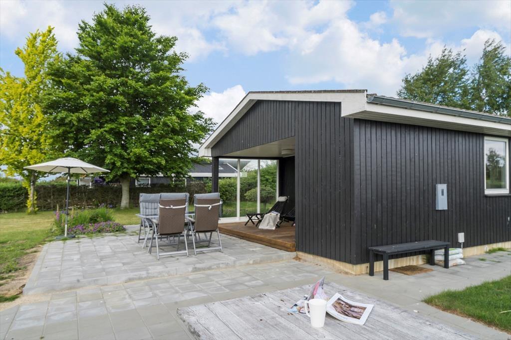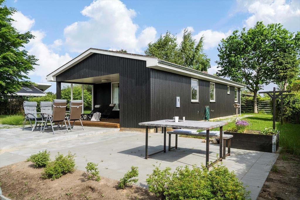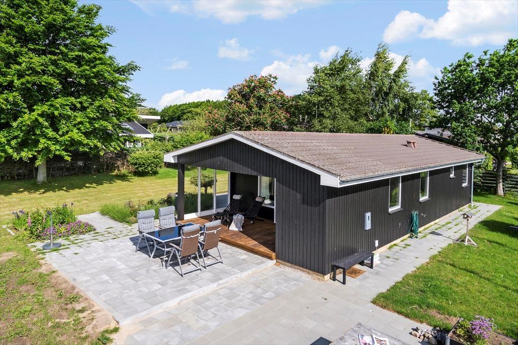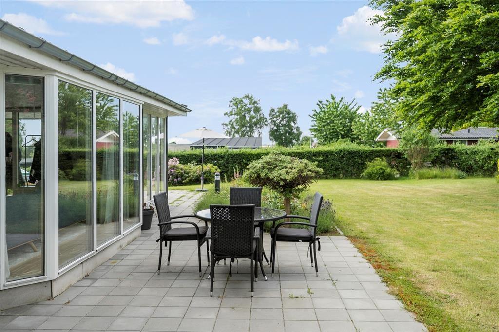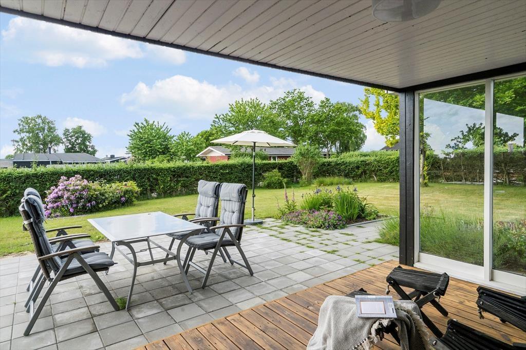 Huset har en åben terrasse, hvor alle måltider kan nydes når vejret tillader det. Her kan man også sidde og holde øje med børnene, når de lejer i haven. Når vejret ændrer sig er der en overdækket terrasse, så aftensmåltidet kan nydes ude – det meste af året. Grunden er stor og indbyder til udendørs spil og hygge. Både den åbne terrasse samt den overdækkede terrasse vender ud mod haven og gør, at man kan nyde synet af græsset og blomsterne næsten hele året. Fra haven er der også kig til havet.