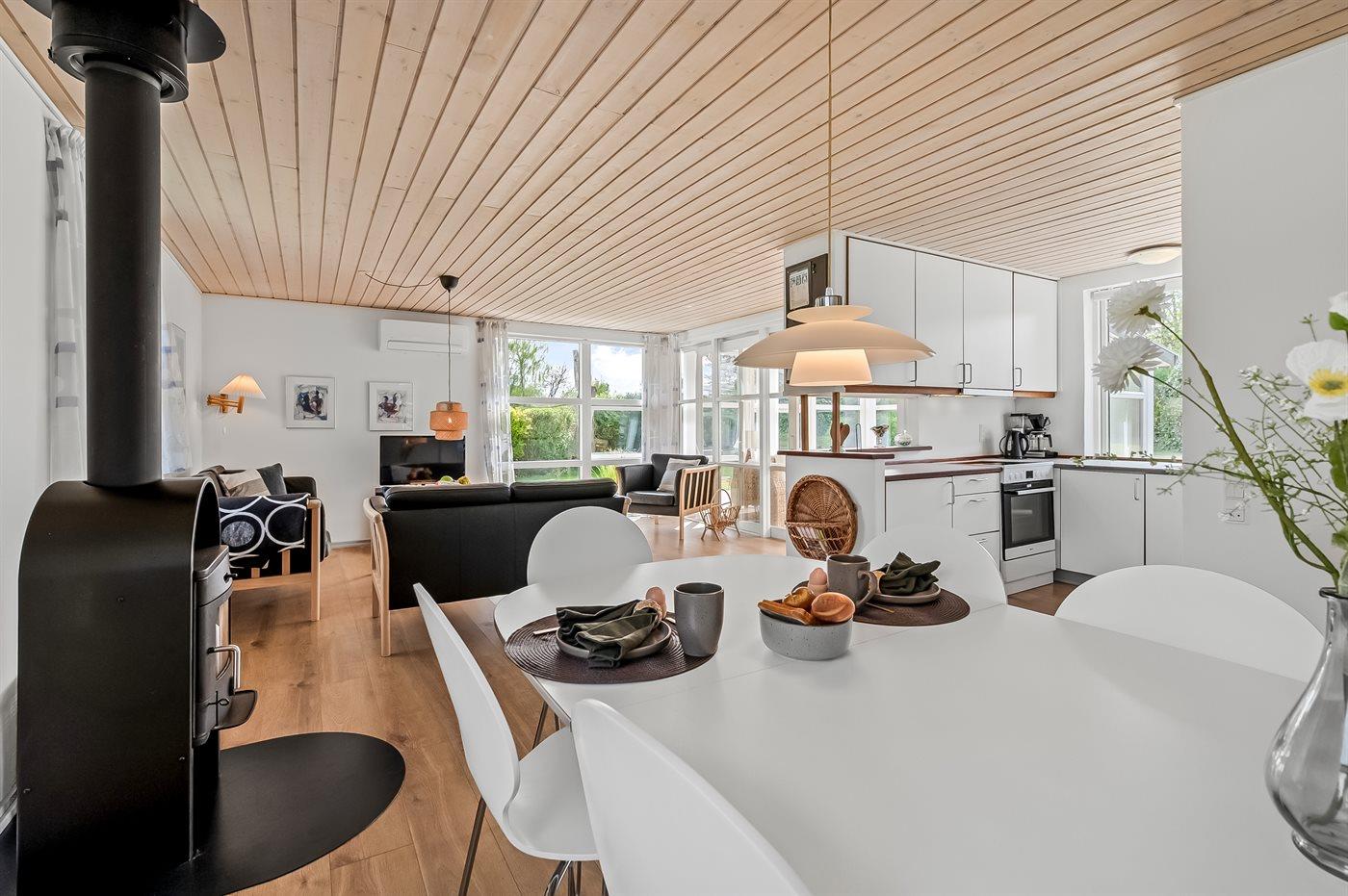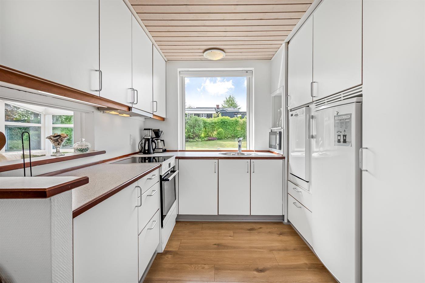 Køkkenet er udstyret med 1 køleskab. Der er 4 keramiske kogeplader, varmluftovn, mikrobølgeovn samt opvaskemaskine.