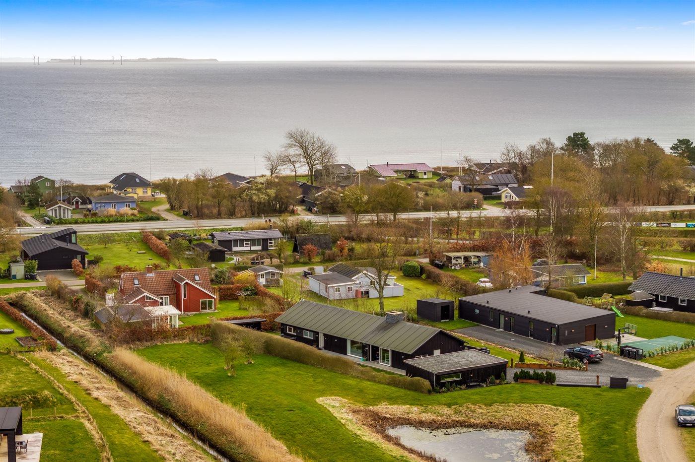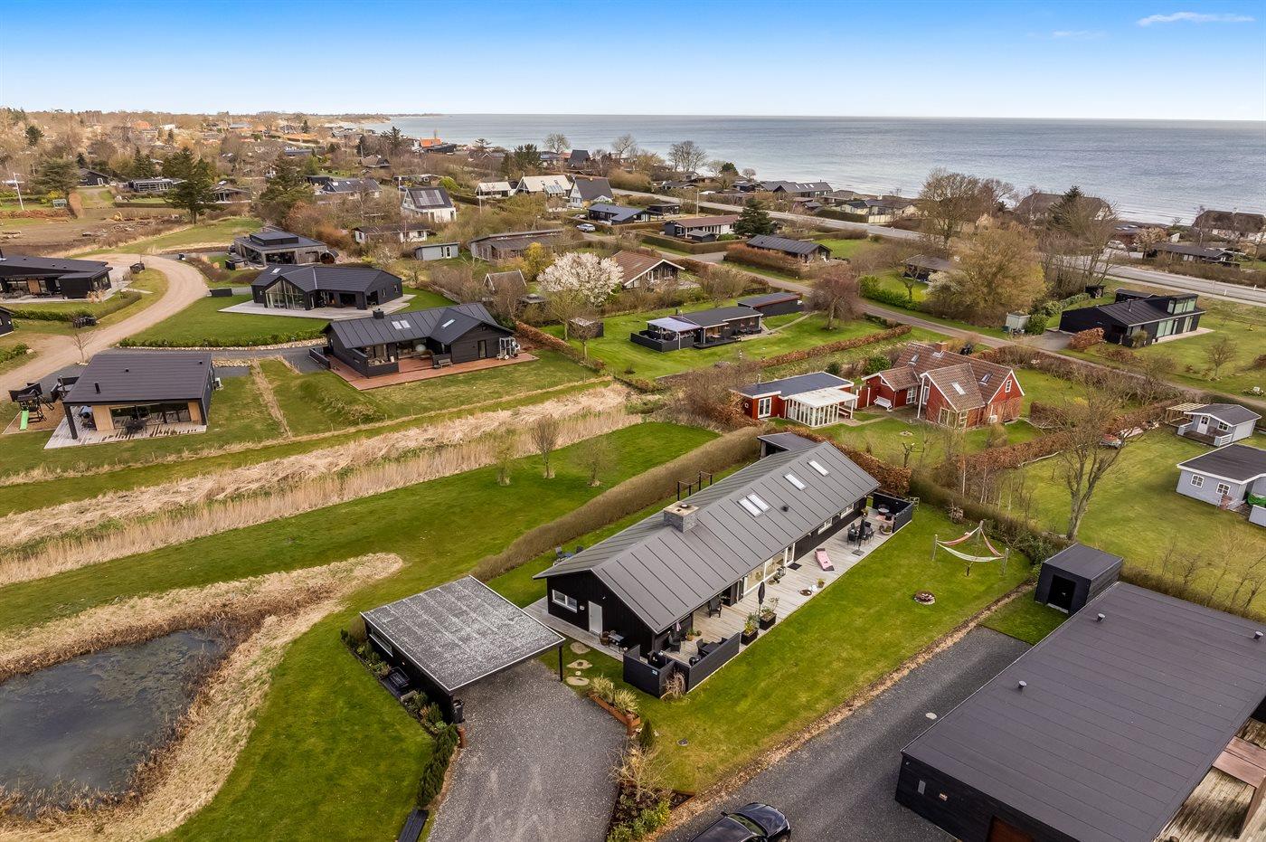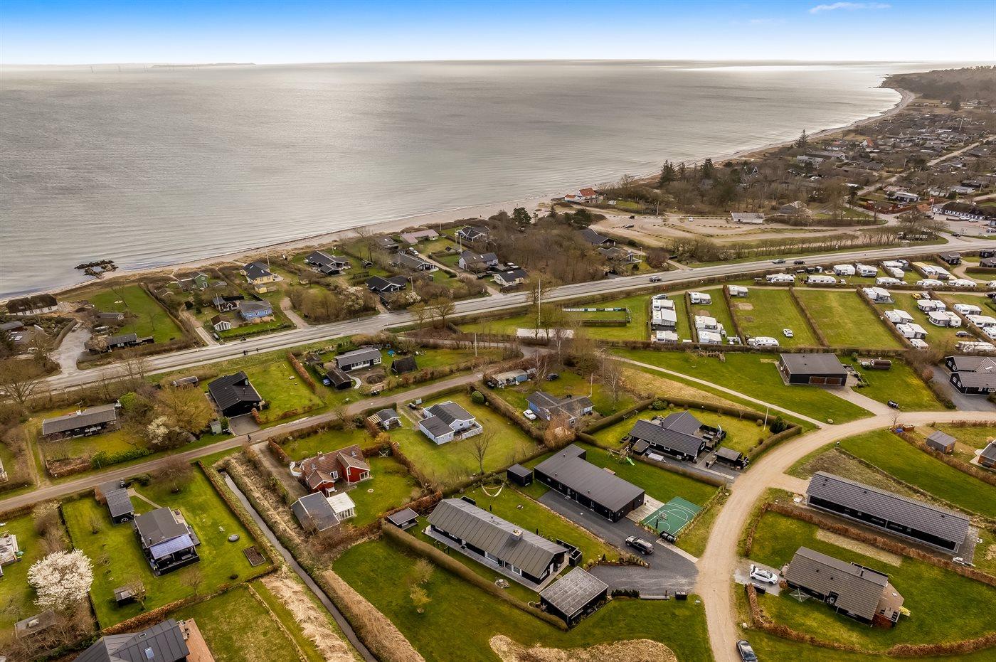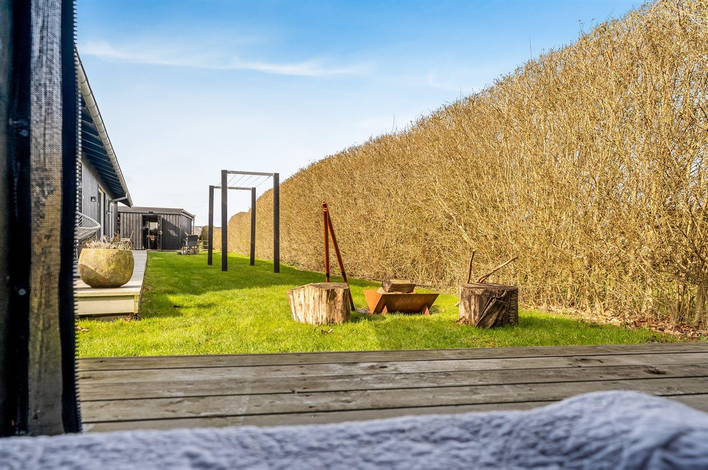 Ferieboligen er beliggende på en 820 m² stor havegrund. Der er 300 m til havet. Der er 2000 m til fjorden. Der er en sø i en afstand af 25 m. Nærmeste forretning er beliggende i en afstand af 1000 m. Der er en golfbane i en afstand af 5000 m. Til ferieboligen hører åbent terrasseareal. Desuden er der overdækket terrasse. Der ligger en legeplads i en afstand af 300 m. Bålsted. Shelter. Udendørs bruser. På lune aftener sørger en udendørs pejs for hyggelig stemning. Grill til rådighed. Der er carport til rådighed. Der er installeret stik til opladning af elbil. Type 2 stik. Med 11 kW ladeeffekt. Parkering ved ferieboligen.