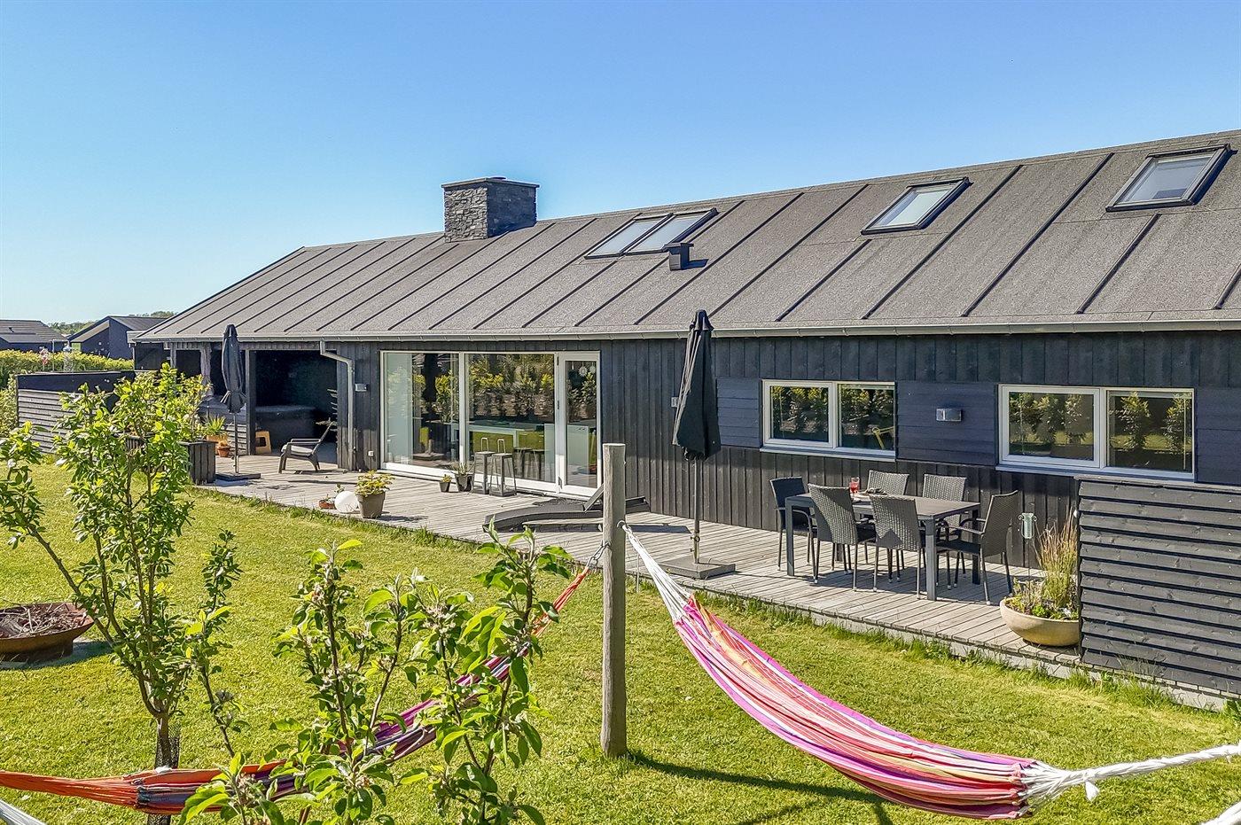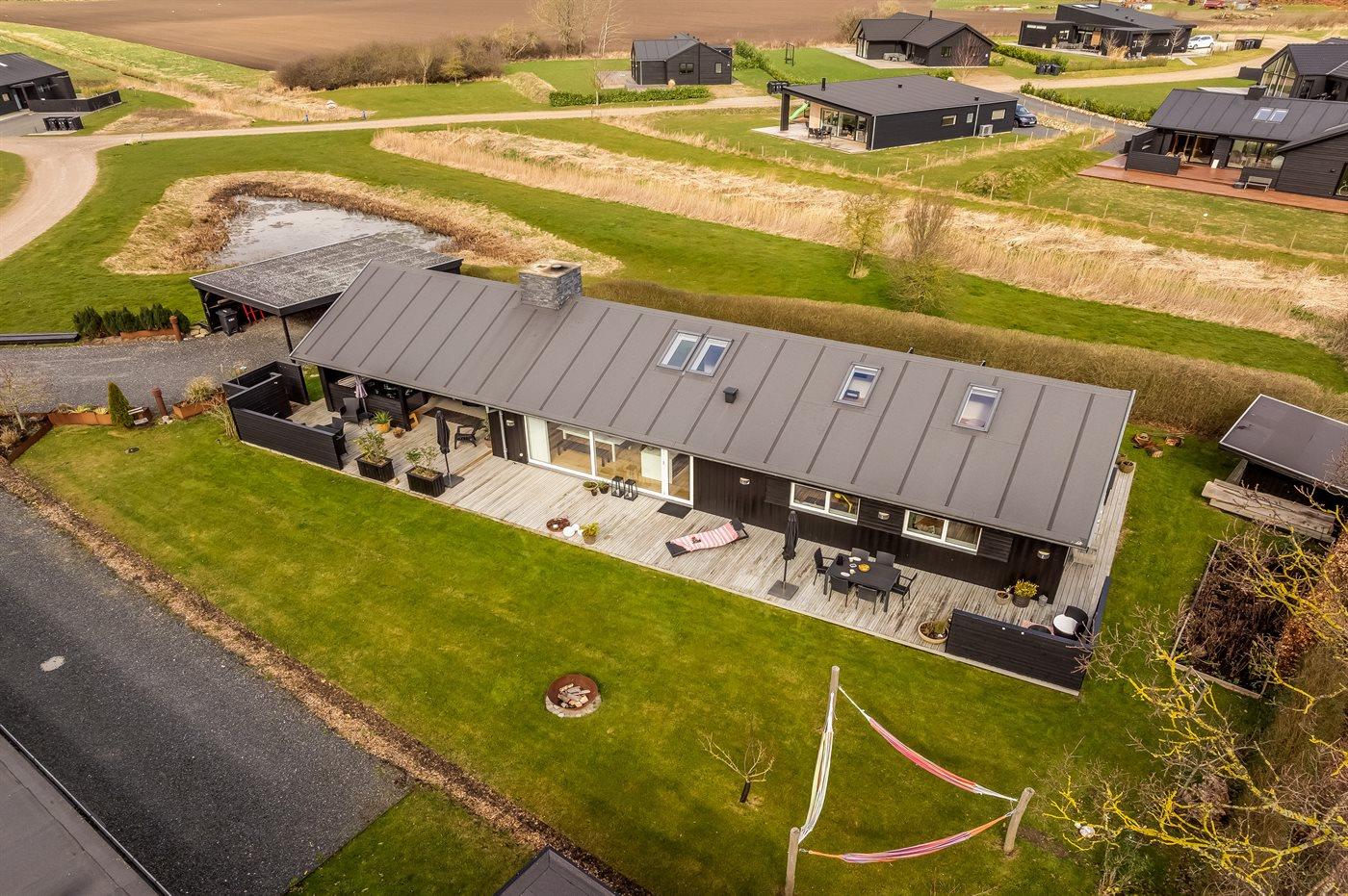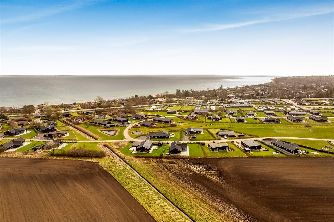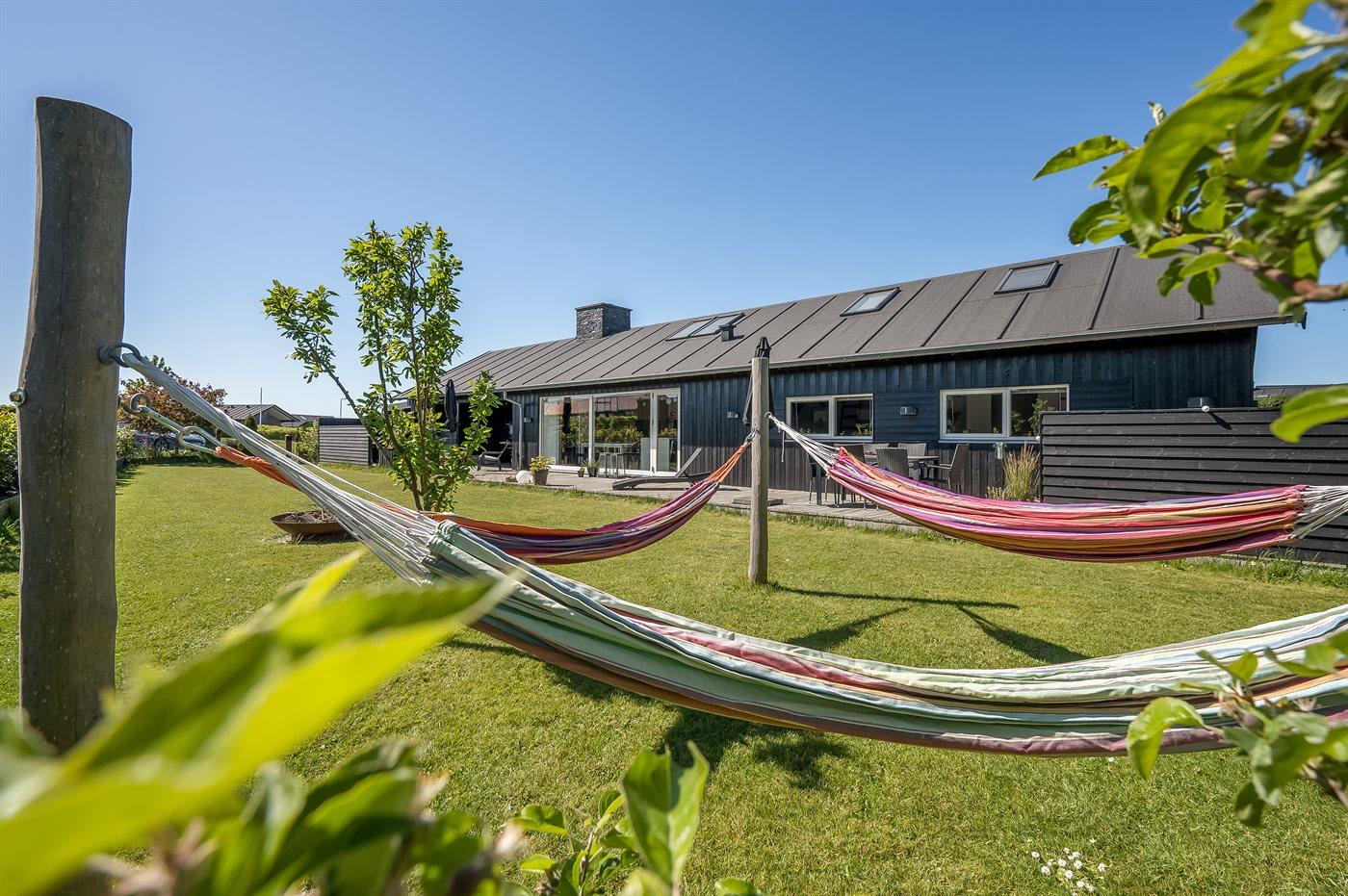 Ferieboligen er beliggende på en 820 m² stor havegrund. Der er 300 m til havet. Der er 2000 m til fjorden. Der er en sø i en afstand af 25 m. Nærmeste forretning er beliggende i en afstand af 1000 m. Der er en golfbane i en afstand af 5000 m. Til ferieboligen hører åbent terrasseareal. Desuden er der overdækket terrasse. Der ligger en legeplads i en afstand af 300 m. Bålsted. Shelter. Udendørs bruser. På lune aftener sørger en udendørs pejs for hyggelig stemning. Grill til rådighed. Der er carport til rådighed. Der er installeret stik til opladning af elbil. Type 2 stik. Med 11 kW ladeeffekt. Parkering ved ferieboligen.