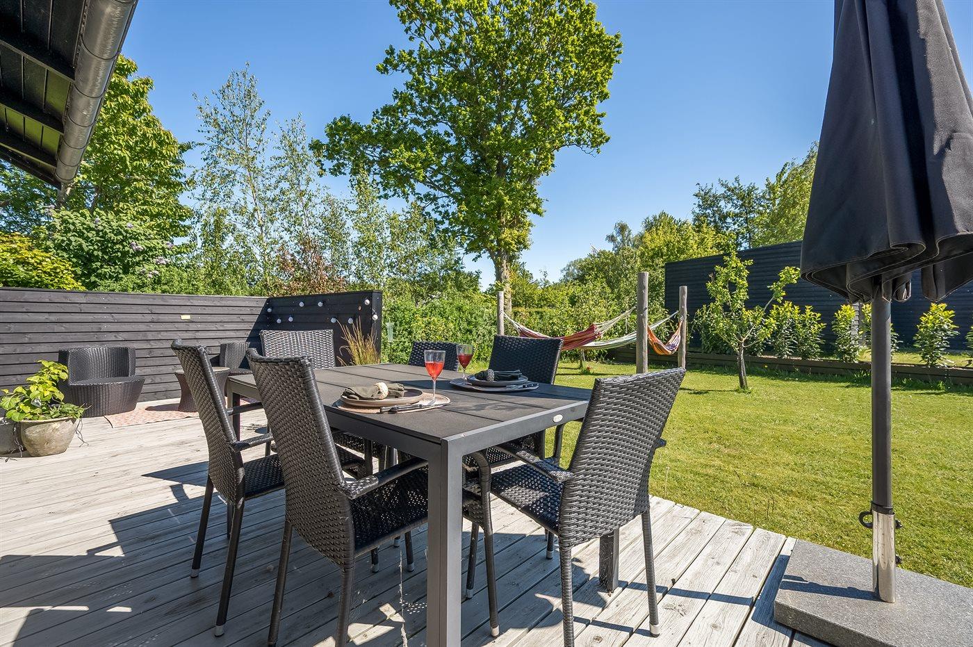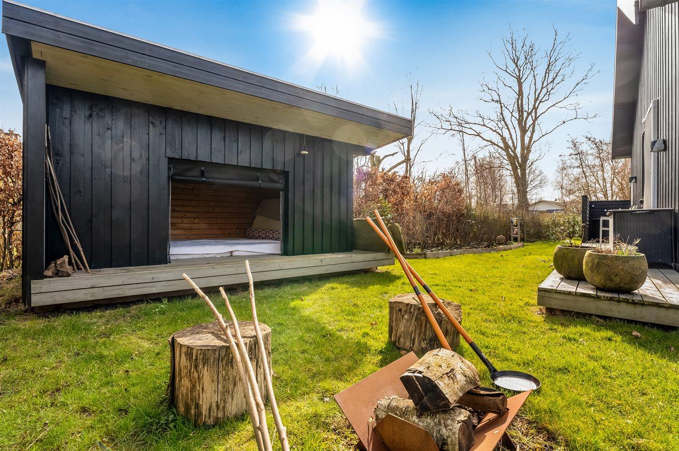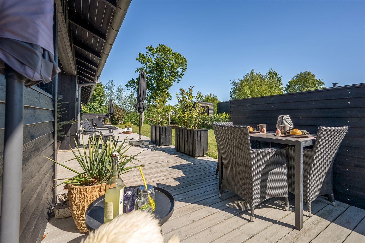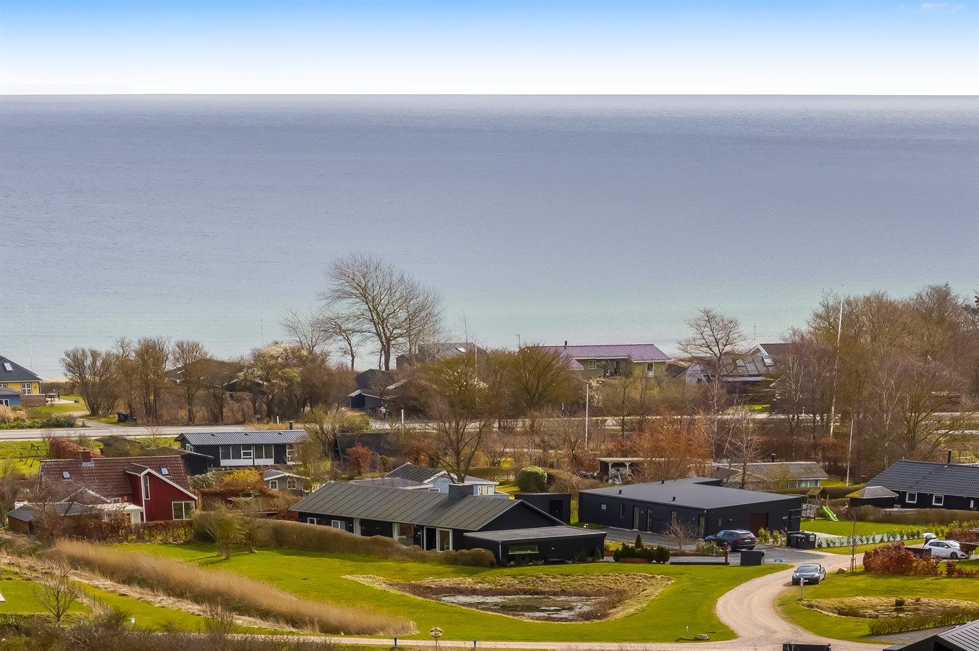 Ferieboligen er beliggende på en 820 m² stor havegrund. Der er 300 m til havet. Der er 2000 m til fjorden. Der er en sø i en afstand af 25 m. Nærmeste forretning er beliggende i en afstand af 1000 m. Der er en golfbane i en afstand af 5000 m. Til ferieboligen hører åbent terrasseareal. Desuden er der overdækket terrasse. Der ligger en legeplads i en afstand af 300 m. Bålsted. Shelter. Udendørs bruser. På lune aftener sørger en udendørs pejs for hyggelig stemning. Grill til rådighed. Der er carport til rådighed. Der er installeret stik til opladning af elbil. Type 2 stik. Med 11 kW ladeeffekt. Parkering ved ferieboligen.