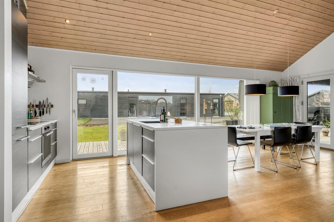 Køkkenet er udstyret med 1 køleskab. Der er 4 induktionskogeplader, varmluftovn, mikrobølgeovn samt opvaskemaskine.