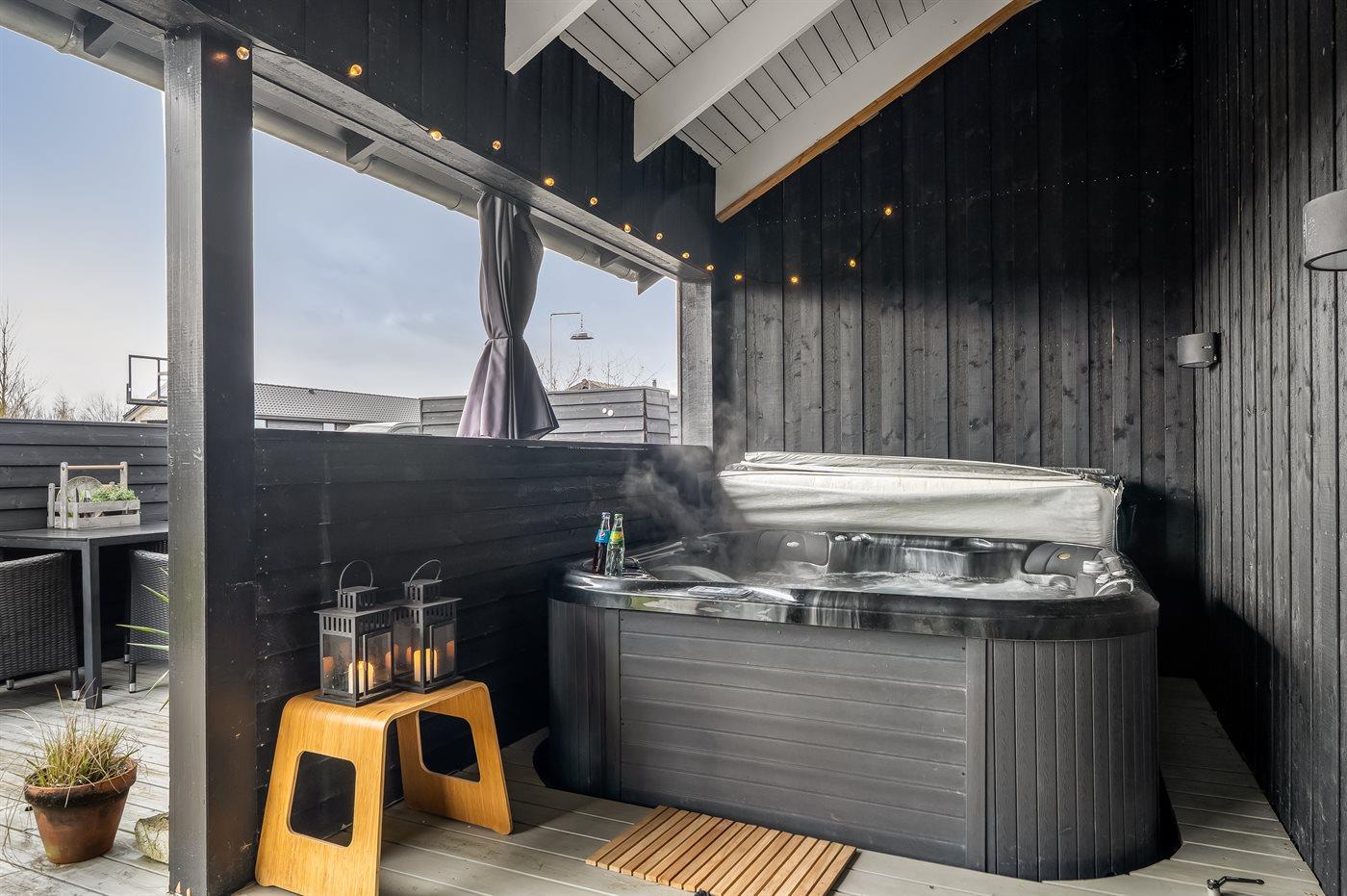 Der er mulighed for afslapning i udendørs standvandsspa til 5 personer.