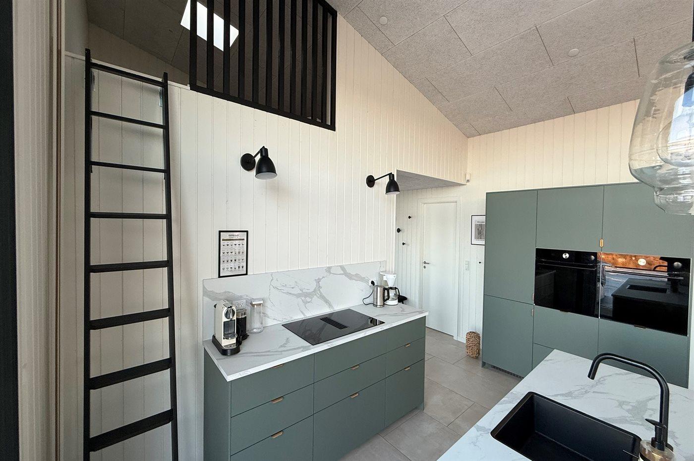 Køkkenet er udstyret med 1 køleskab. Der er 4 induktionskogeplader, 2 varmluftovne, mikrobølgeovn samt opvaskemaskine.
