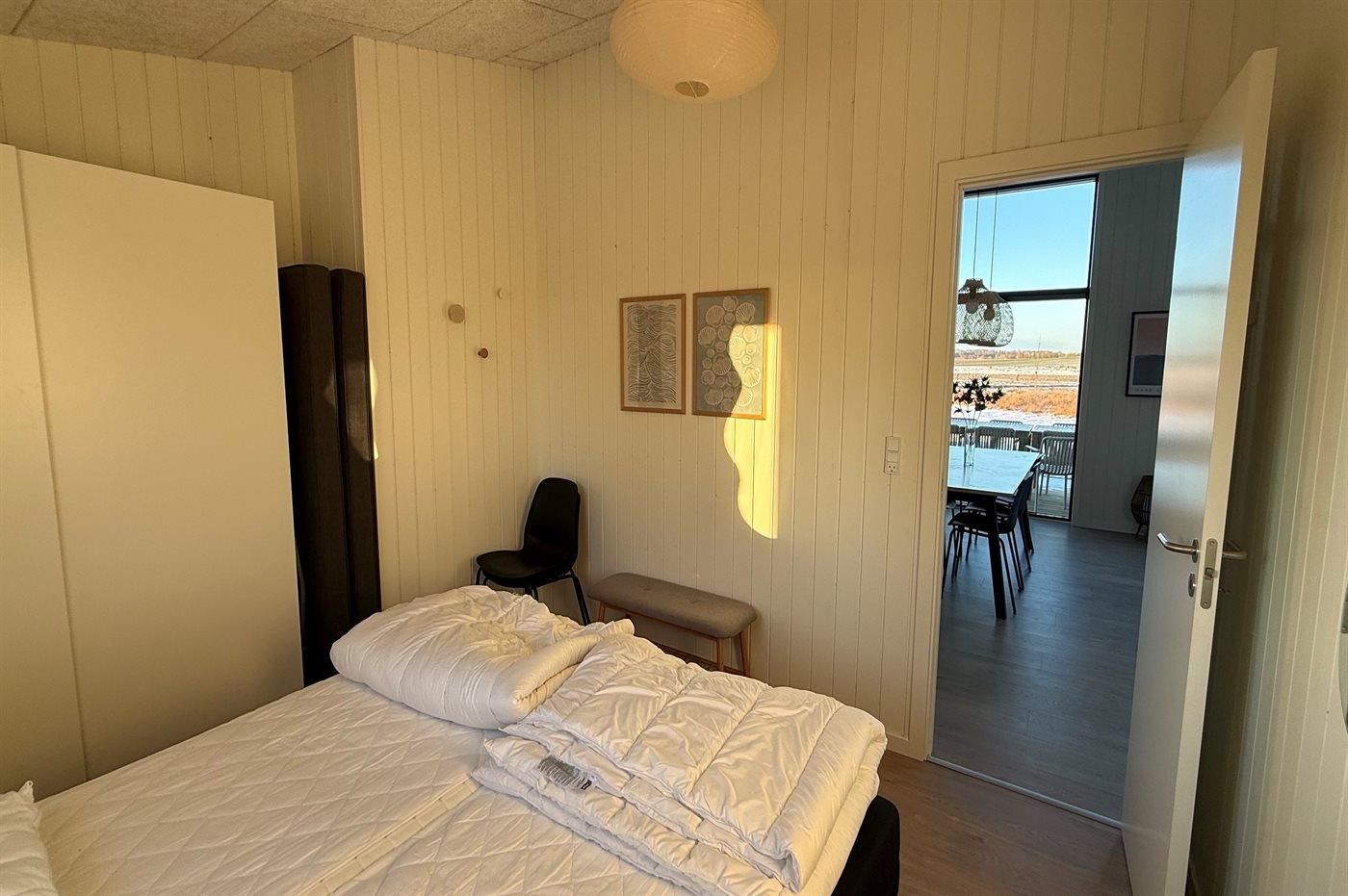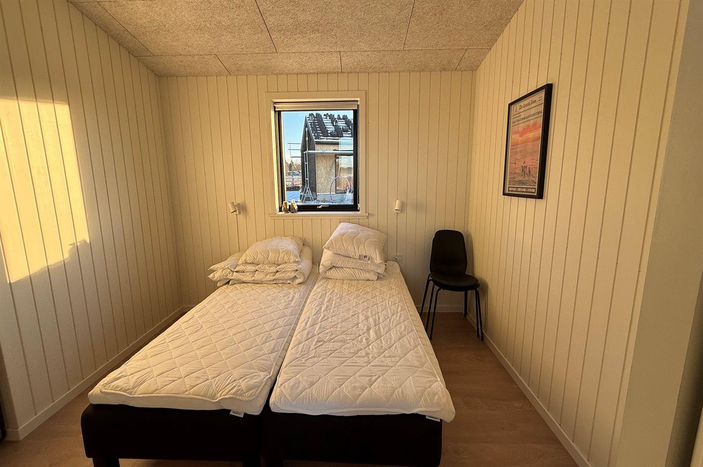 Der er i alt 4 soveværelser. Sovepladserne fordeler sig på: 12 sovepladser i enkeltsenge.- 4 af disse sovepladser befinder sig på husets hems.